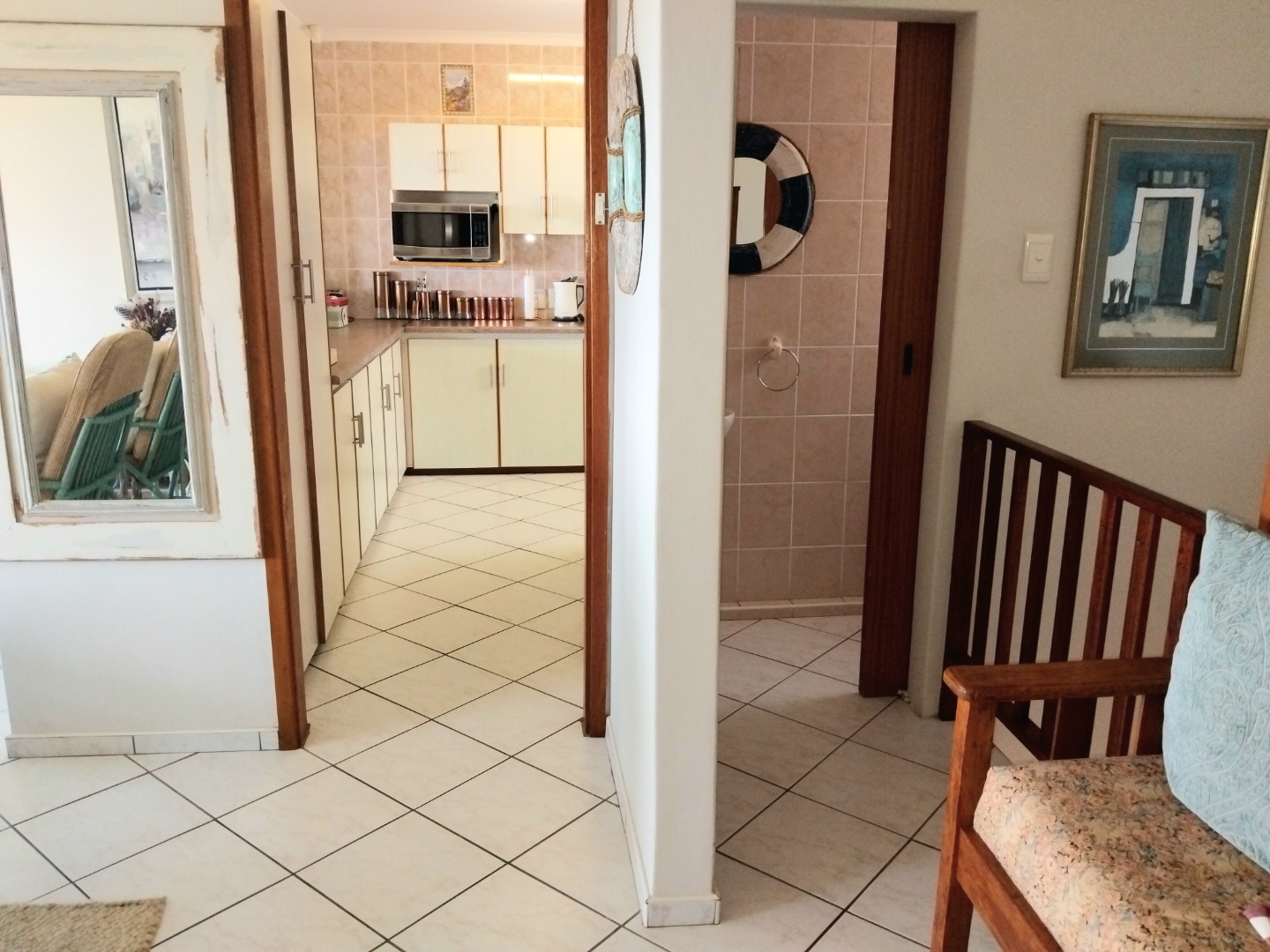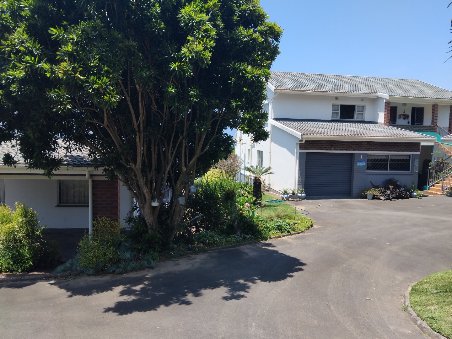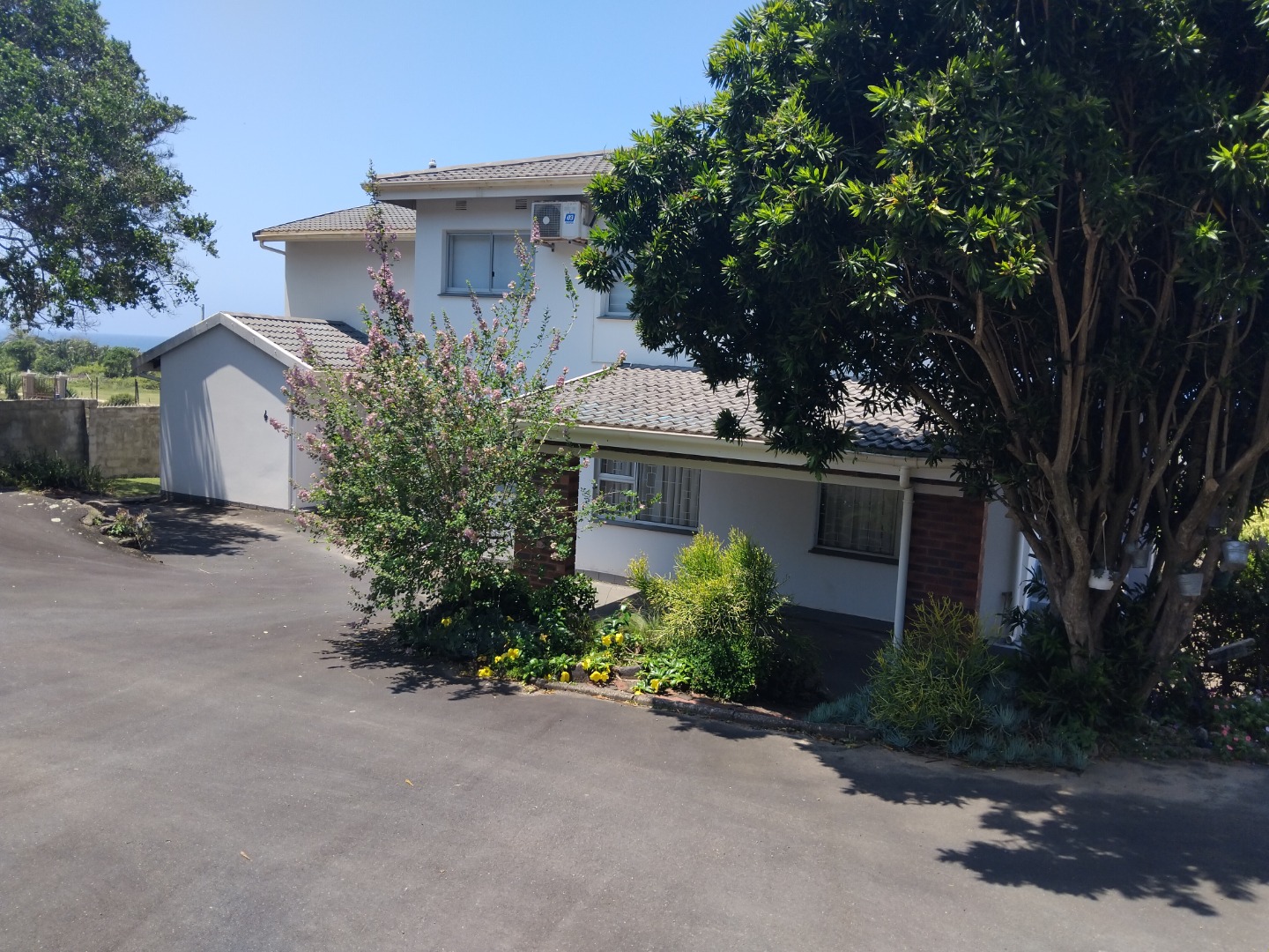 The allure extends outdoors to a private oasis, where a sparkling swimming pool beckons for refreshing dips amidst lush, well-maintained gardens. A private balcony and a charming patio provide idyllic settings for al fresco dining or simply savoring the magnificent ocean vistas that stretch to the horizon. A single garage ensures secure parking, enhancing the property's practical appeal. Ensuring peace of mind, the residence is fortified with an alarm system, access gate, and burglar bars, all within a totally walled perimeter. Practical amenities include water tanks, contributing to sustainable living in this coastal haven.
