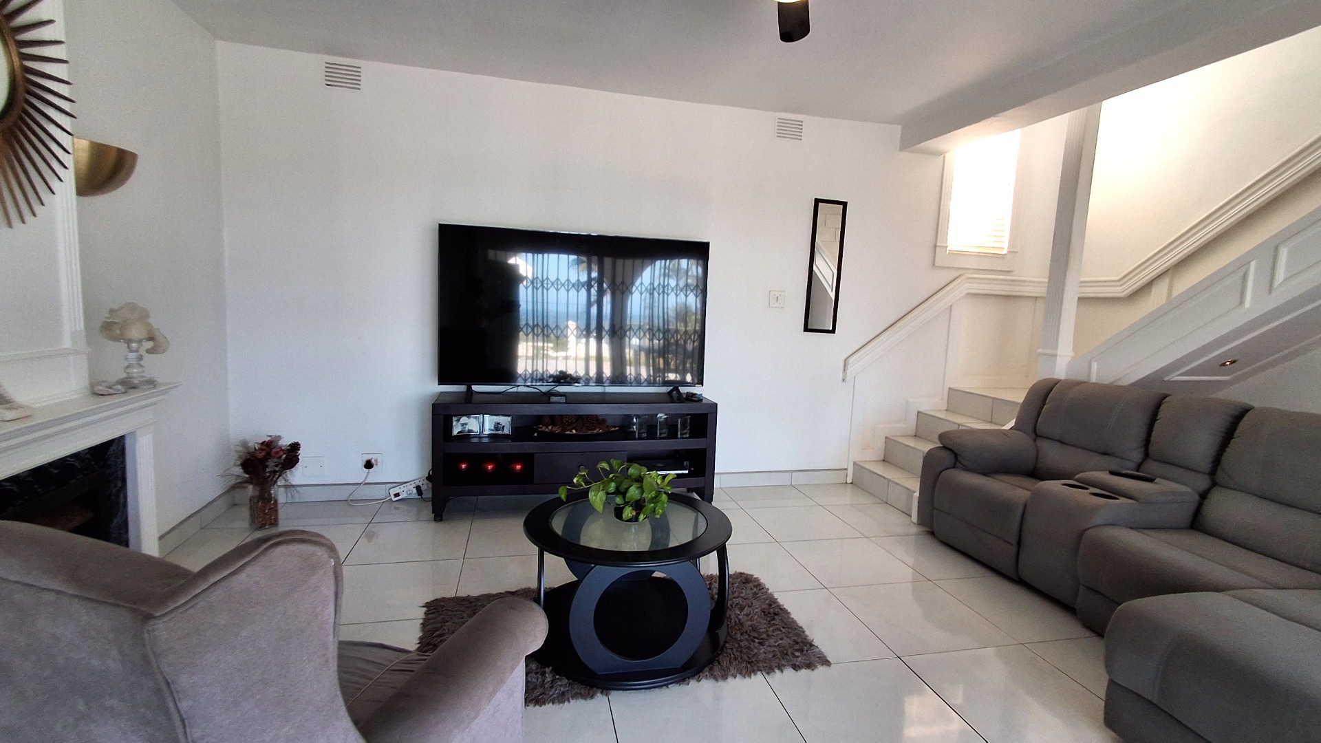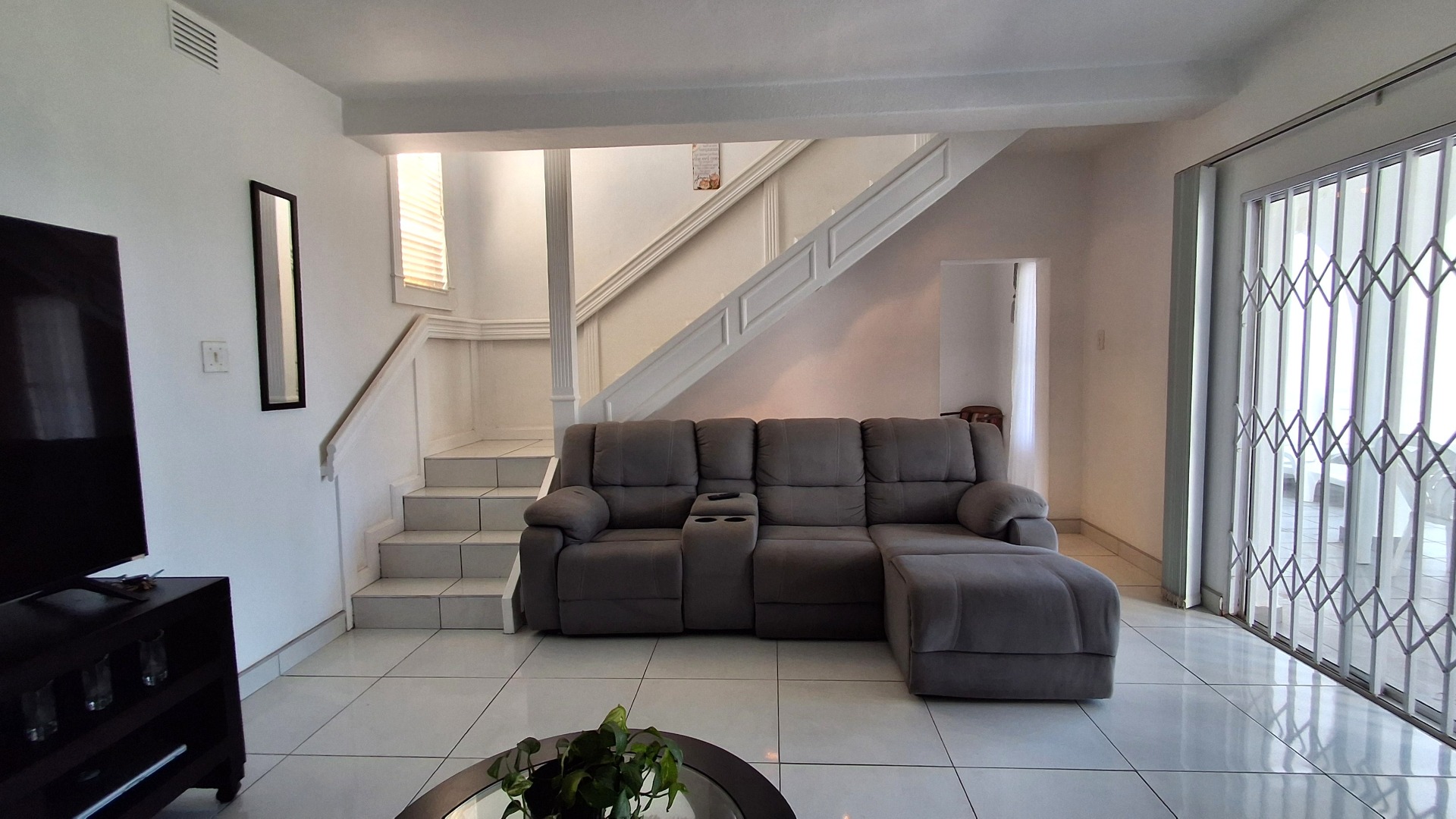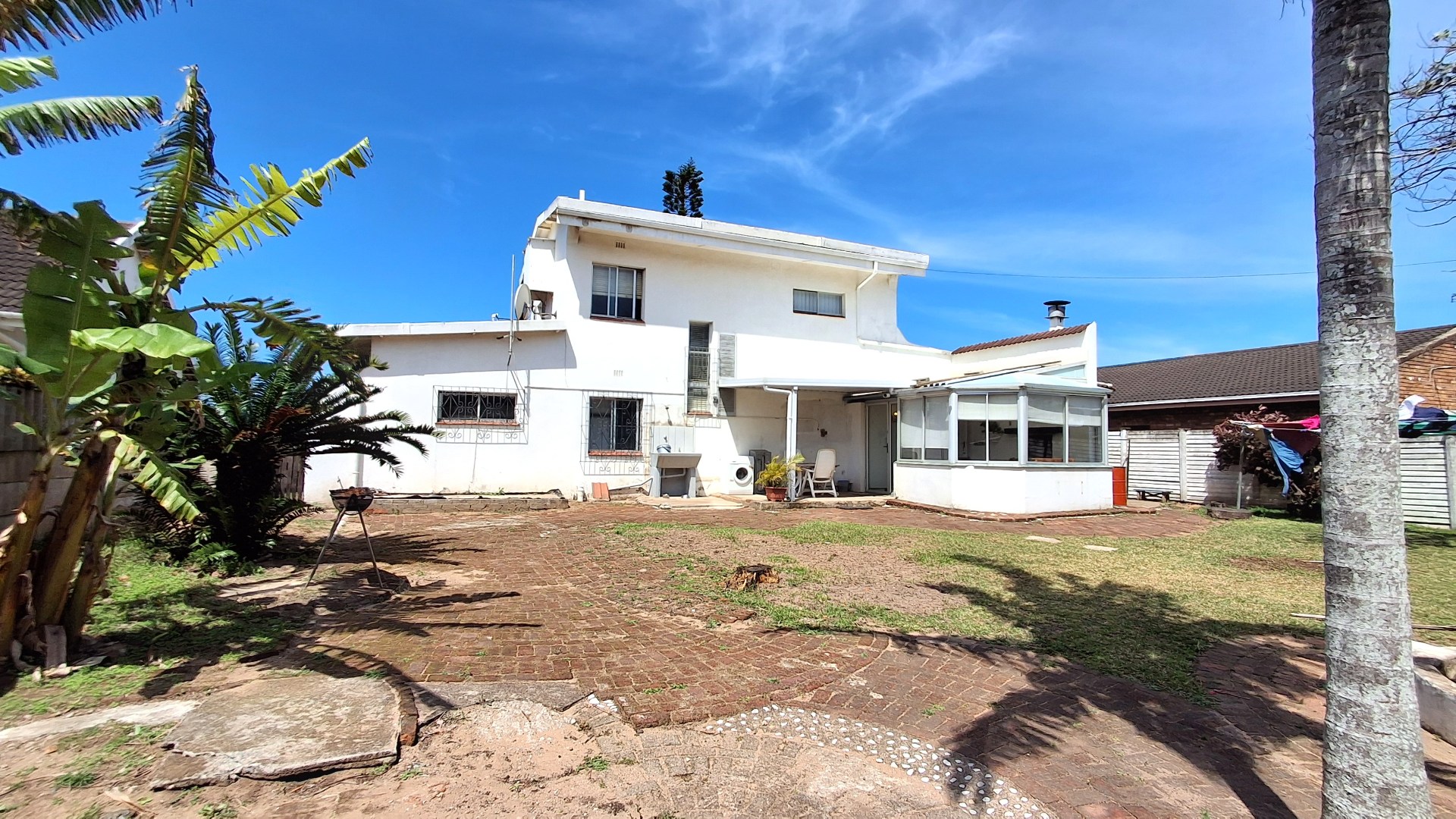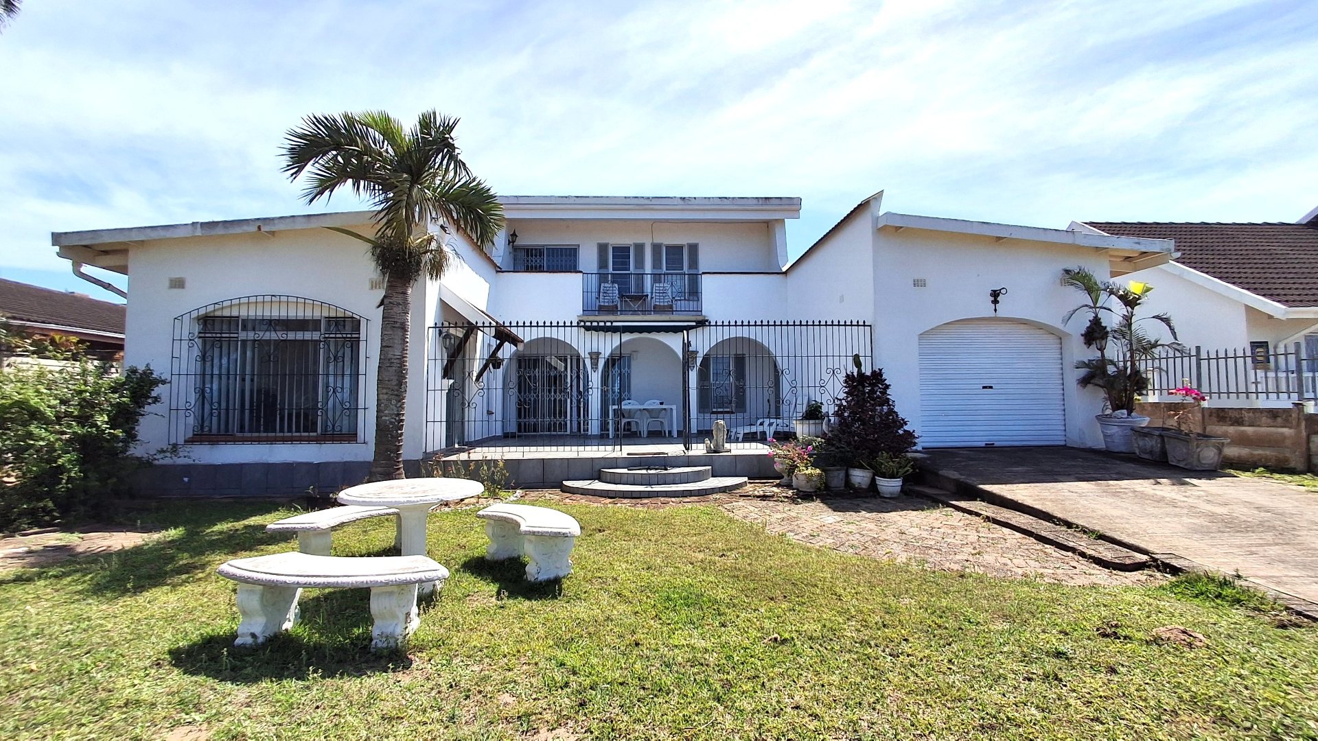 Discover this charming two-story residence in the coastal suburb of Beacon Rocks, Uvongo, offering a blend of Mediterranean-style architecture and modern living. The property boasts a generous 809 sqm erf, presenting ample opportunity for landscaping and outdoor enjoyment. With its distinctive arched entryways, front balcony, and attached garage. this home offers immediate kerb appeal and a welcoming facade, complemented by security features such as a front gate and window bars.