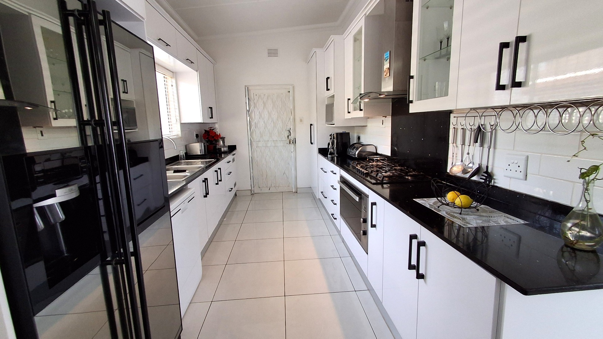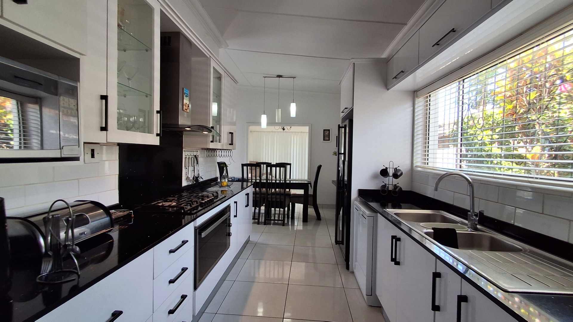 Step inside to find a thoughtfully designed interior featuring two comfortable lounges and a dedicated dining room, providing versatile spaces for relaxation and entertaining. The modern galley-style kitchen is a highlight, equipped with sleek white cabinetry, contrasting black countertops, and integrated appliances, all set against a backdrop of tiled flooring and abundant natural light. An open-plan layout enhances the flow between living areas, creating an inviting atmosphere.