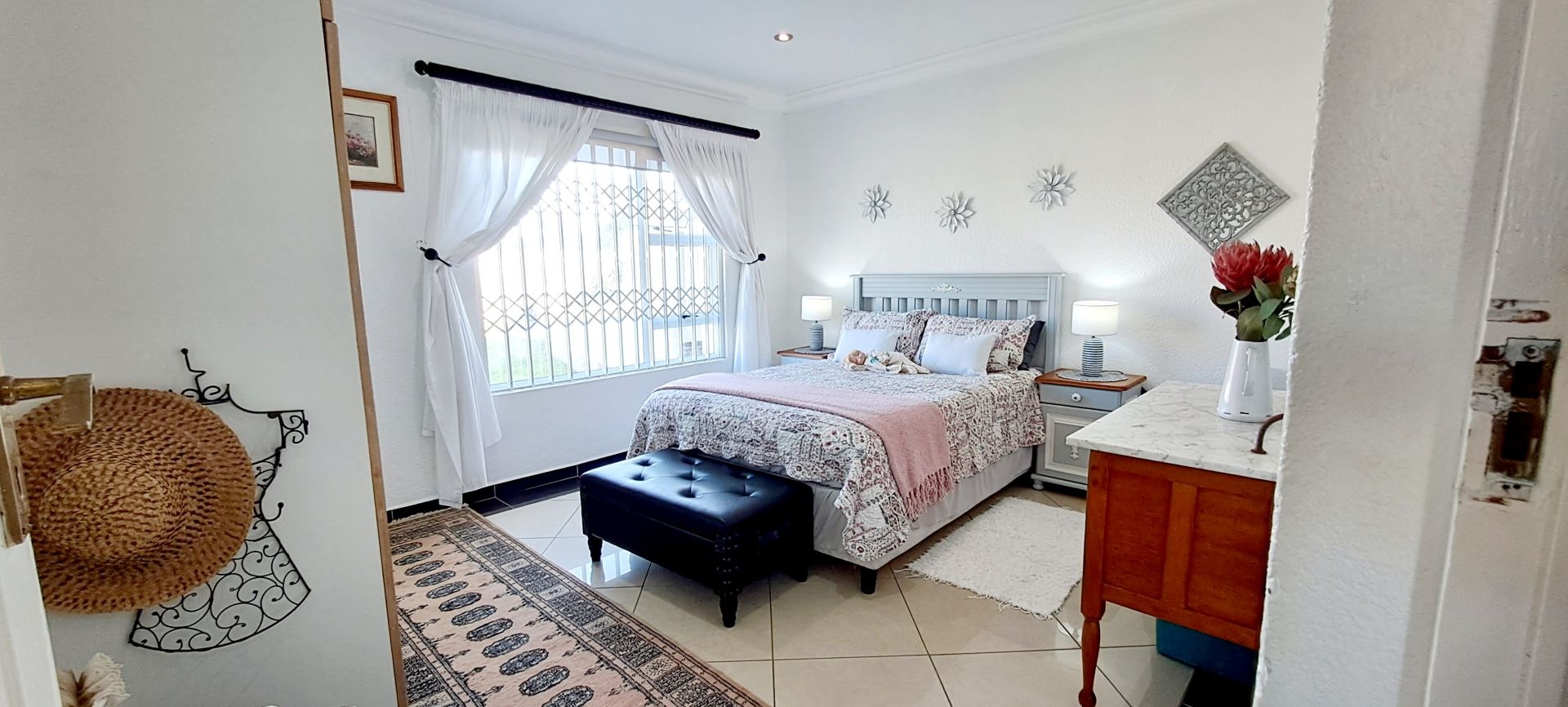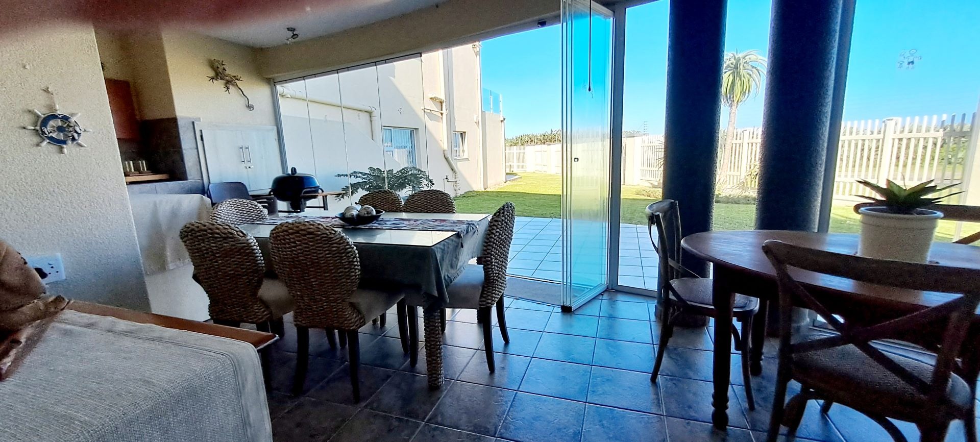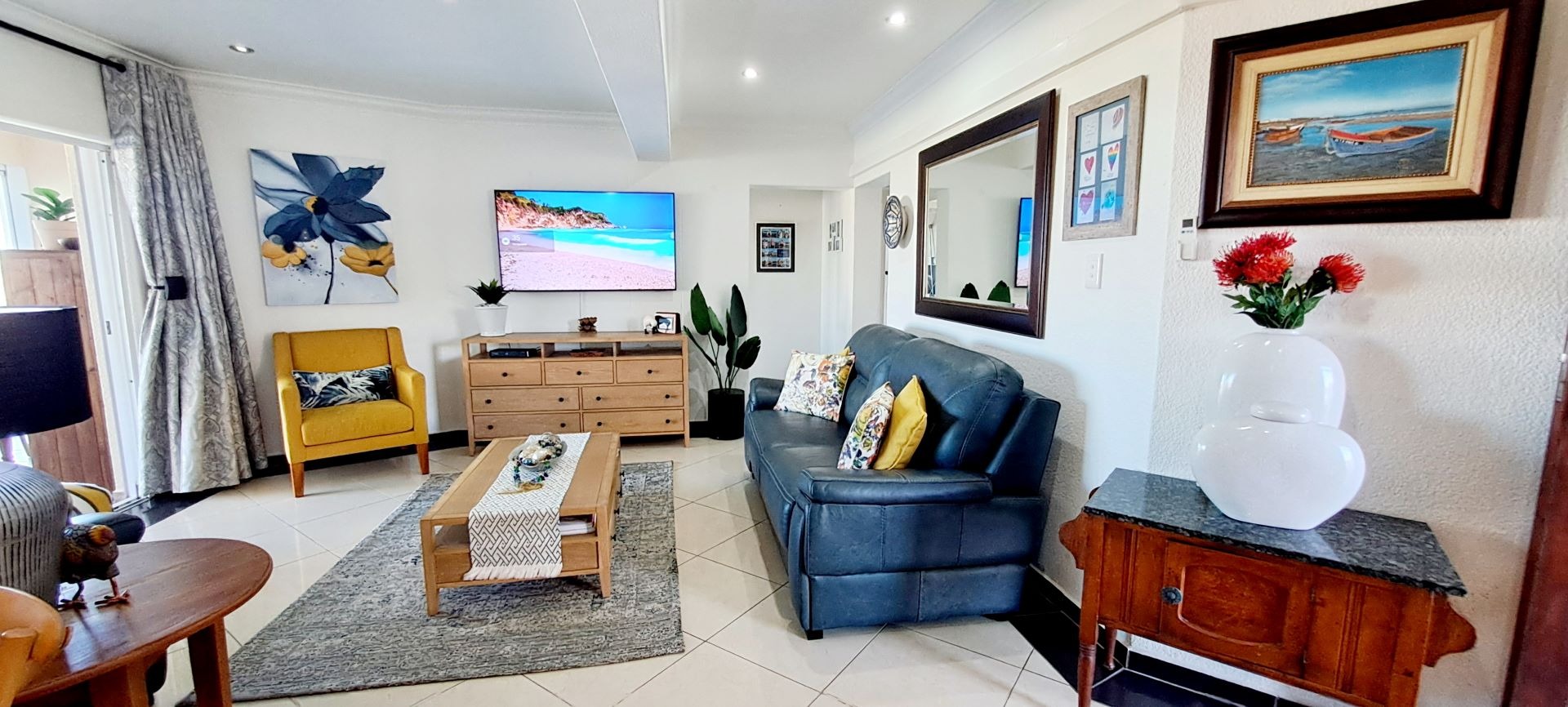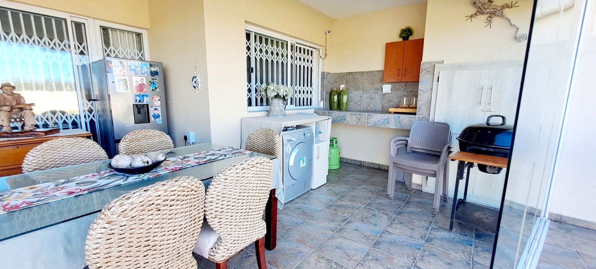 Outdoor amenities include a private swimming pool with a paved sundeck and a built-in braai, perfect for entertaining. The property provides a single garage and an additional parking space. As part of a secure complex, residents benefit from electric fencing, an access gate, burglar bars, and security gates. A battery inverter ensures power backup, and the home is wheelchair friendly. Enjoy sea views from this waterfront property.