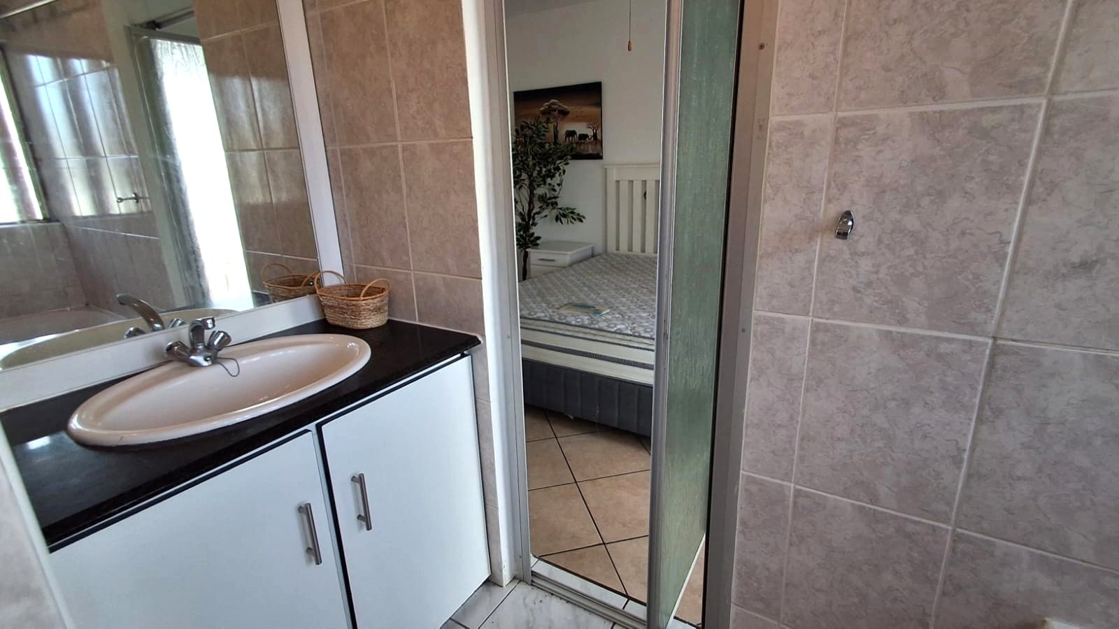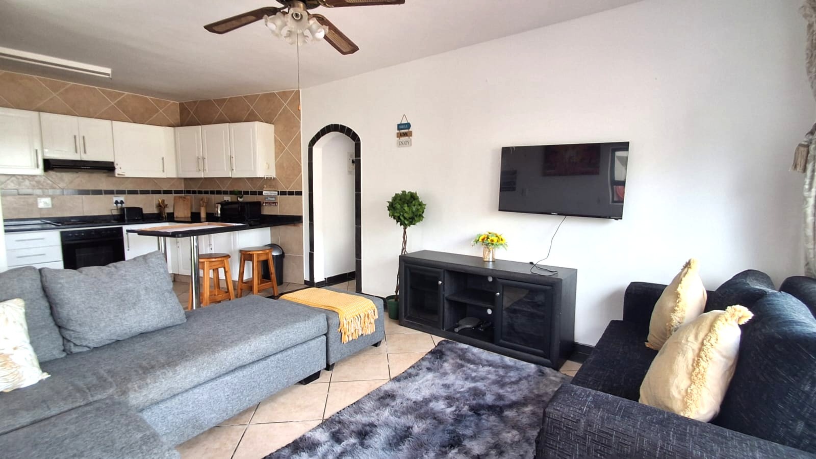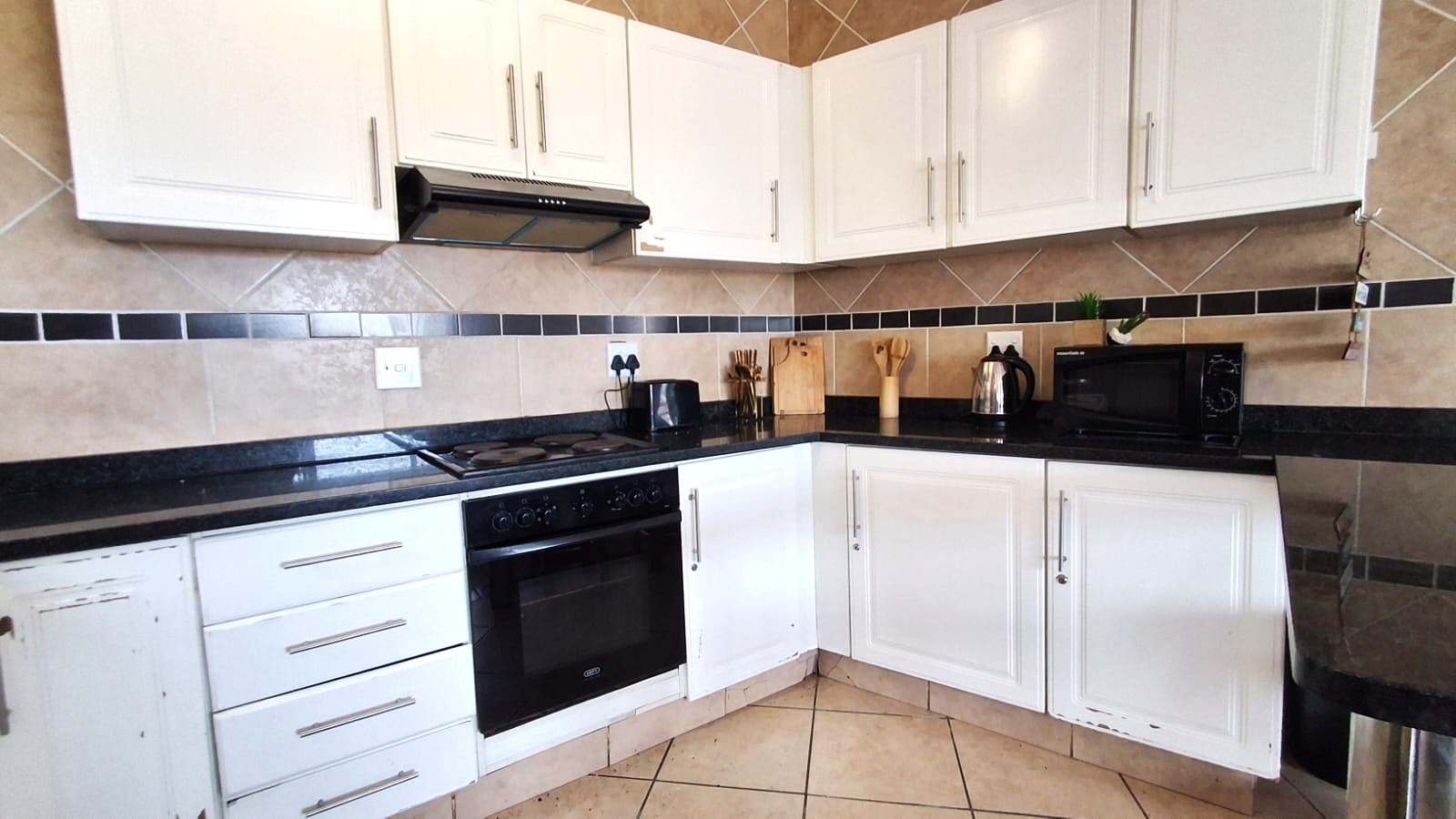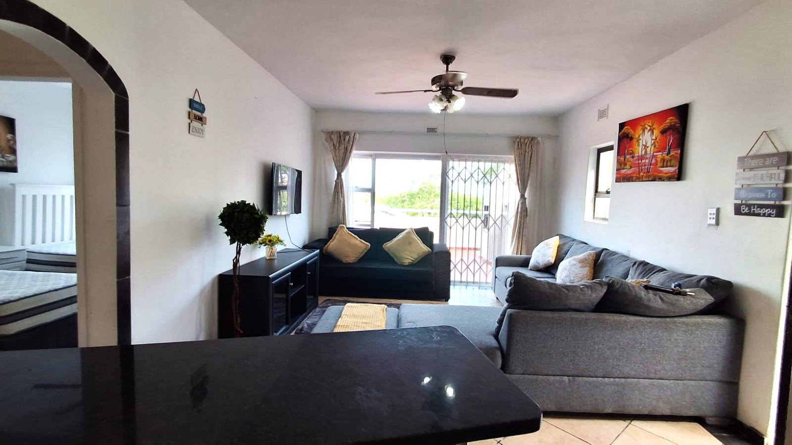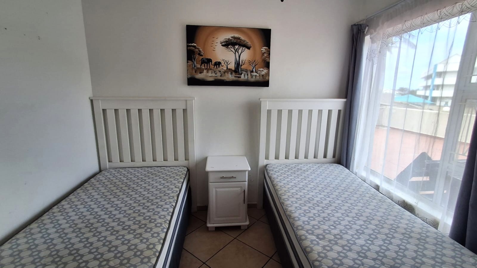 Discover this inviting 2-bedroom, 2-bathroom apartment located in a secure gated community in Manaba Beach, Margate. This residential sale offers a comfortable 142 sqm of living space, designed for modern coastal living. The property features a unique terraced architectural style with multiple balconies, providing ample outdoor enjoyment and a well-maintained green lawn area. Step inside to an open-plan living area, complete with a spacious lounge and tiled flooring throughout, ensuring easy maintenance. The kitchen is functional and well-equipped, featuring white cabinetry, black countertops, a double sink, and modern appliances including a stove/oven and stainless steel refrigerator. Natural light fills the space, complemented by a ceiling fan for comfort. Both bedrooms are designed for relaxation, offering bright and tidy spaces with comfortable beds and tiled floors. The main bedroom includes a ceiling fan and air conditioning for optimal climate control. The two bathrooms are conveniently located to serve the residents and guests. Outside, residents can enjoy a clean, inviting swimming pool with ample leisure space, perfect for unwinding. The property boasts stunning panoramic sea views from an elevated position, with the beach and breaking waves visible, making it an ideal holiday home. Security is enhanced with an access gate and security bars on some windows and doors, providing peace of mind. Additional features include one parking bay and water tanks for sustainability.