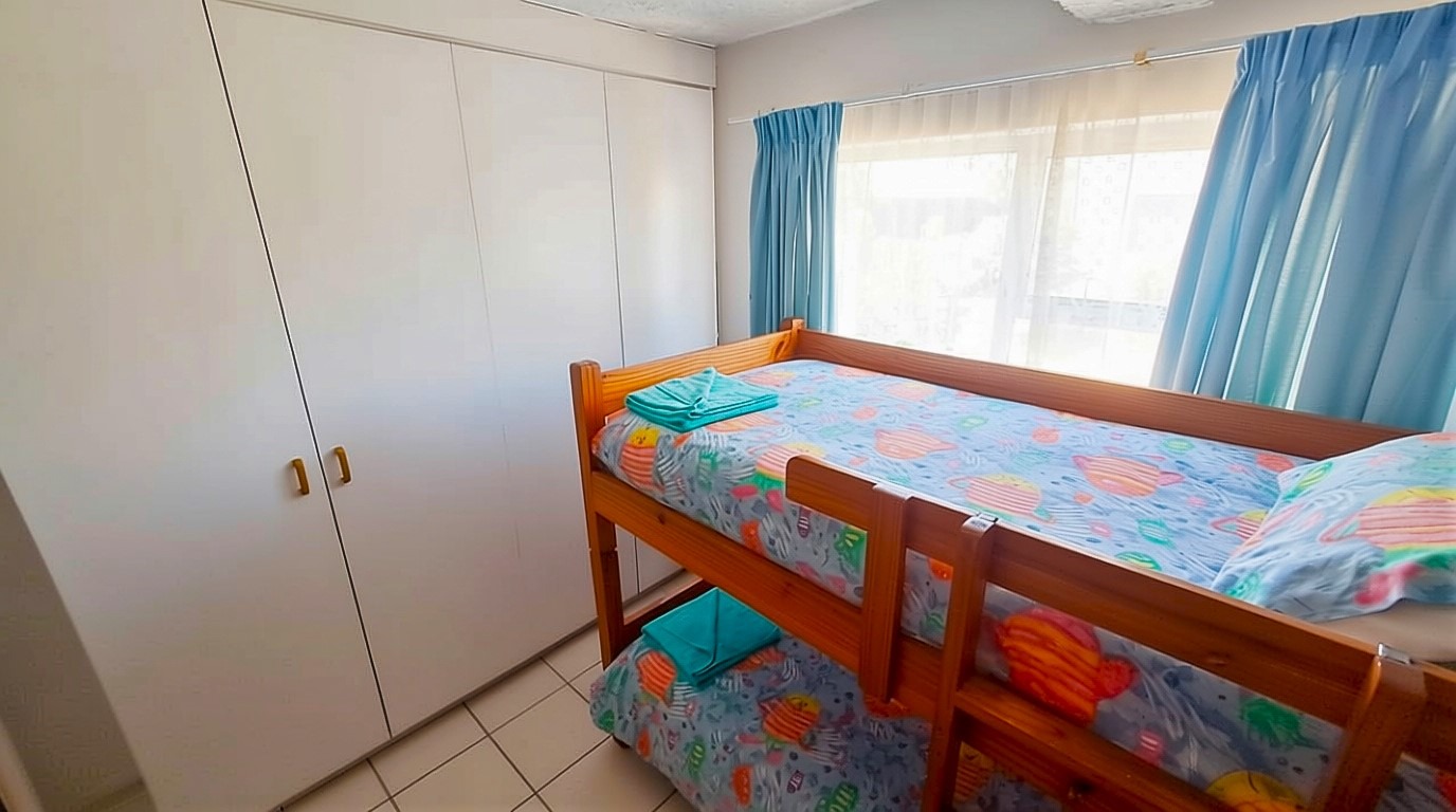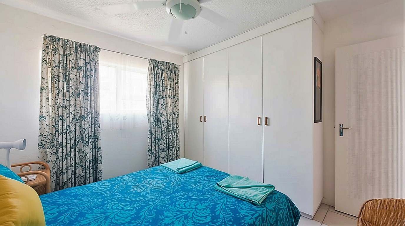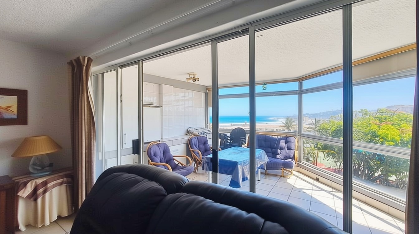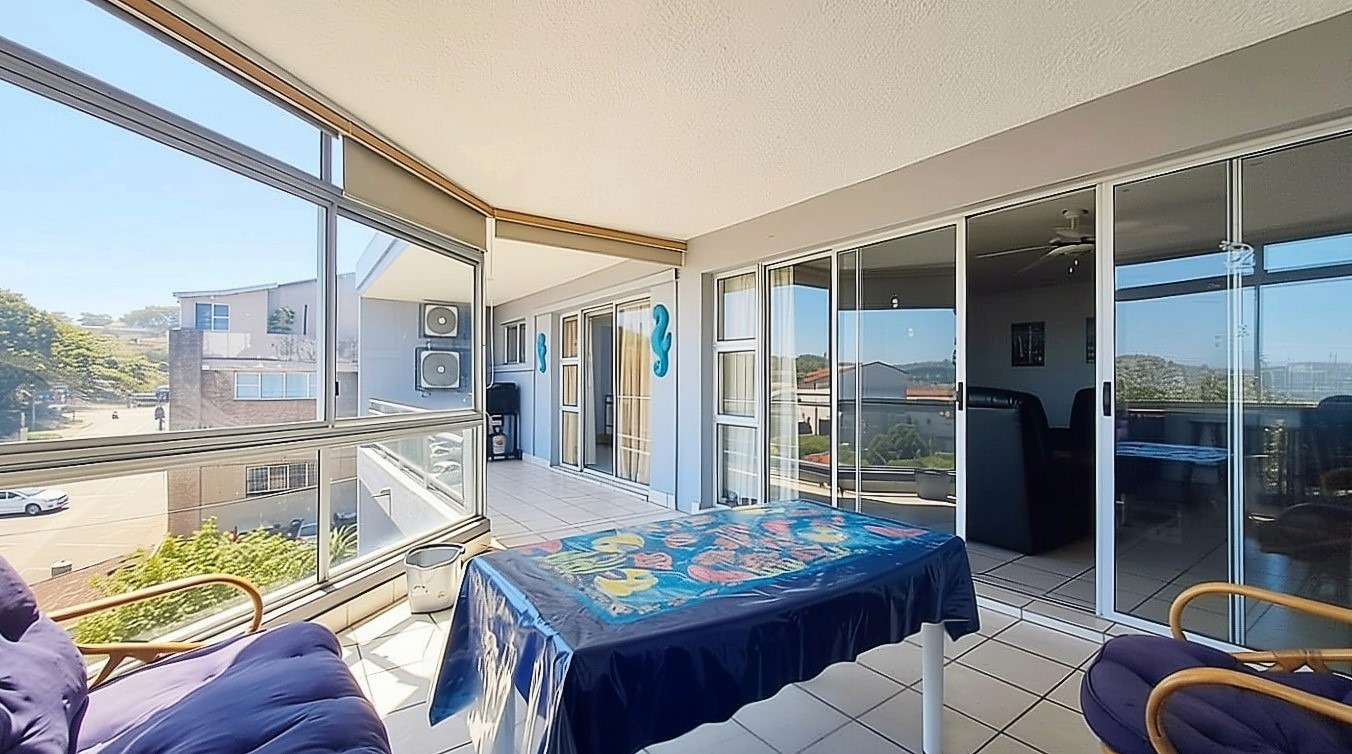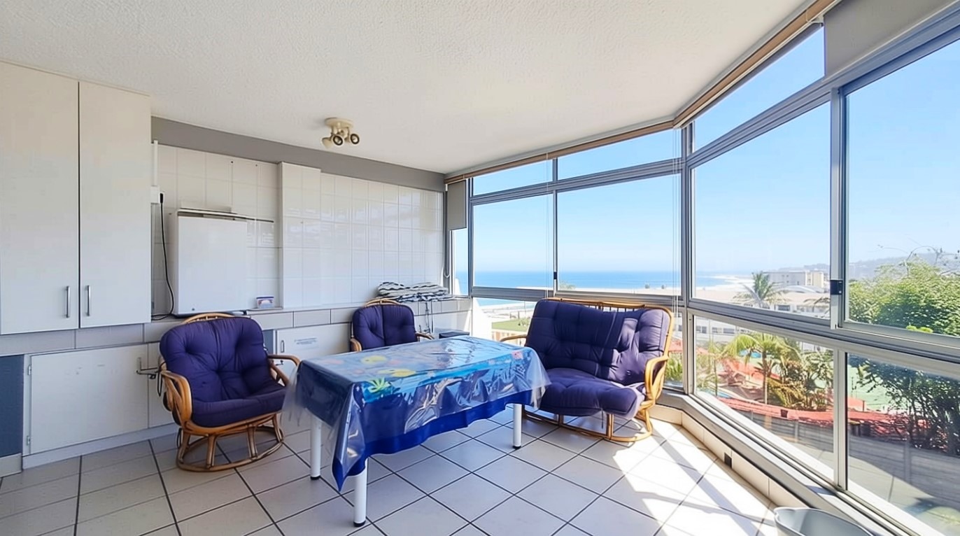 A highlight of this residence is the expansive enclosed patio, which serves as an all-weather sunroom. This versatile space boasts large windows and sliding doors, offering uninterrupted views of the ocean and beach, creating an ideal setting for relaxation or dining. Residents also benefit from a communal swimming pool and braai area, enhancing the outdoor living experience.