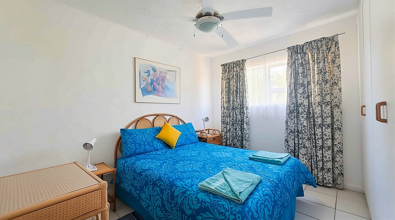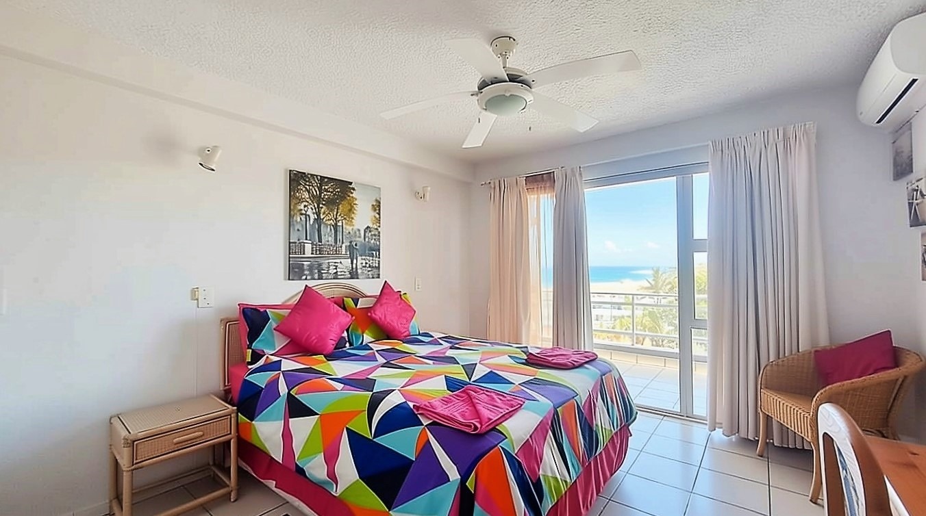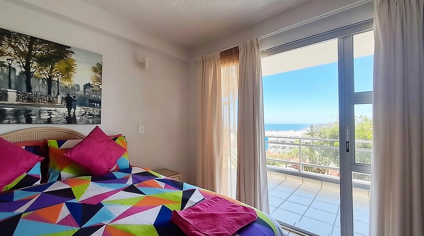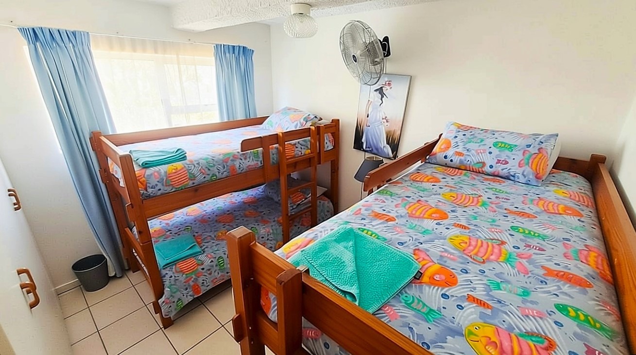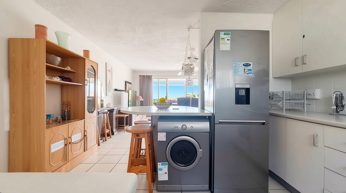A highlight of this residence is the expansive enclosed patio, which serves as an all-weather sunroom. This versatile space boasts large windows and sliding doors, offering uninterrupted views of the ocean and beach, creating an ideal setting for relaxation or dining. Residents also benefit from a communal swimming pool and braai area, enhancing the outdoor living experience.