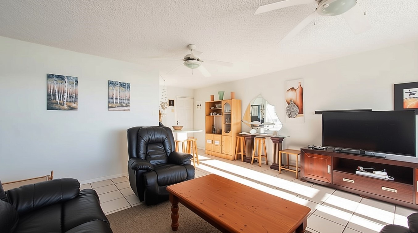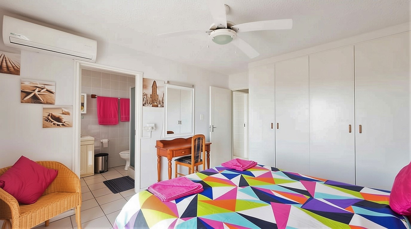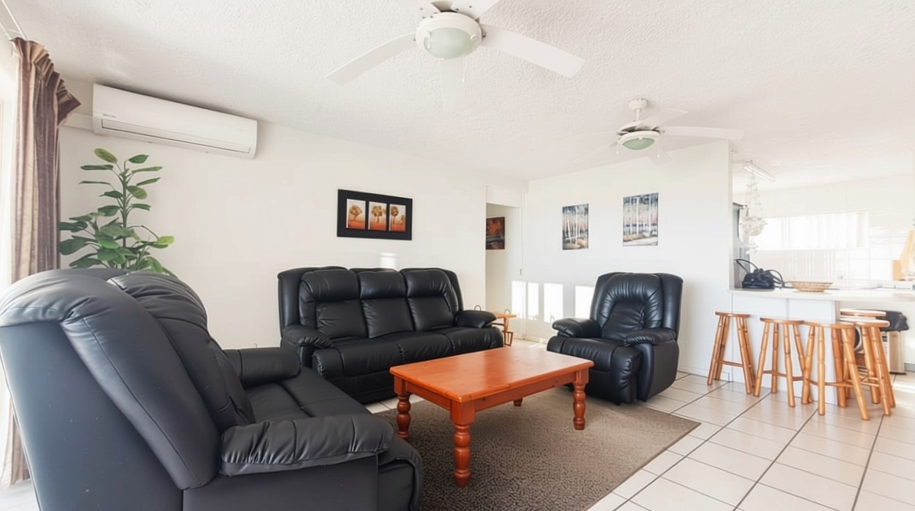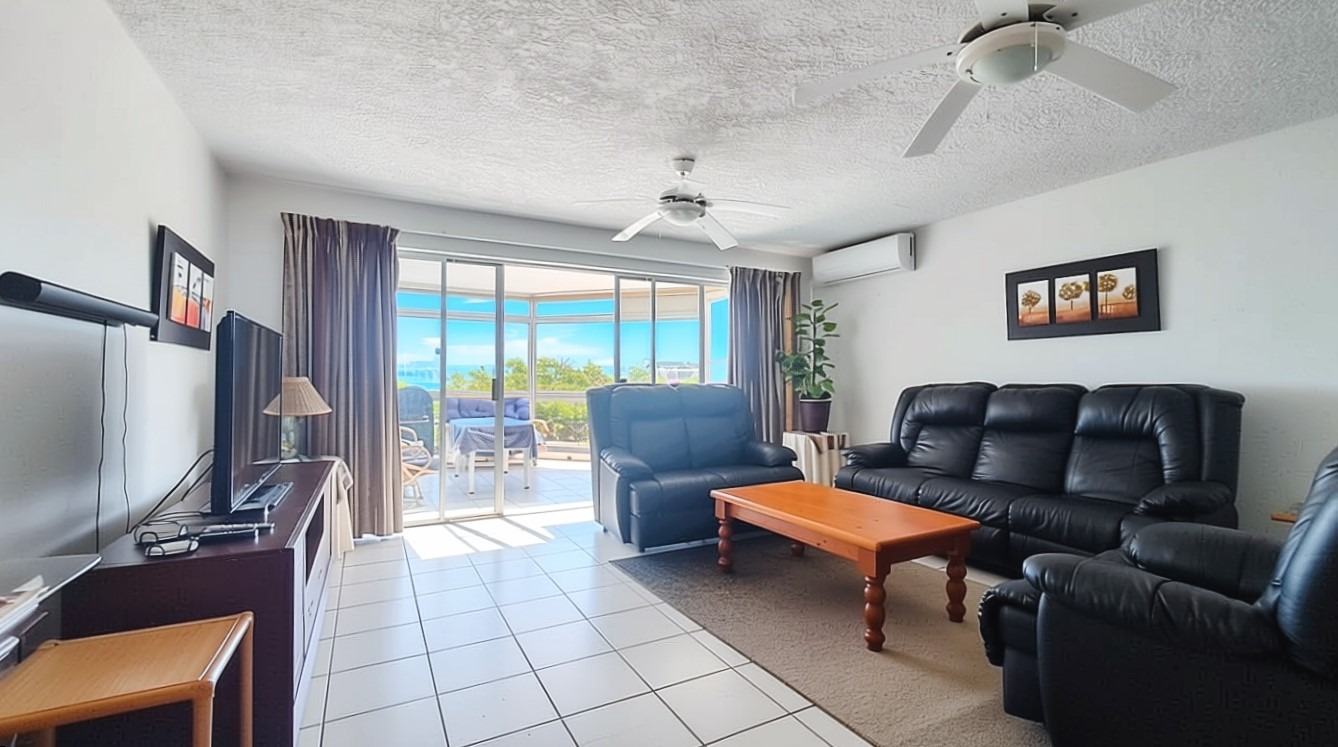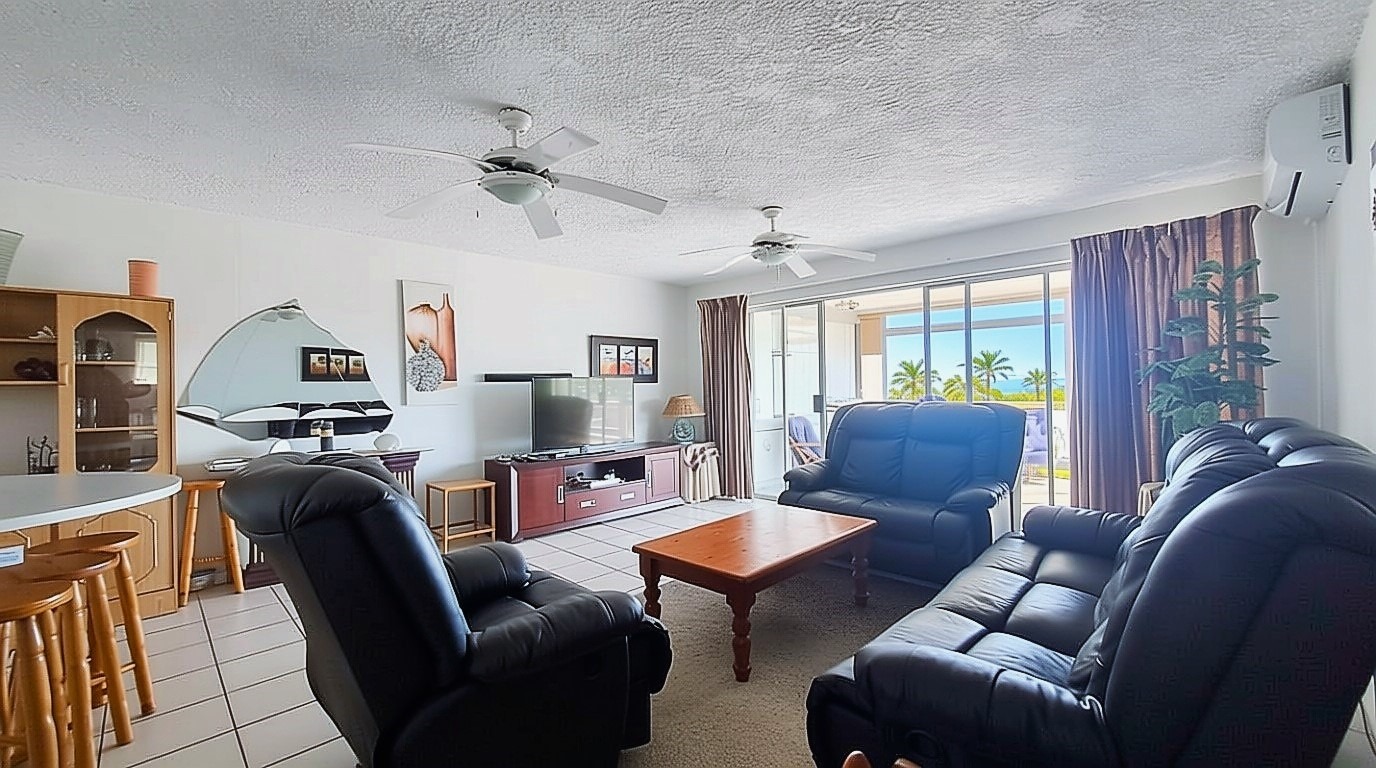 The interior features an open-plan layout, encompassing a comfortable lounge, a dining room, and a family/TV room, all designed to maximize natural light and the stunning ocean vistas. Air conditioning and ceiling fans ensure comfort throughout the year, complemented by easy-to-maintain tiled flooring. The property includes a functional kitchen and a dedicated gas braai room, perfect for entertaining.