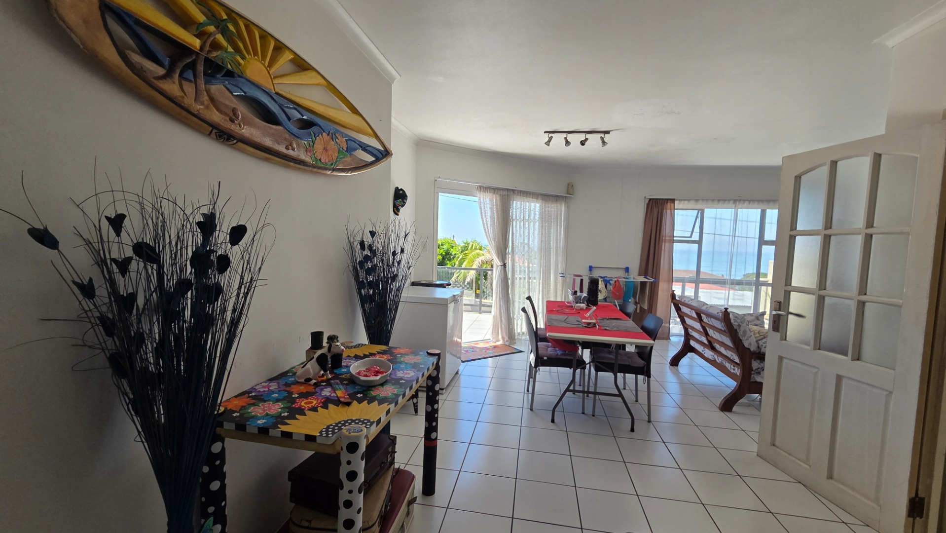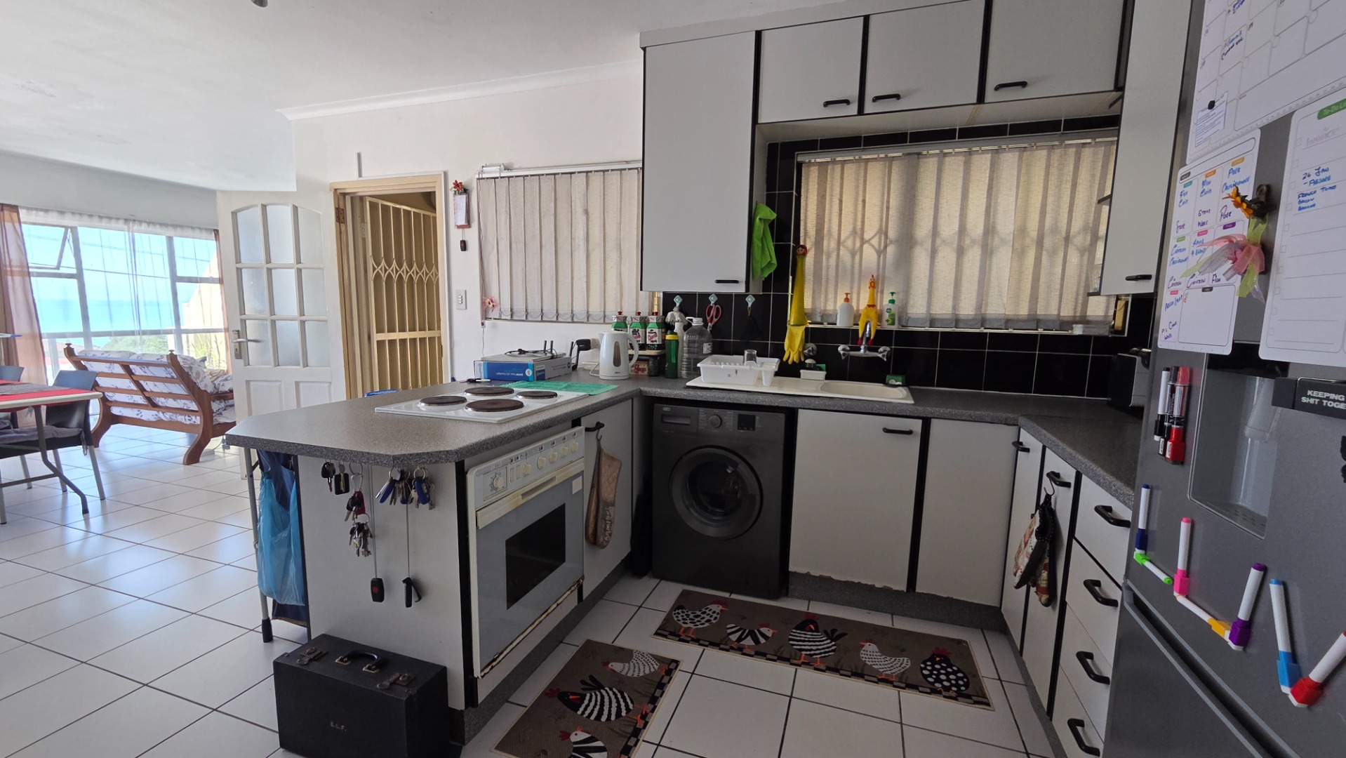 Step inside to an open-plan living area, where the lounge and kitchen seamlessly connect. This bright space is bathed in natural light from large windows and a sliding door, offering direct access to a private balcony. Enjoy breathtaking sea views from the comfort of your home. The kitchen features white cabinetry, ample storage, and durable tiled flooring throughout for easy maintenance.