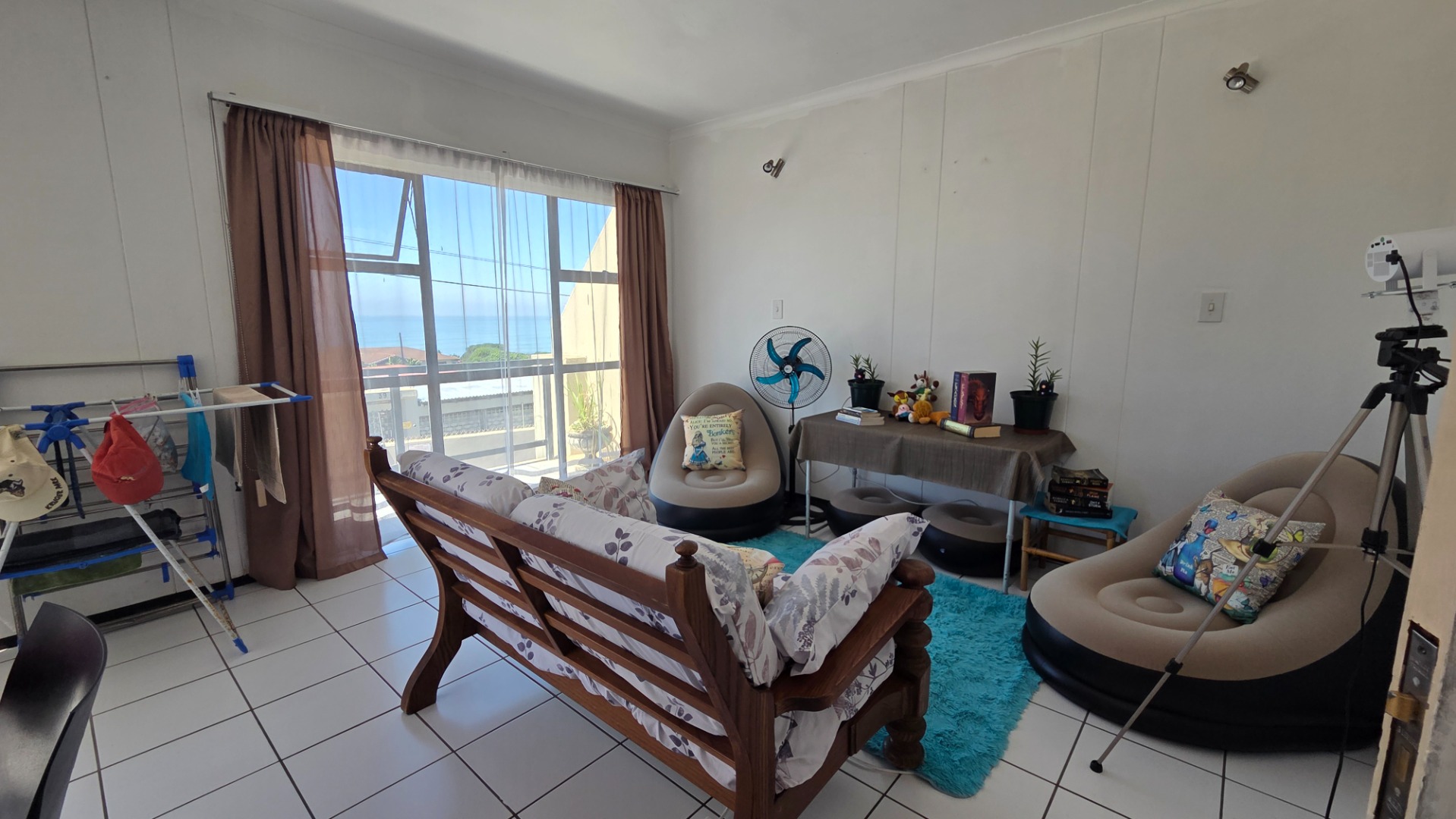 Step inside to an open-plan living area, where the lounge and kitchen seamlessly connect. This bright space is bathed in natural light from large windows and a sliding door, offering direct access to a private balcony. Enjoy breathtaking sea views from the comfort of your home. The kitchen features white cabinetry, ample storage, and durable tiled flooring throughout for easy maintenance.