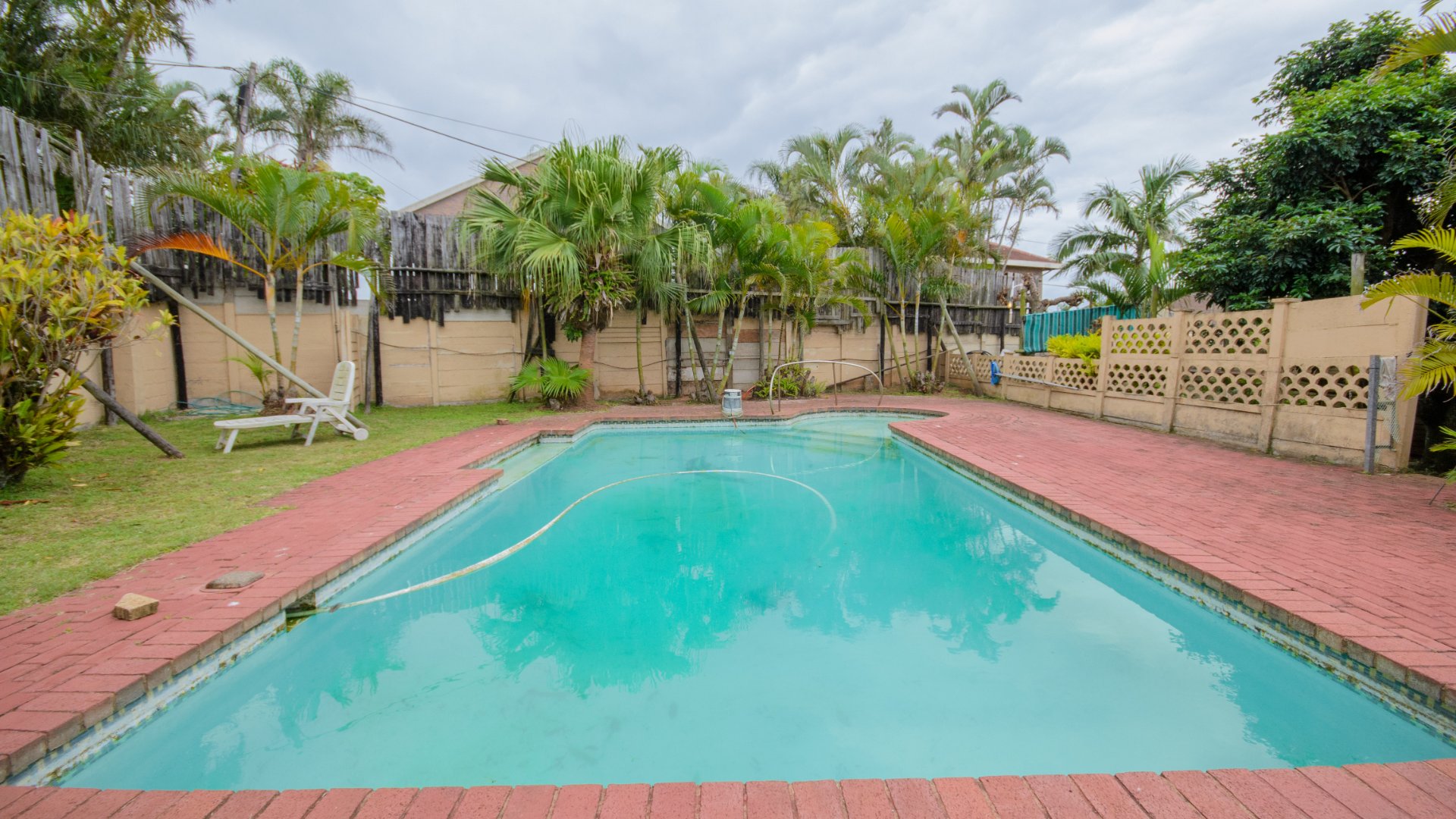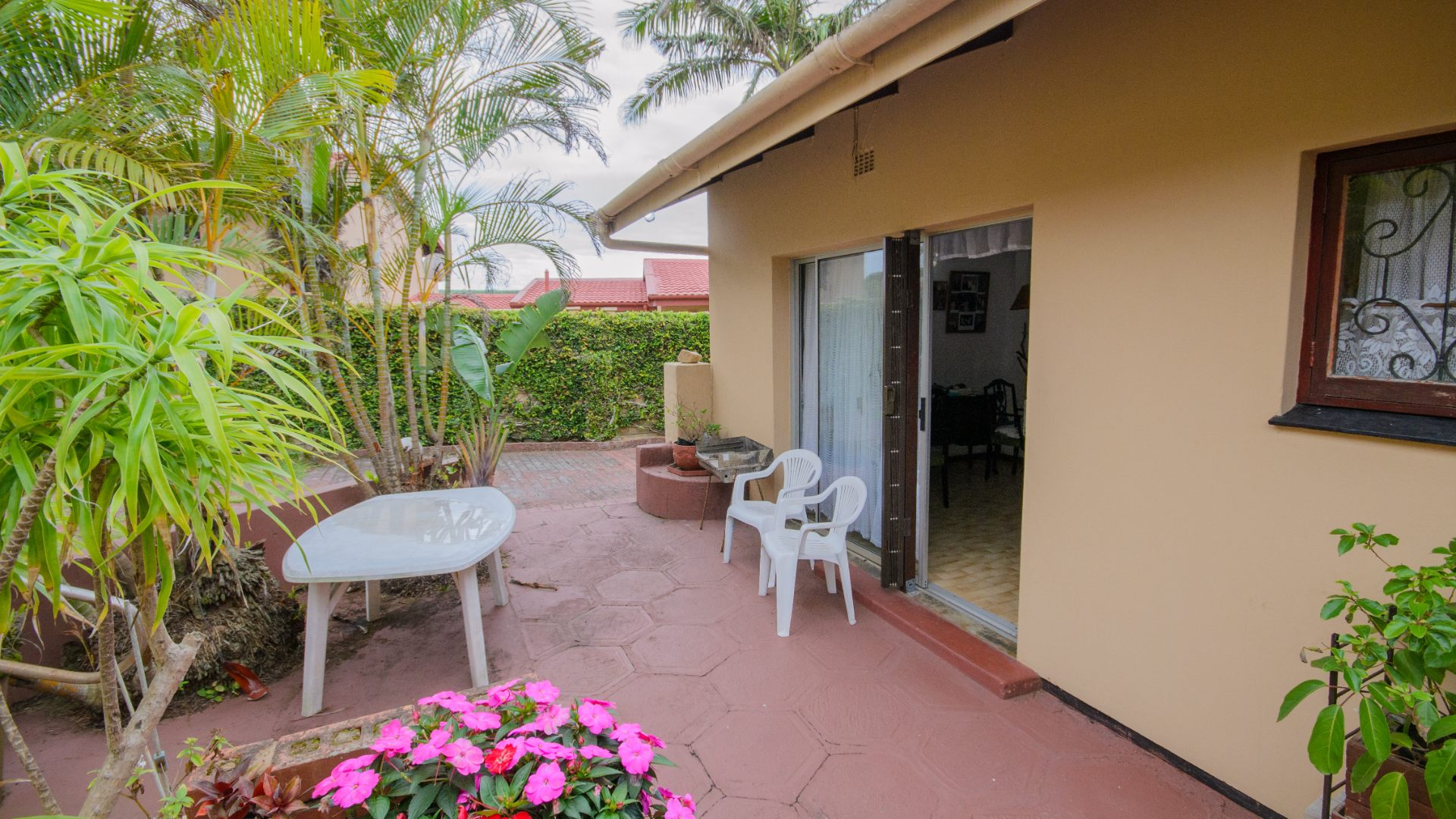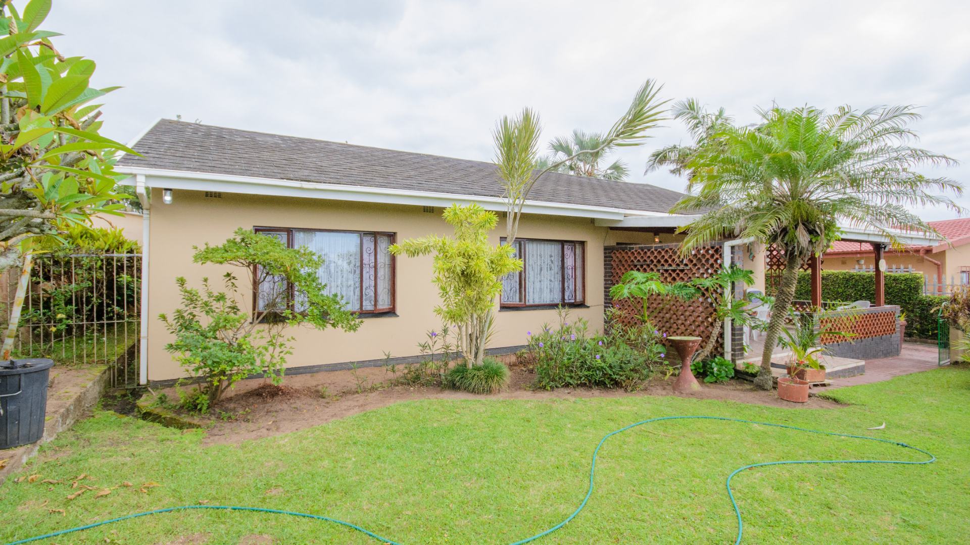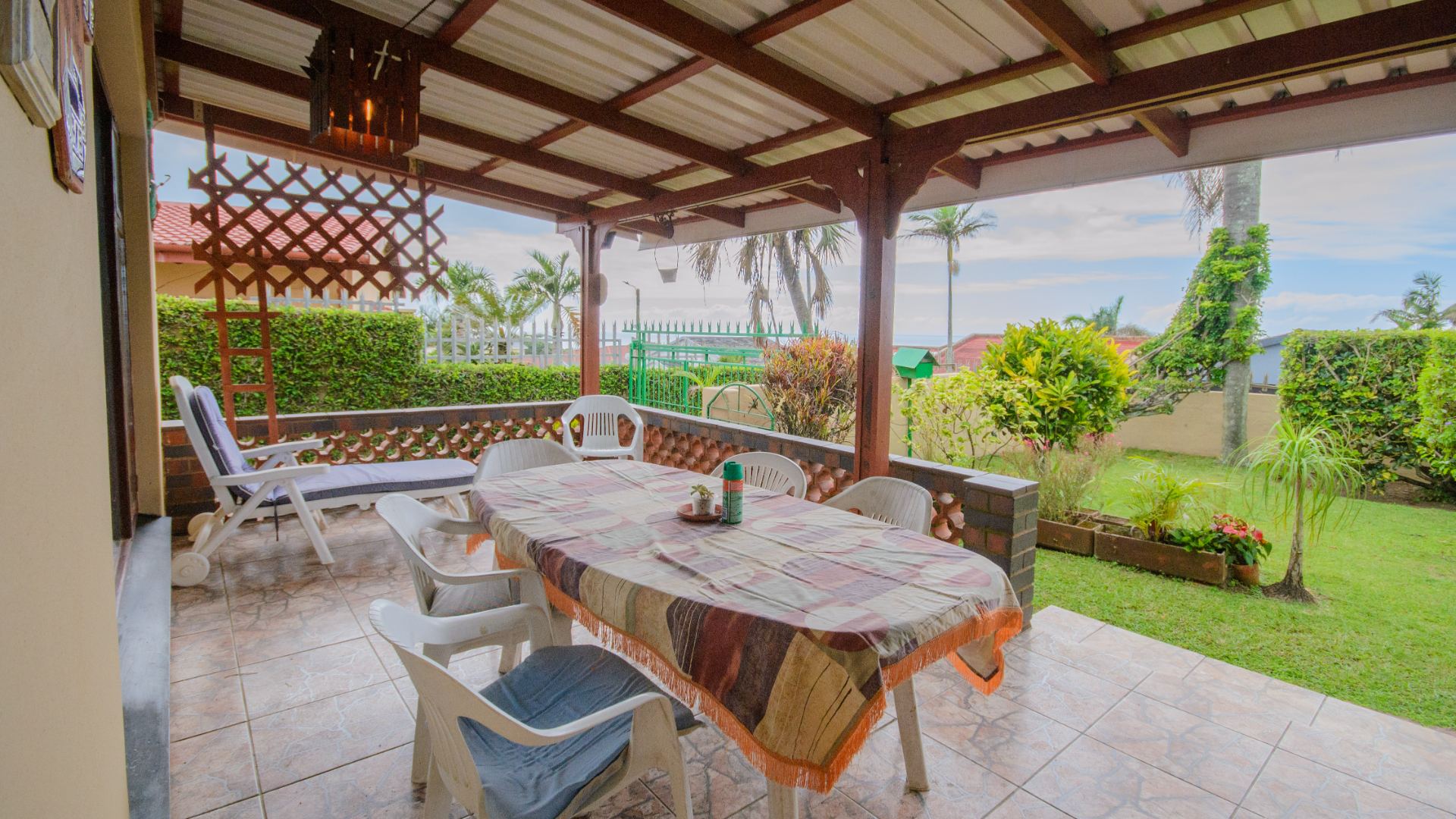 The garden stands out as a peaceful retreat, with a neat lawn, established tropical plants, and a sparkling pool that invites slow afternoons under the sun. A covered patio offers space for quiet mornings, long lunches, and relaxed evenings. A single garage and additional parking complete the layout, while security bars and an automatic gate add peace of mind.