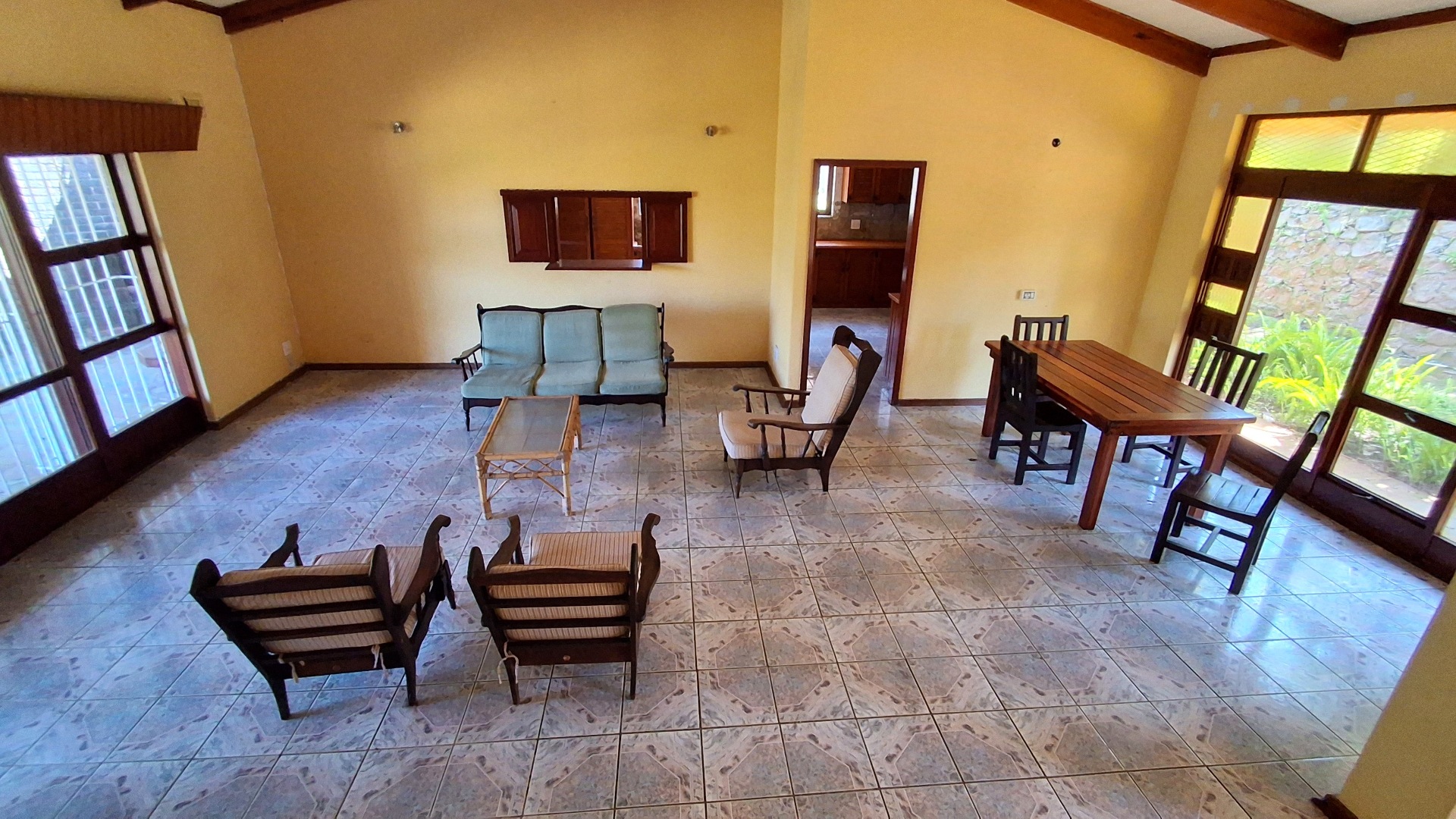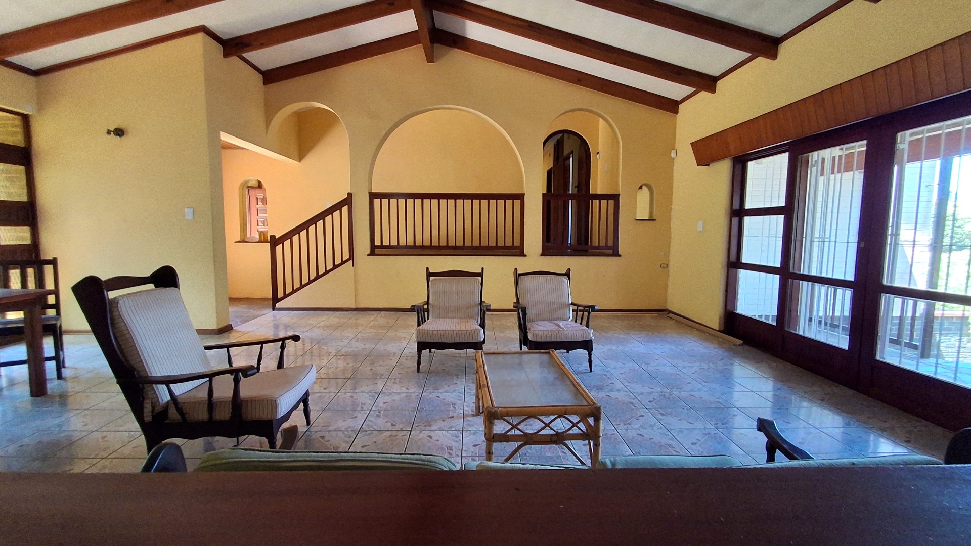 Step inside to find expansive living areas, a dining room, and a family TV room. The interiors boast high vaulted ceilings with charming exposed wooden beams, creating an airy atmosphere, complemented by abundant natural light streaming through large glass doors and and windows. Durable tiled flooring extends throughout, providing a practical foundation for your design vision. The inherent spaciousness and architectural details offer immense potential for a contemporary transformation.