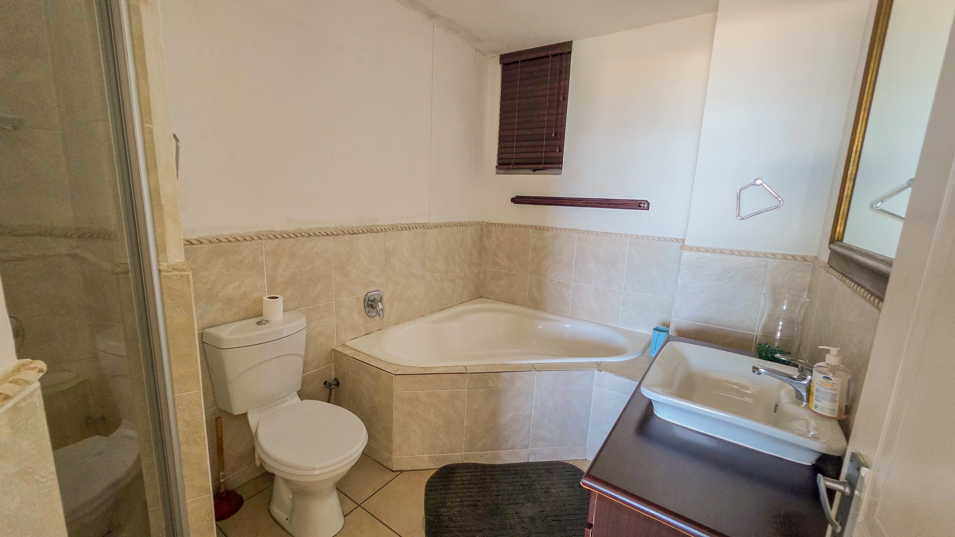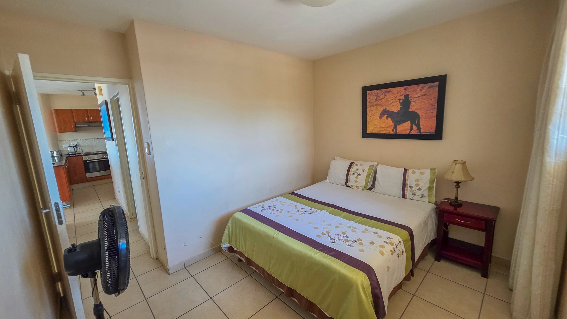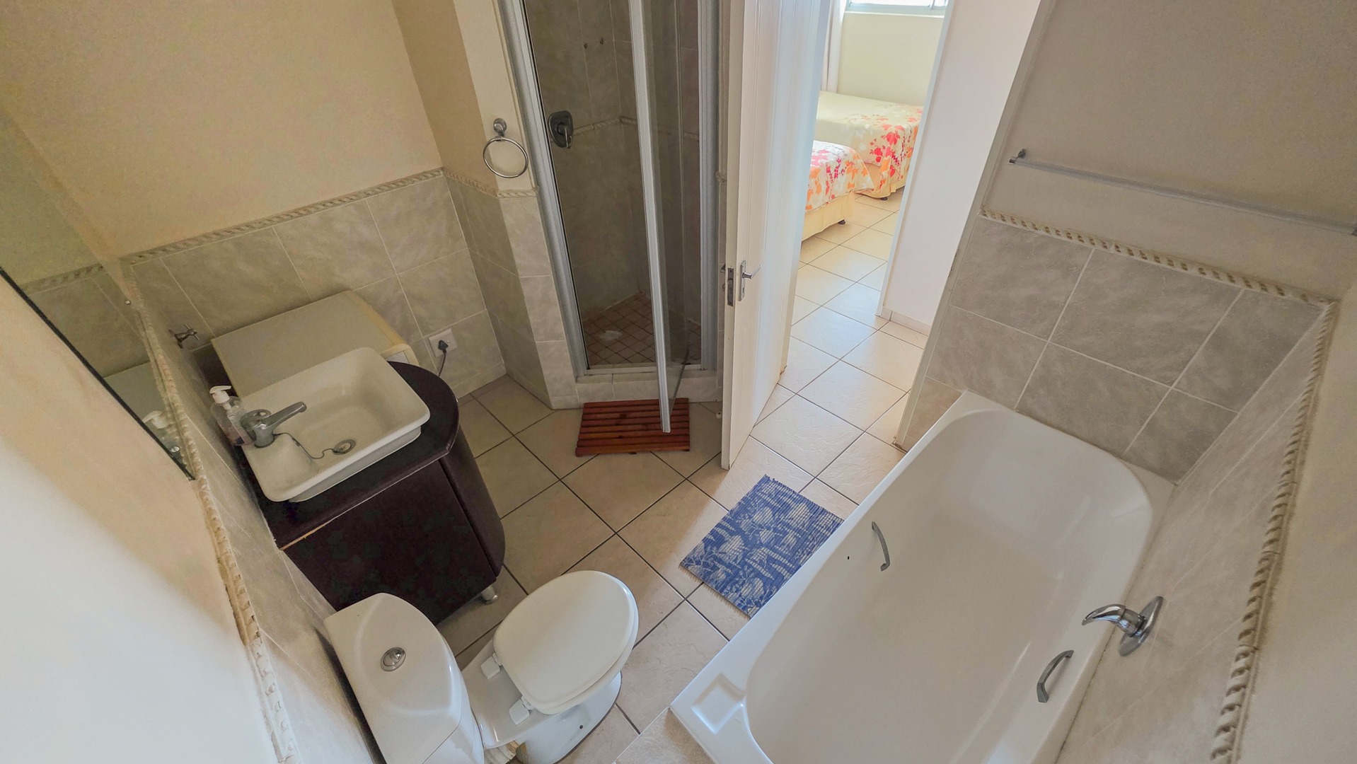 The main bedroom is spacious, with a full ensuite that includes a bath, shower, basin, and toilet. It opens straight onto the front patio. Two more bedrooms share a second full bathroom with both bath and shower. The kitchen offers granite tops and good workspace. The apartment is fully tiled for simple maintenance.
