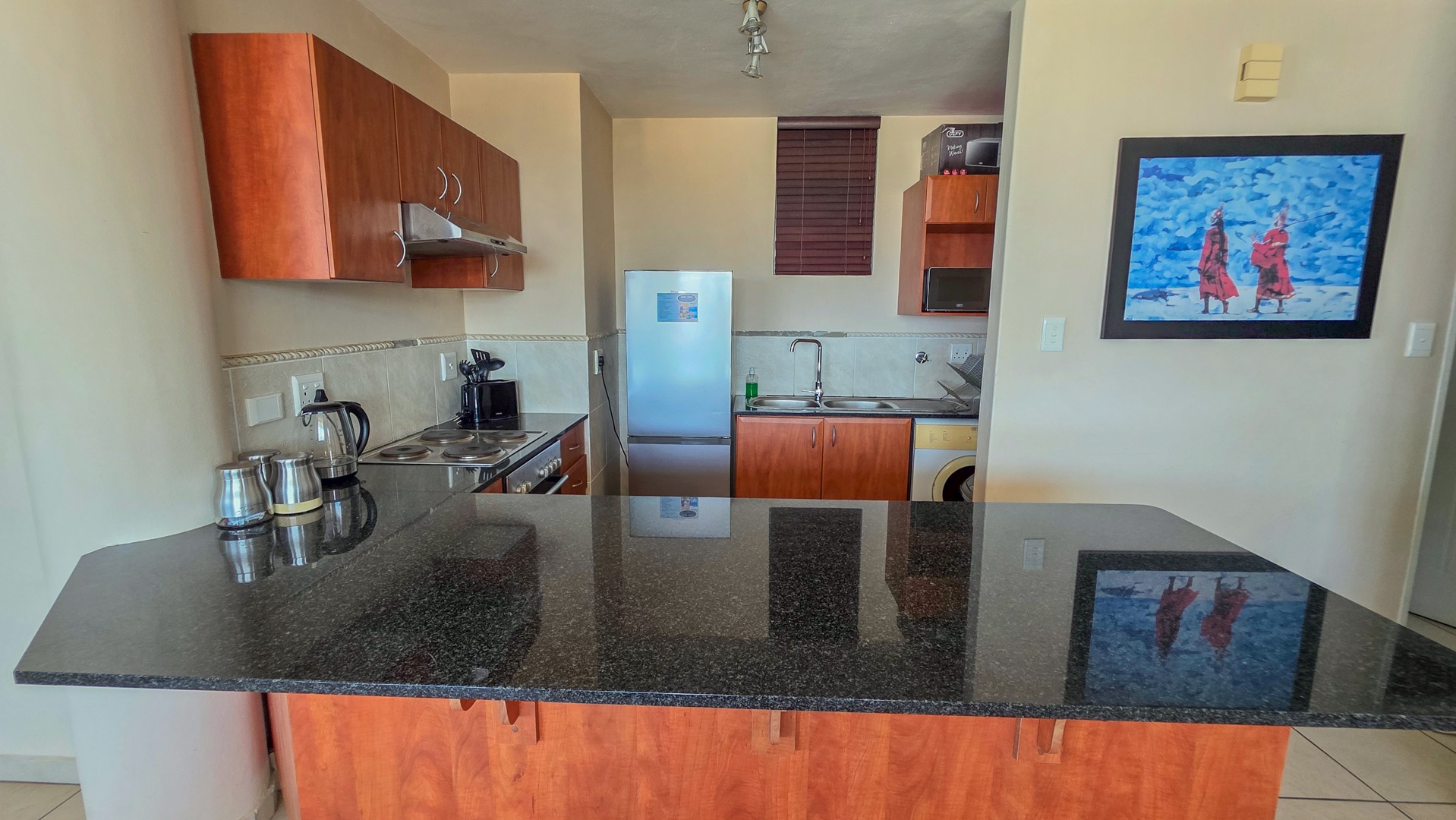 The main bedroom is spacious, with a full ensuite that includes a bath, shower, basin, and toilet. It opens straight onto the front patio. Two more bedrooms share a second full bathroom with both bath and shower. The kitchen offers granite tops and good workspace. The apartment is fully tiled for simple maintenance.