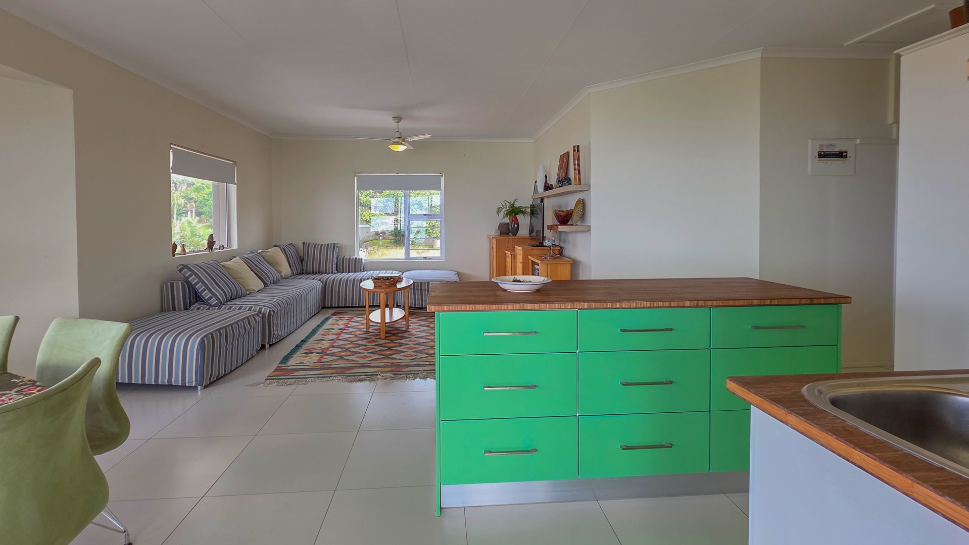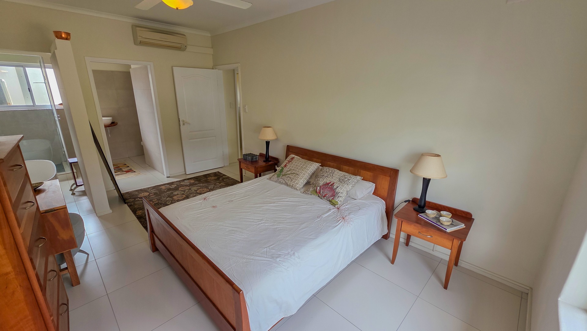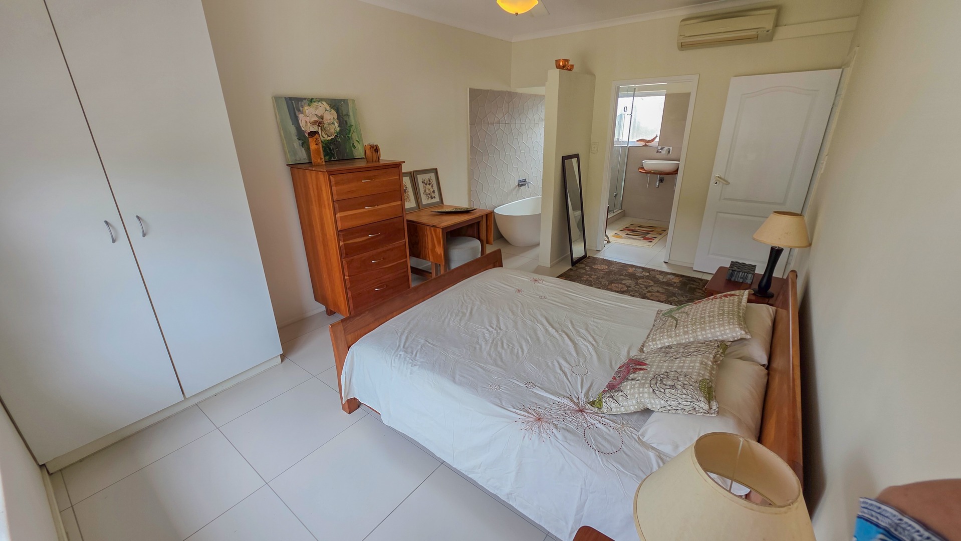 The second bedroom includes built in cupboards and its own bathroom. This bathroom includes a shower with good space, a toilet and a basin. It supports guests or family with a private, practical setup.The open plan kitchen, dining area and lounge create a bright living space. Wooden tops, an eye level oven, a centre island and a dishwasher connection support simple everyday use. Direct access to the patio makes the home suited for relaxed hosting.