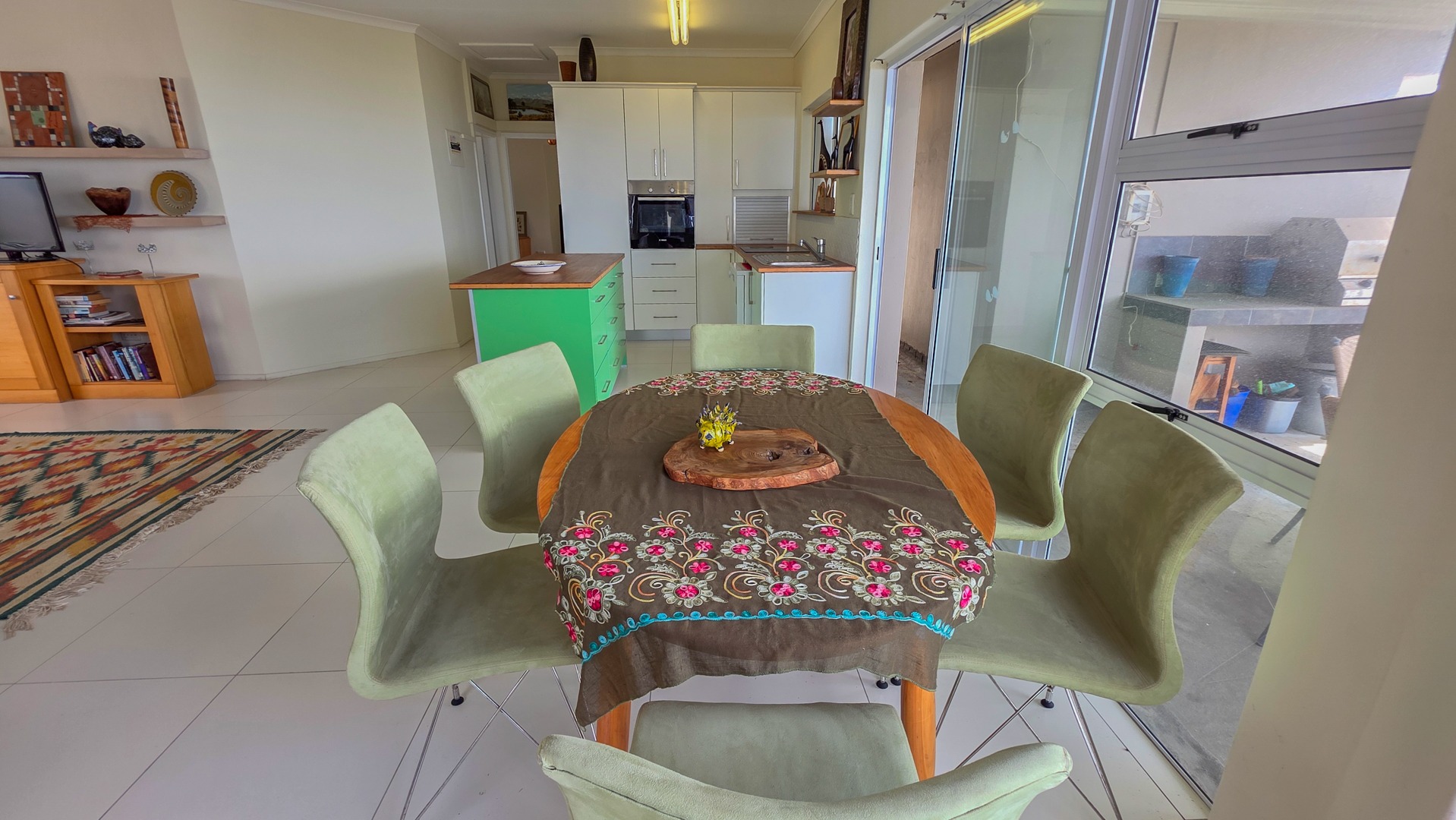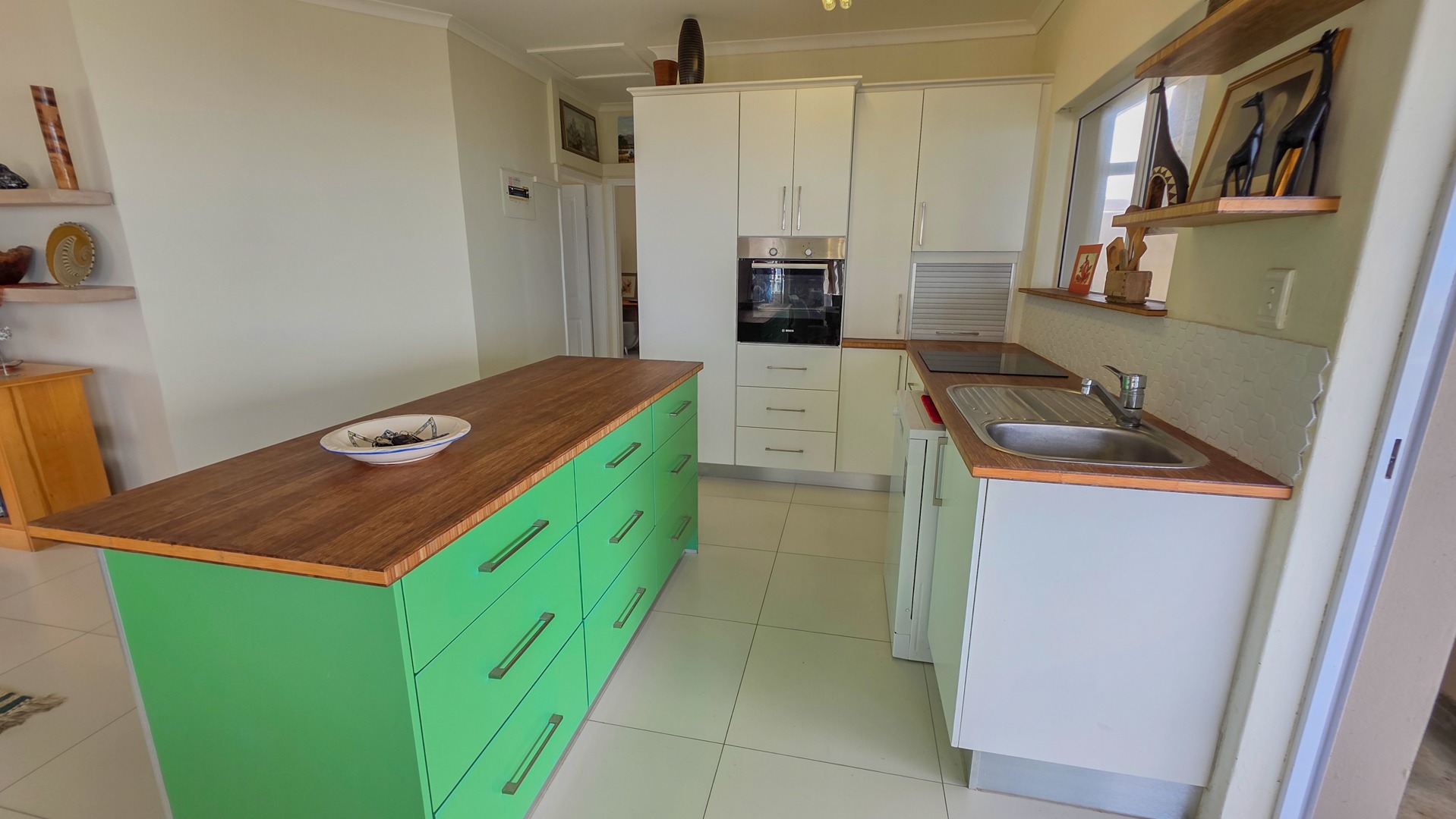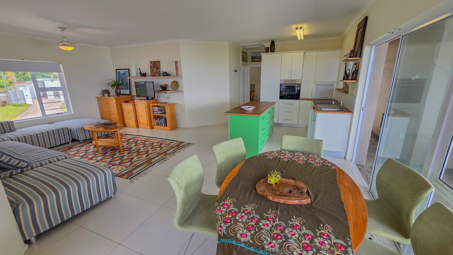 The second bedroom includes built in cupboards and its own bathroom. This bathroom includes a shower with good space, a toilet and a basin. It supports guests or family with a private, practical setup.The open plan kitchen, dining area and lounge create a bright living space. Wooden tops, an eye level oven, a centre island and a dishwasher connection support simple everyday use. Direct access to the patio makes the home suited for relaxed hosting.