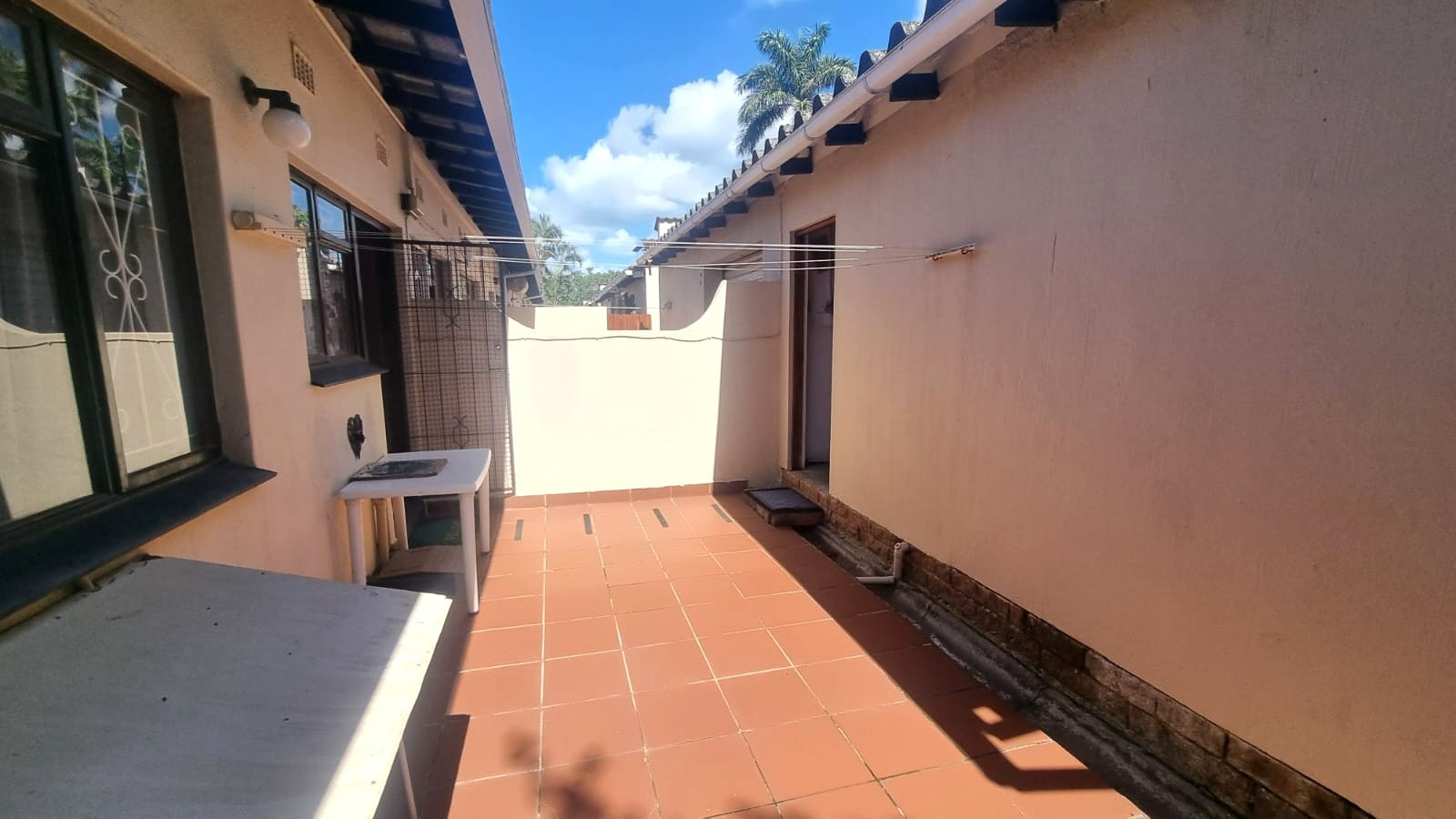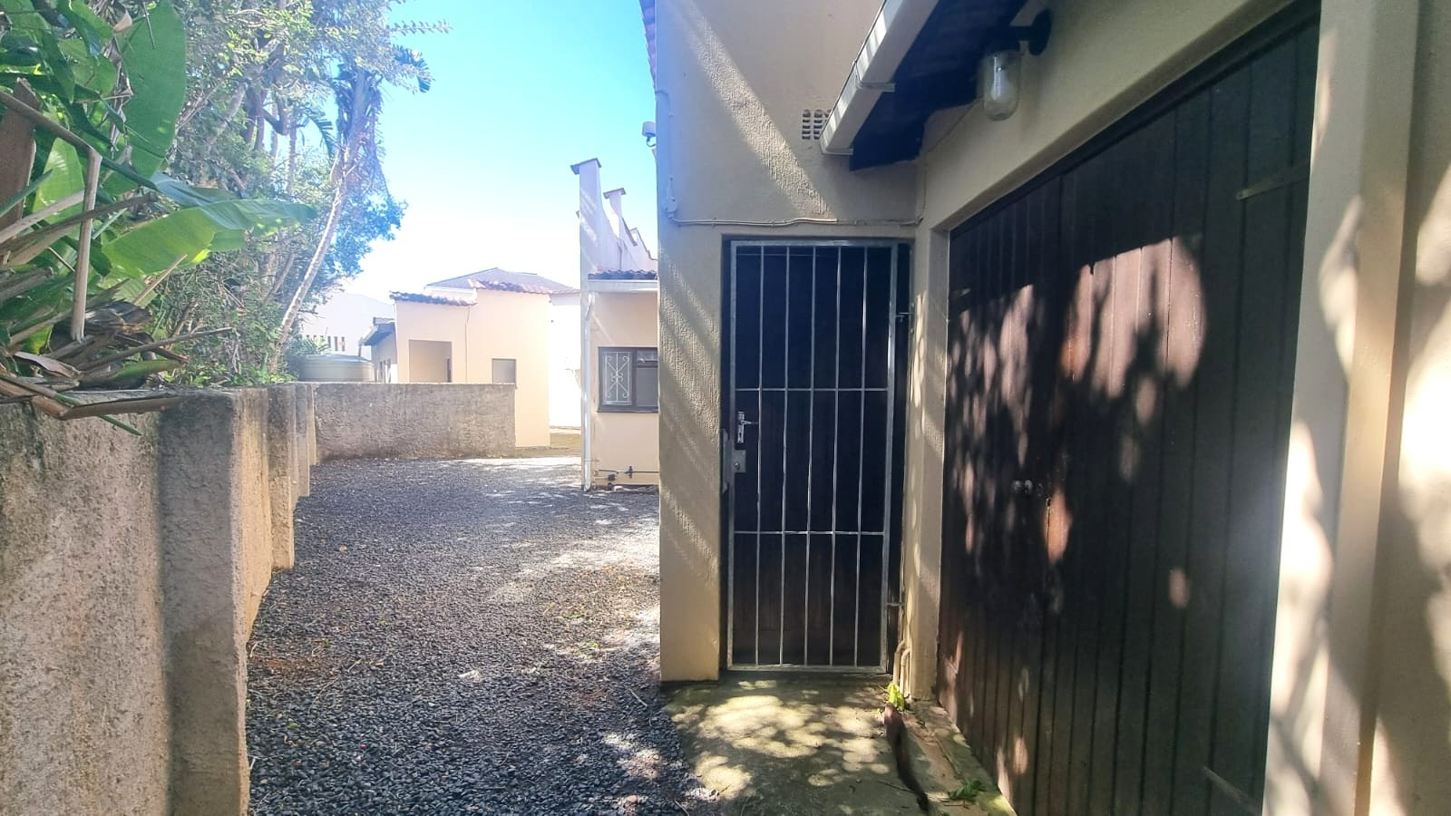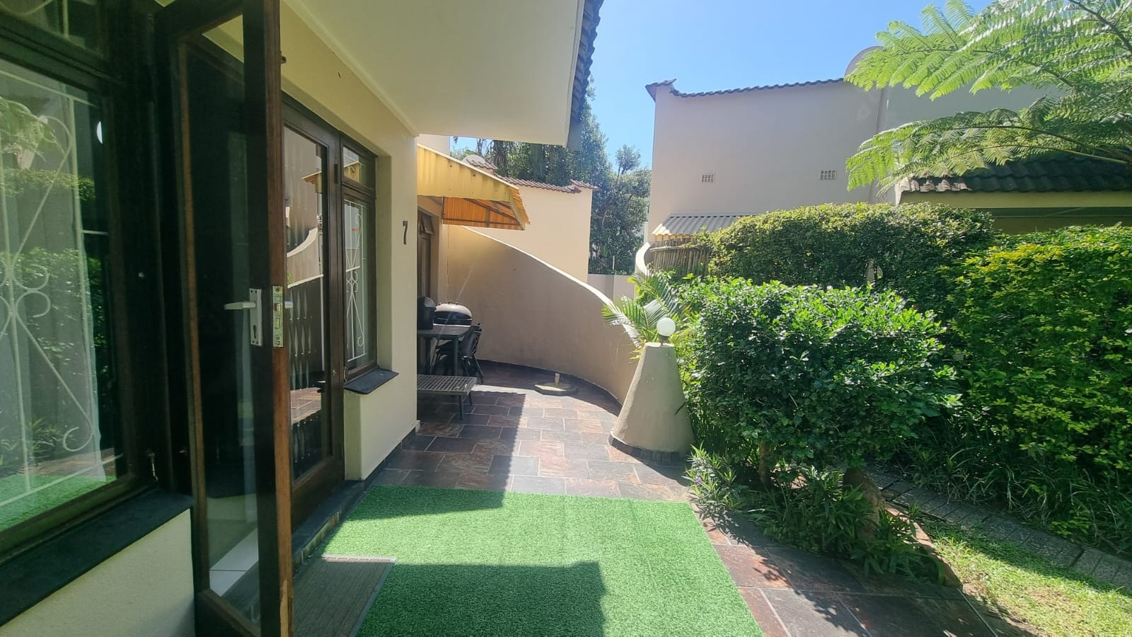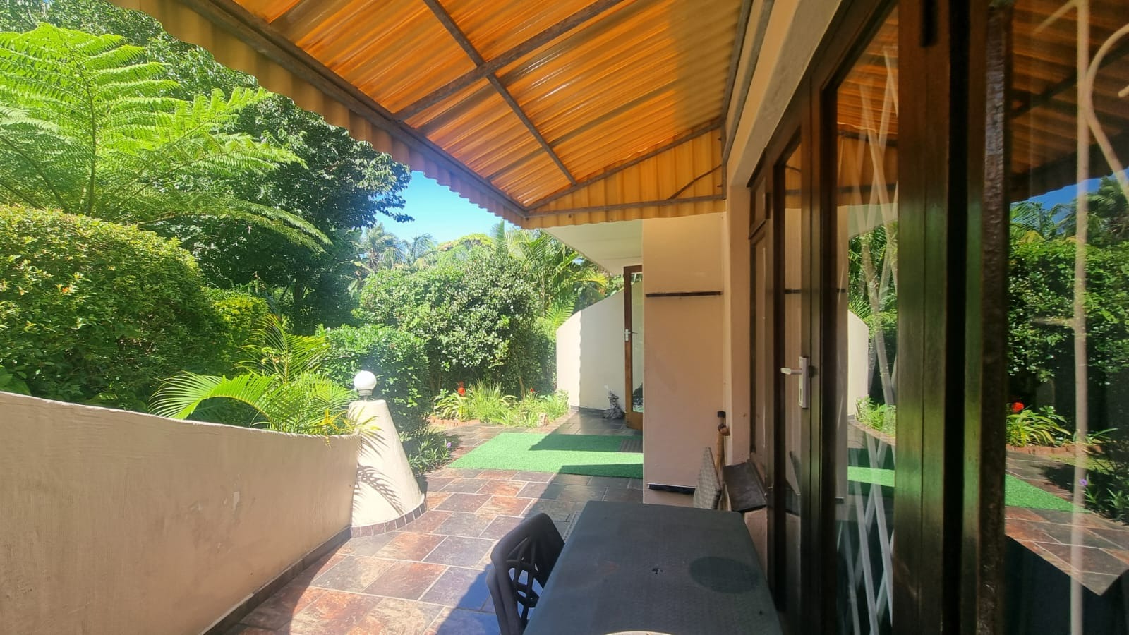 As you enter the home, you are welcomed into an open-plan living space that seamlessly combines the kitchen and lounge area. The interior features double-volume ceilings with exposed wooden beams, creating a warm and airy atmosphere. From the lounge, step out onto a private patio overlooking lush communal gardens - an ideal spot to relax and enjoy the coastal breeze. A sparkling communal swimming pool is also available for those warm summer afternoons.