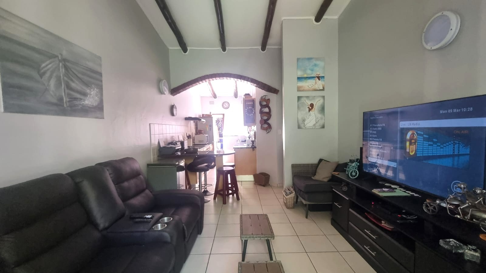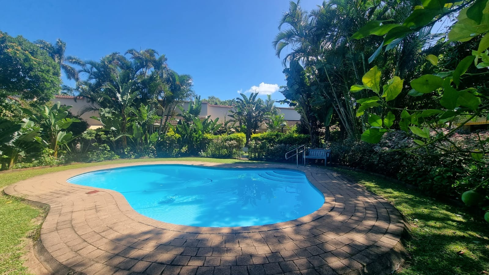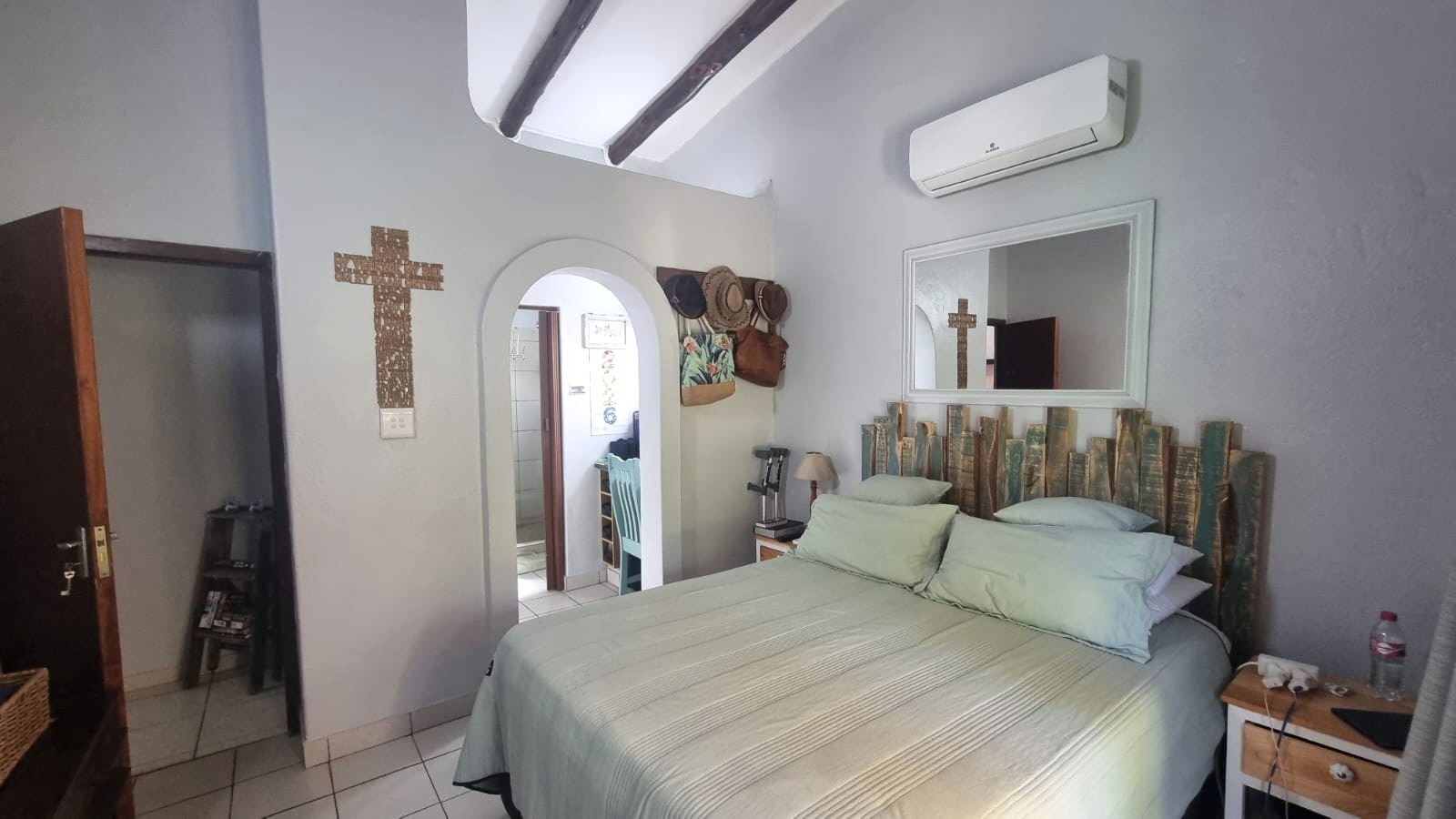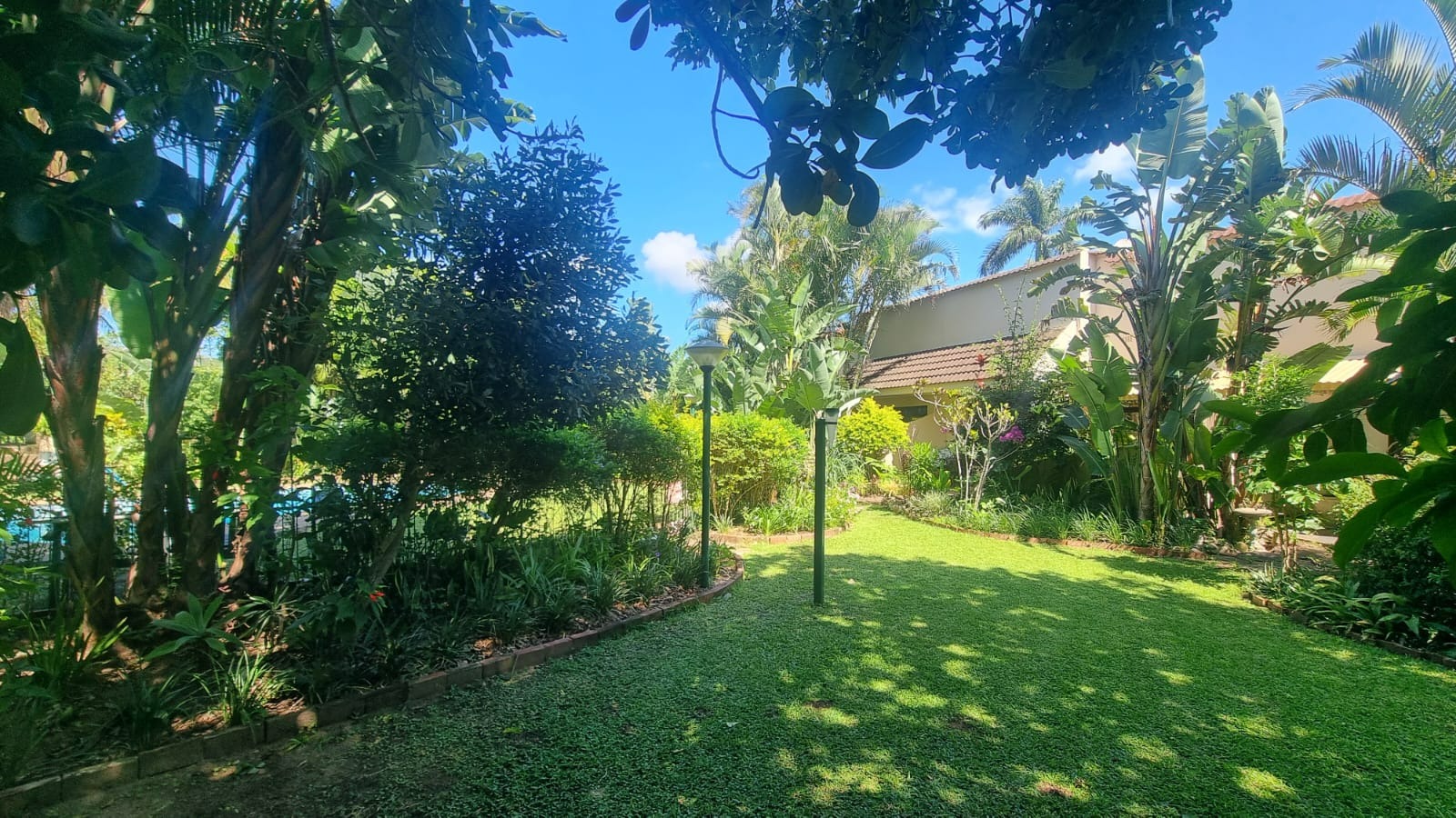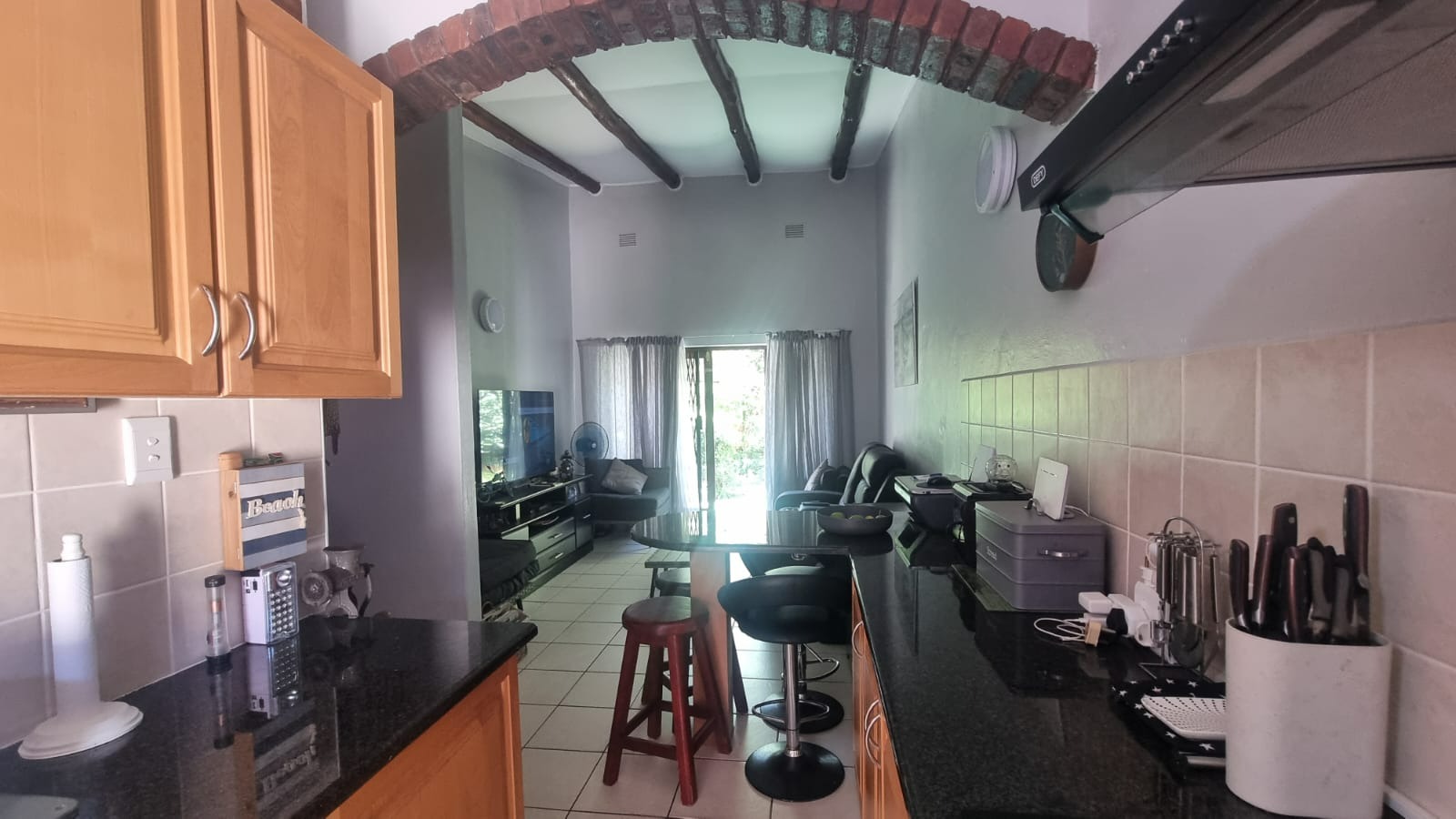 As you enter the home, you are welcomed into an open-plan living space that seamlessly combines the kitchen and lounge area. The interior features double-volume ceilings with exposed wooden beams, creating a warm and airy atmosphere. From the lounge, step out onto a private patio overlooking lush communal gardens - an ideal spot to relax and enjoy the coastal breeze. A sparkling communal swimming pool is also available for those warm summer afternoons.