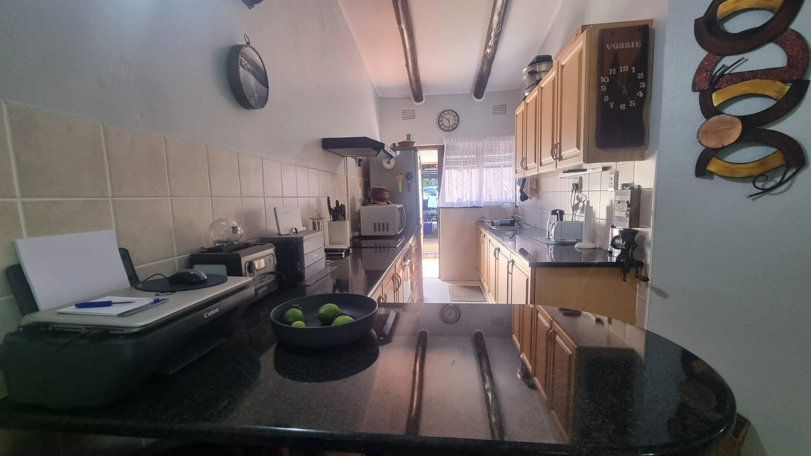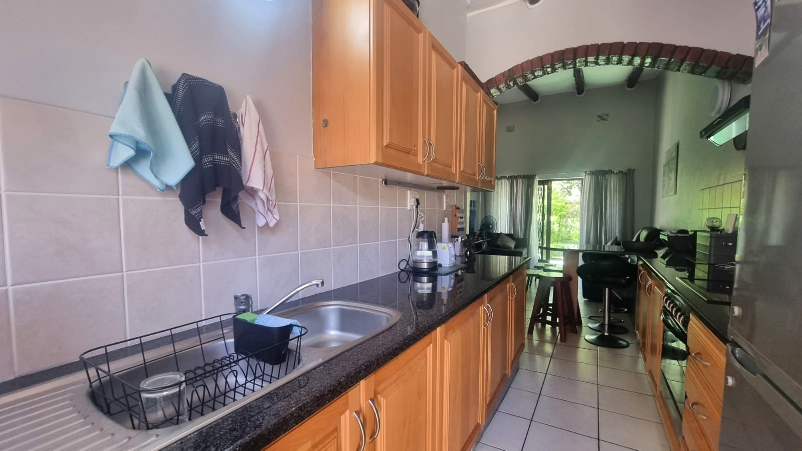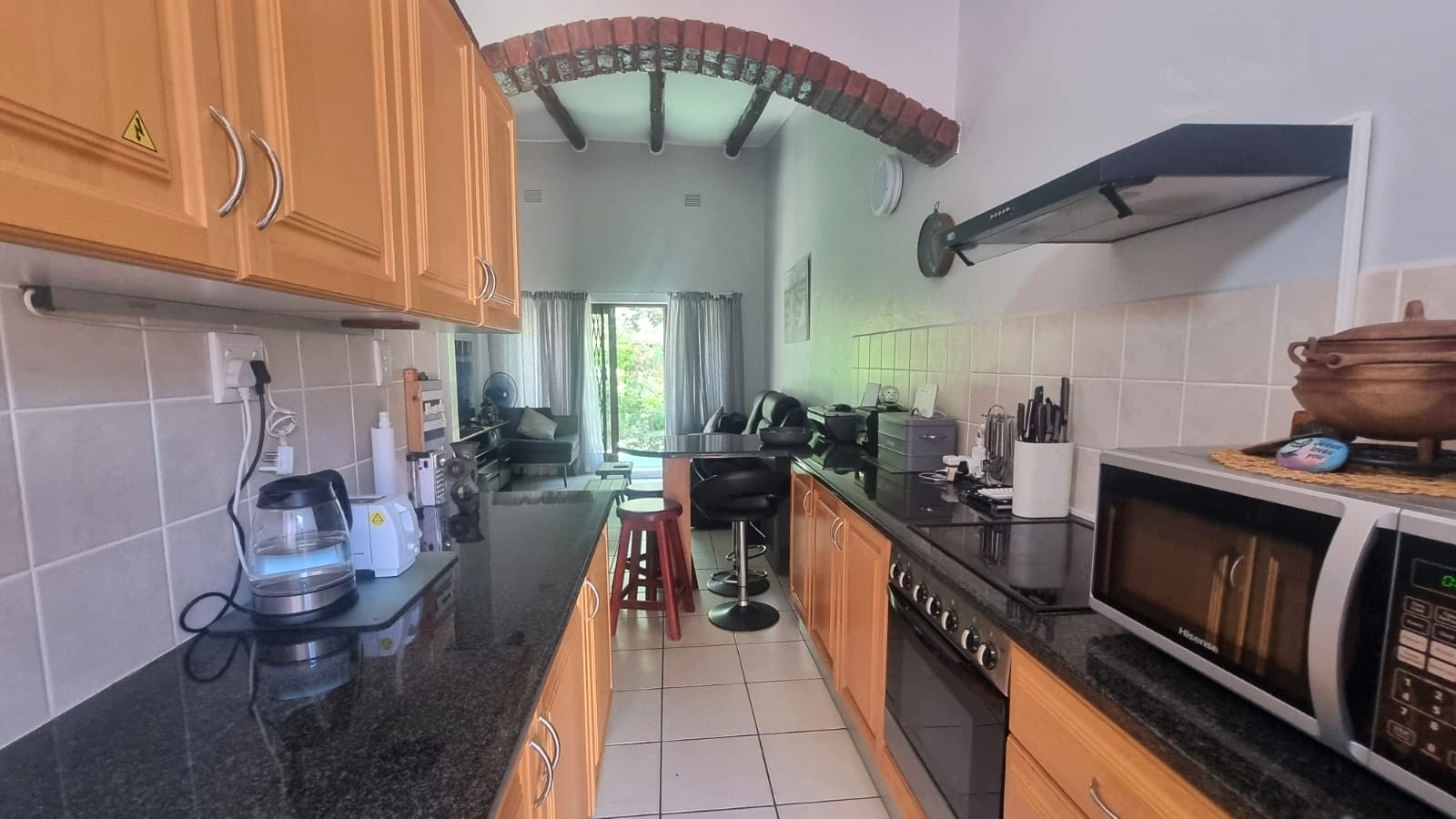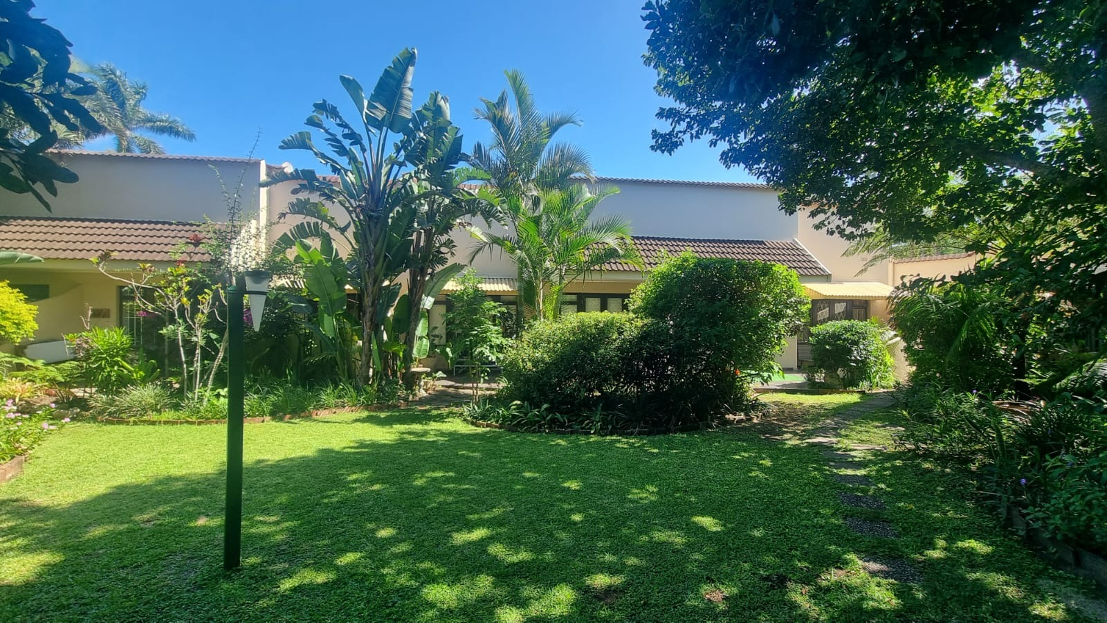 As you enter the home, you are welcomed into an open-plan living space that seamlessly combines the kitchen and lounge area. The interior features double-volume ceilings with exposed wooden beams, creating a warm and airy atmosphere. From the lounge, step out onto a private patio overlooking lush communal gardens - an ideal spot to relax and enjoy the coastal breeze. A sparkling communal swimming pool is also available for those warm summer afternoons.