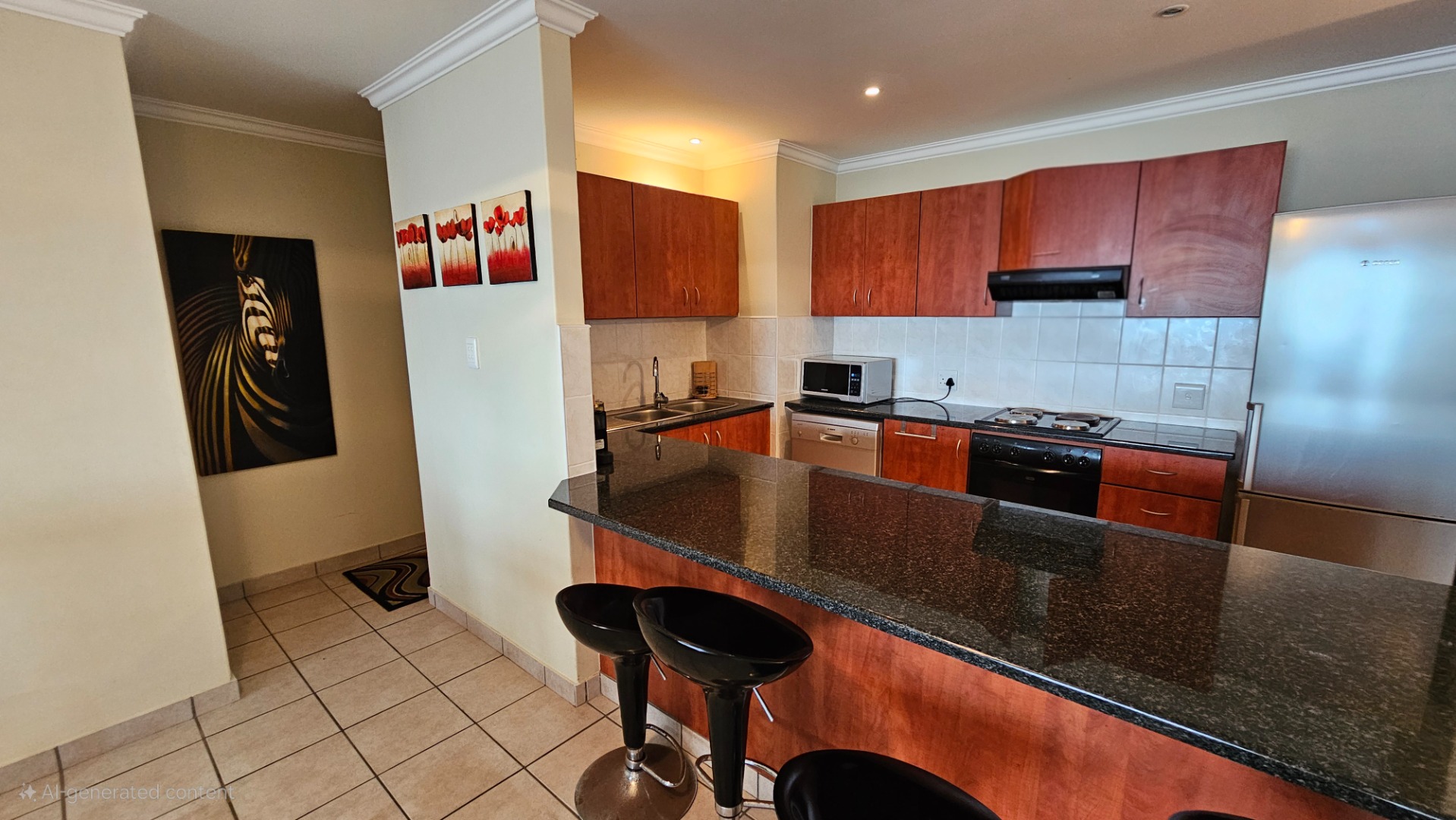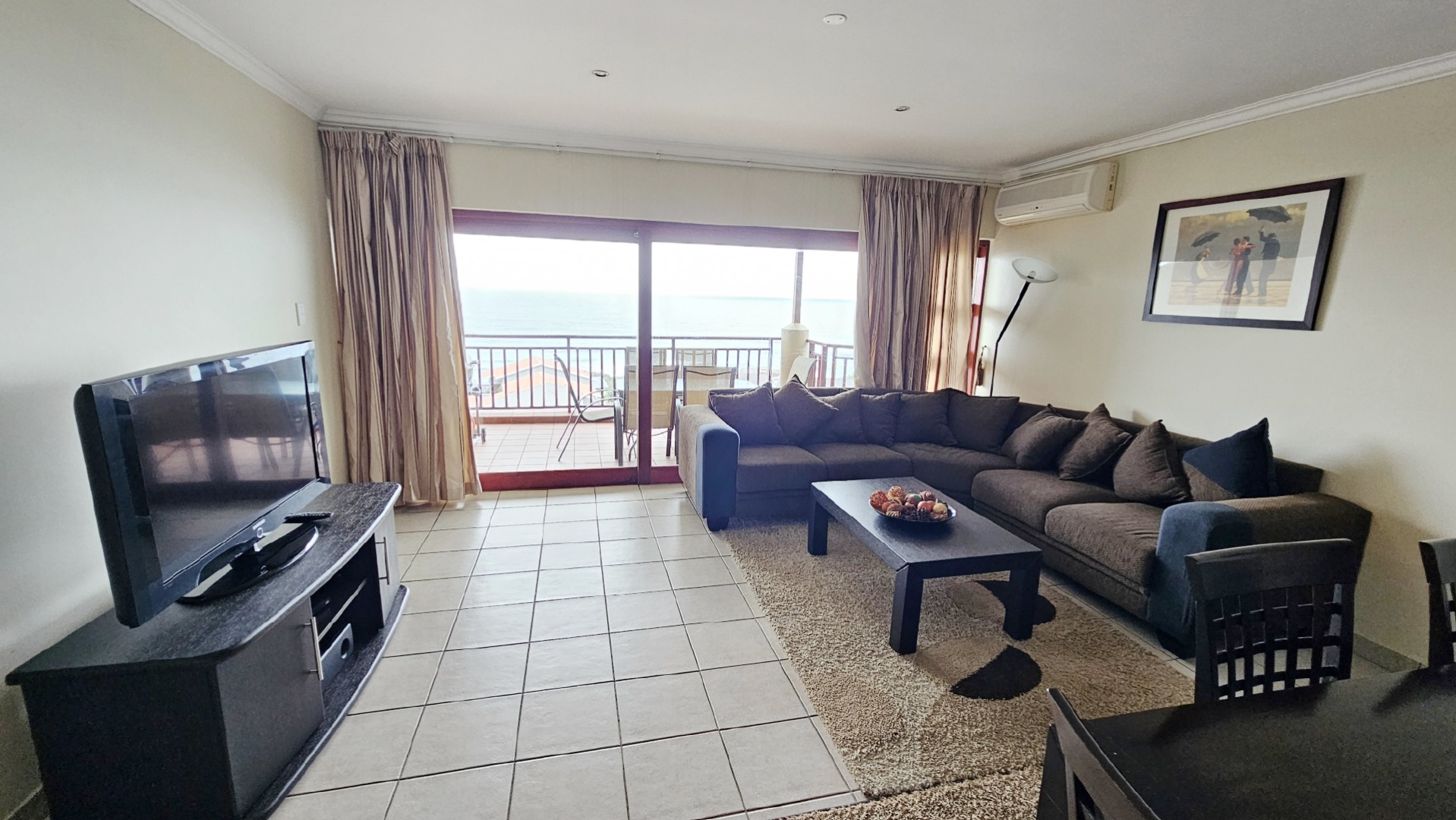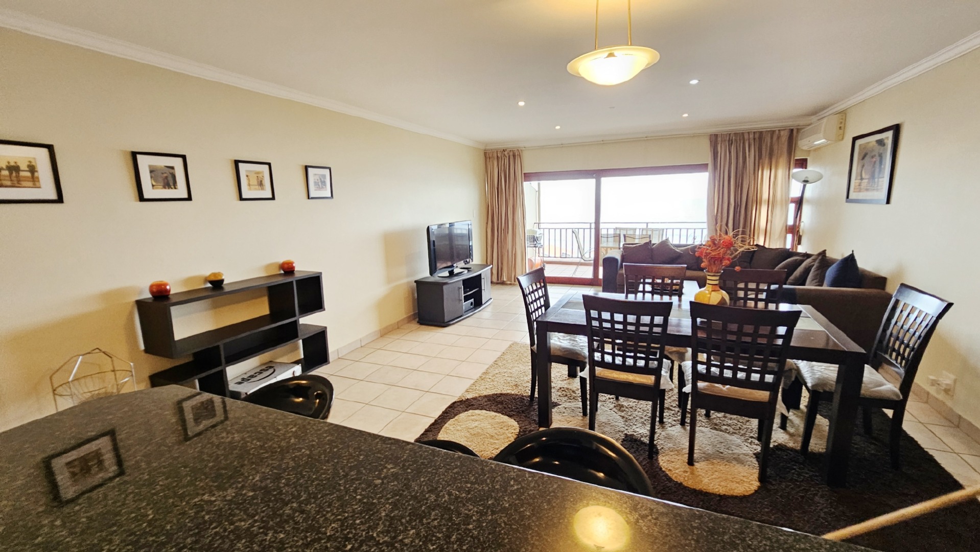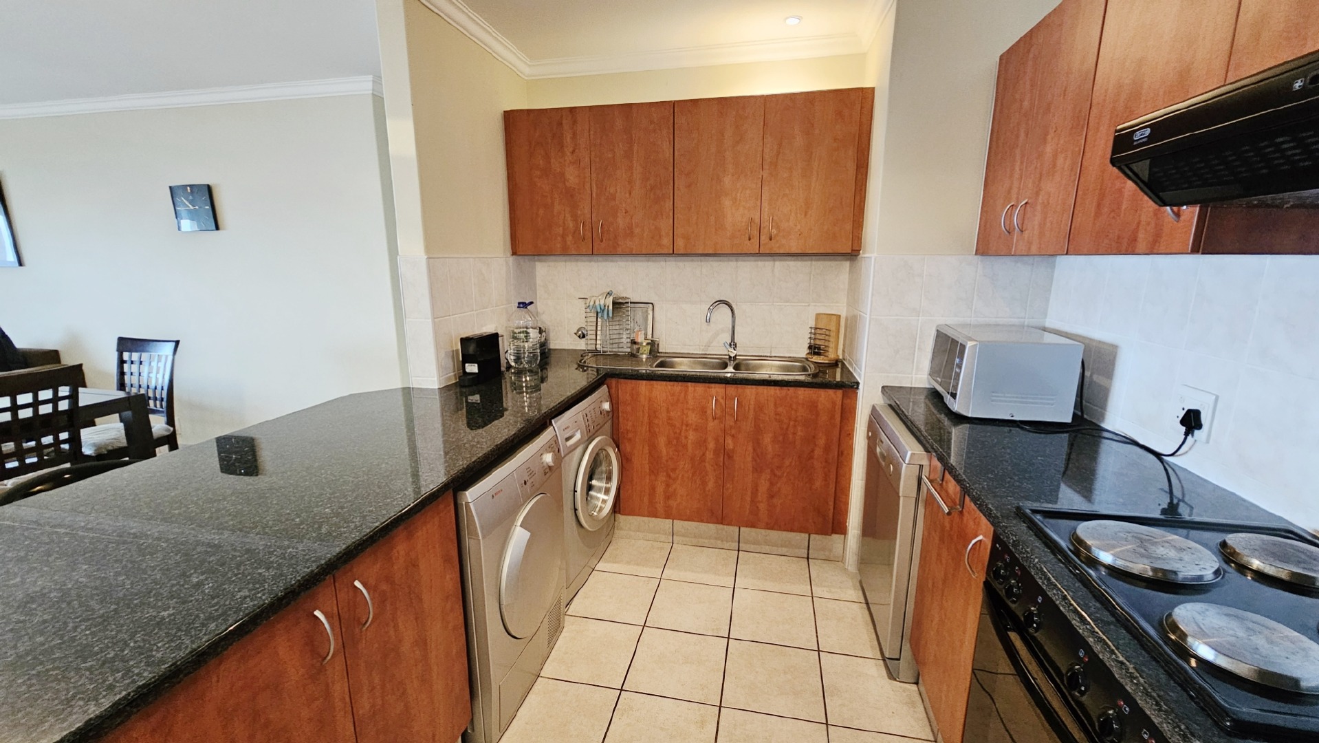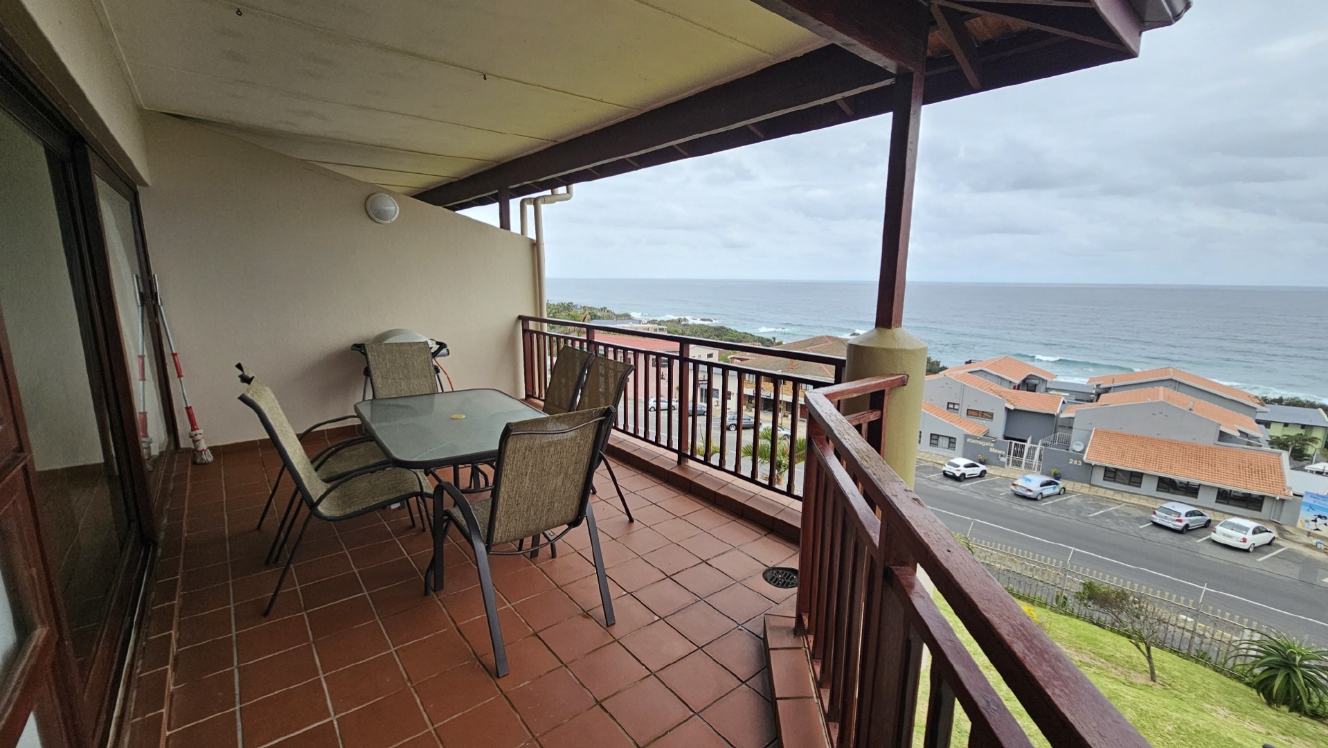 This inviting 3-bedroom, 2-bathroom apartment is nestled within a well-maintained complex in Ramsgate, offering an ideal coastal lifestyle. The property immediately impresses with its attractive entrance, featuring lush flowering vines and immaculately maintained gardens, leading to the communal swimming pool area. This is a top floor unit, with approximately 10 stairs. On entering the unit you are greeted by an open plan design, while the functional kitchen boasts dark granite countertops, stylish mahogany cabinetry and tiled floors, equipped with a double sink, stove with extractor fan, dishwasher, washing machine, and tumble dryer. Its open-plan design seamlessly connects to the dining room and lounge, fostering comfortable living and entertaining all while taking in endless sea views, throughout the home.
