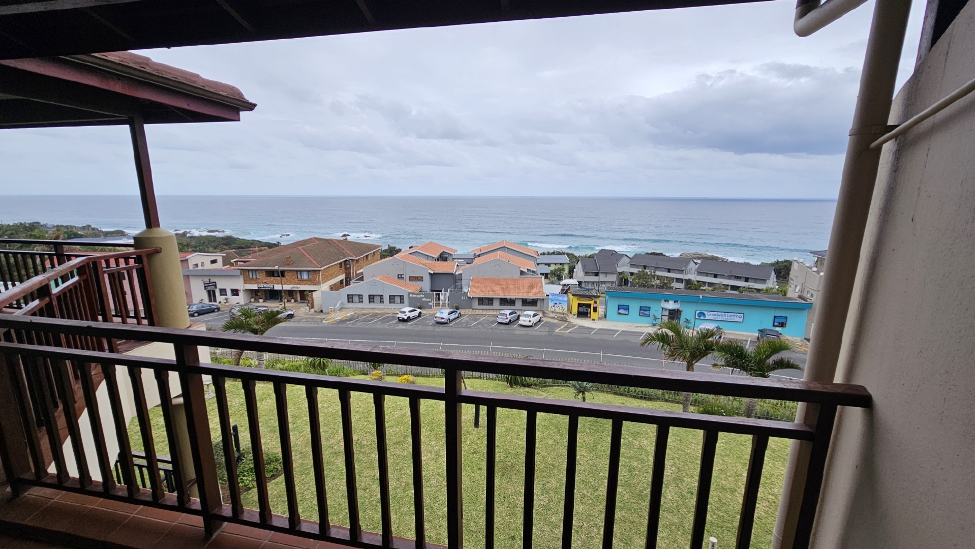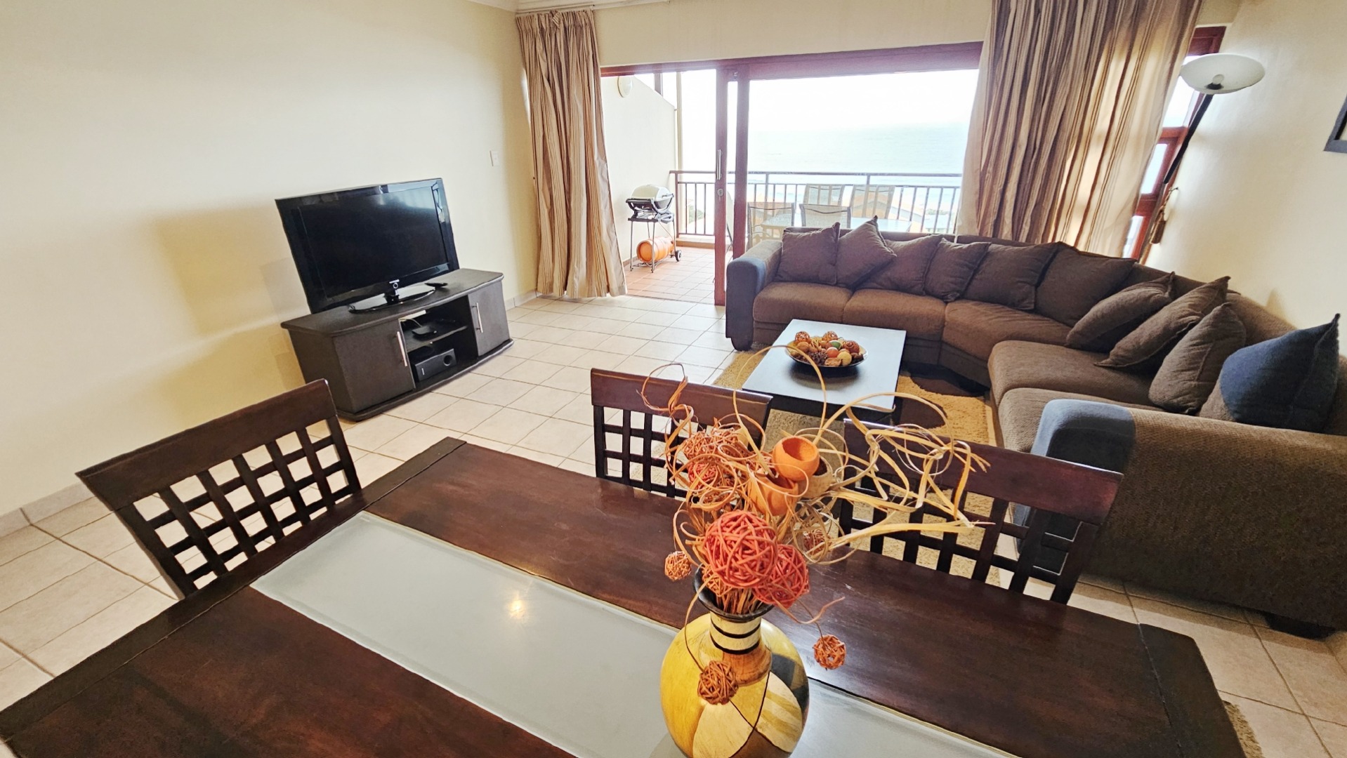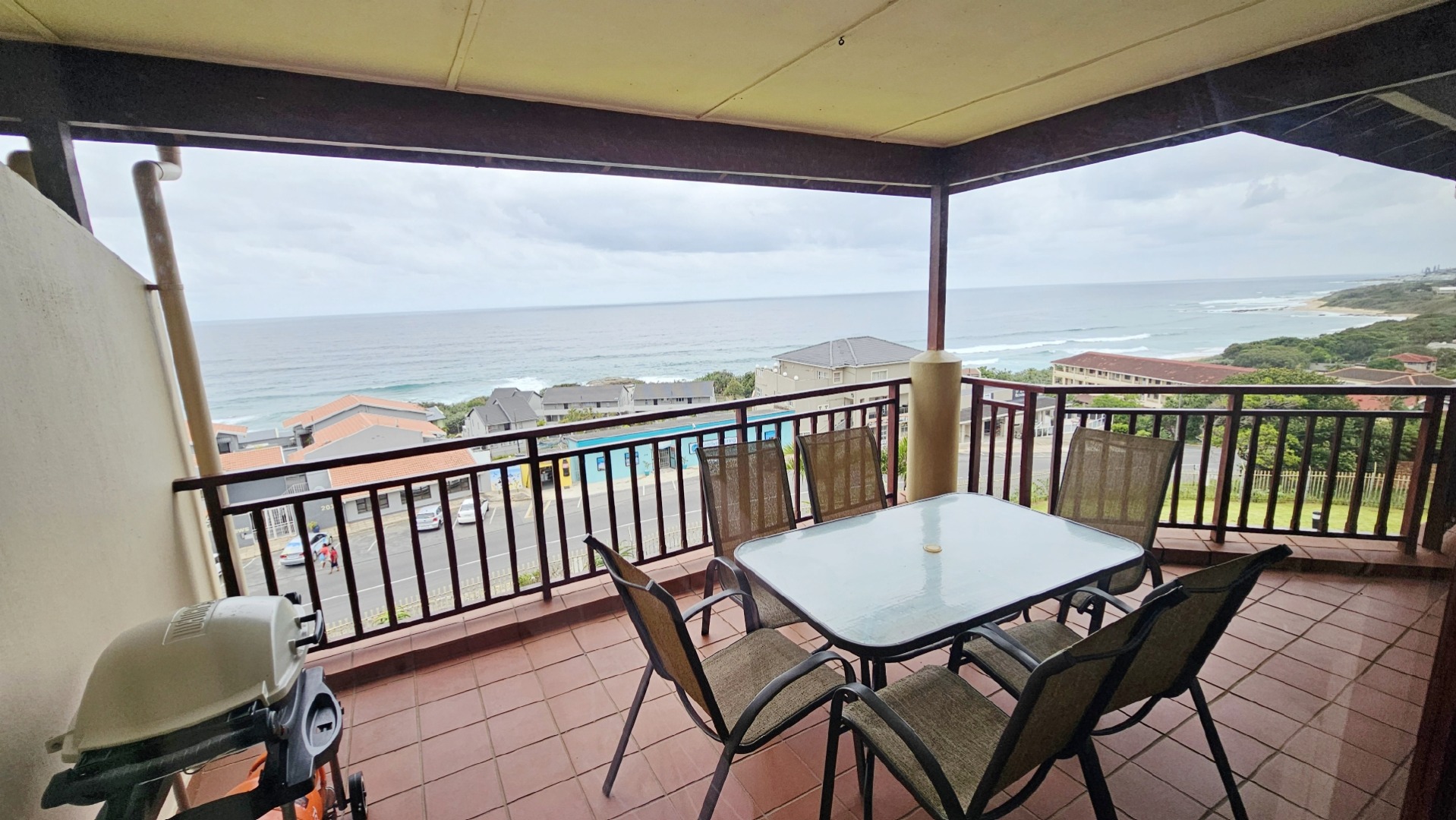 This inviting 3-bedroom, 2-bathroom apartment is nestled within a well-maintained complex in Ramsgate, offering an ideal coastal lifestyle. The property immediately impresses with its attractive entrance, featuring lush flowering vines and immaculately maintained gardens, leading to the communal swimming pool area. This is a top floor unit, with approximately 10 stairs. On entering the unit you are greeted by an open plan design, while the functional kitchen boasts dark granite countertops, stylish mahogany cabinetry and tiled floors, equipped with a double sink, stove with extractor fan, dishwasher, washing machine, and tumble dryer. Its open-plan design seamlessly connects to the dining room and lounge, fostering comfortable living and entertaining all while taking in endless sea views, throughout the home.