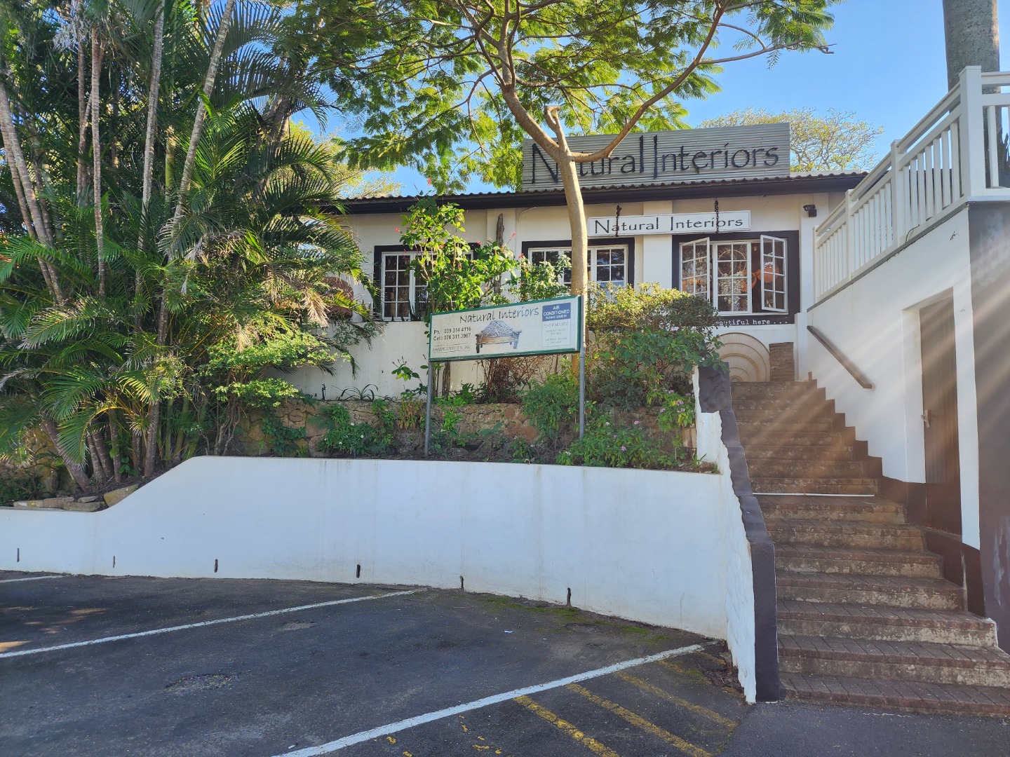 This distinguished commercial property, boasting a generous 3285 sqm erf, presents a captivating façade of classic white architecture, elegantly framed by dark trim and lush tropical landscaping, including majestic palm trees. Its prominent position directly off a main thoroughfare ensures exceptional visibility and effortless access, making it a beacon for discerning clientele.