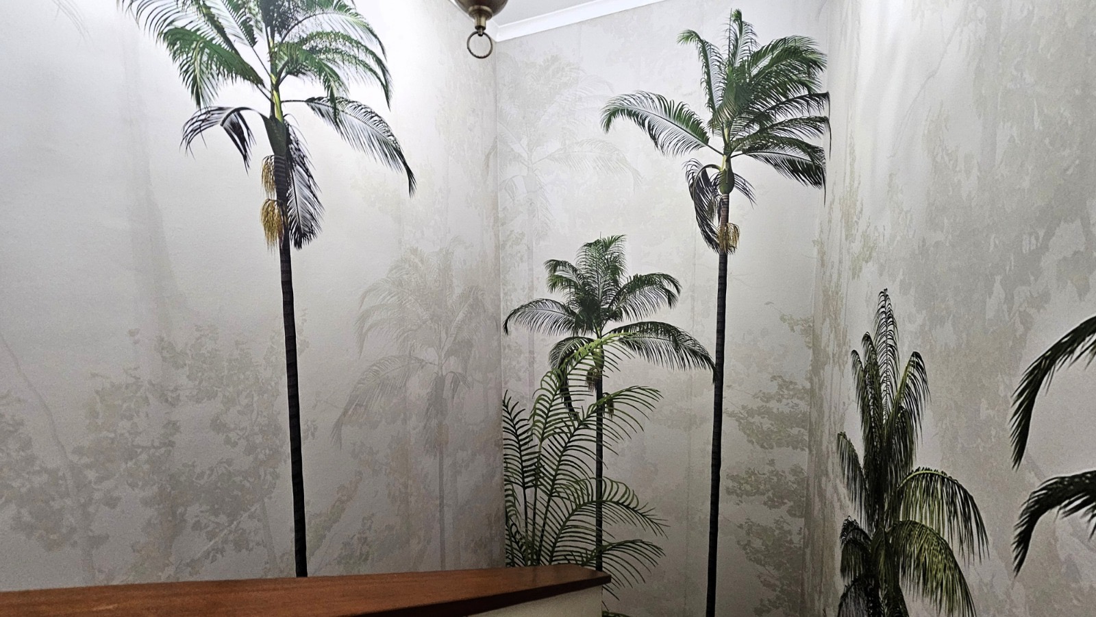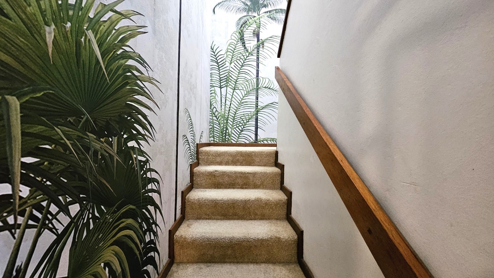 -Unique Decor Touches: Delight in the charming palm trees wallpaper that adorns the stairs, adding a touch of tropical elegance and personality to your home.