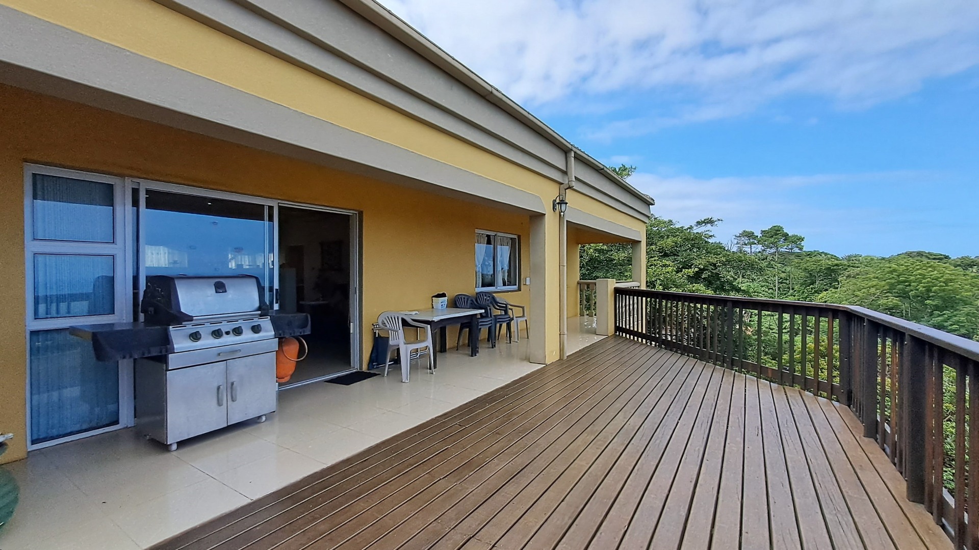 The first floor of the main residence welcomes you with an elegant entrance foyer leading to three spacious bedrooms, all tastefully designed—two of which open onto a private patio. A full bathroom and separate guest toilet ensure comfort and convenience. As you ascend the beautifully finished staircase, the upper level unveils a breathtaking open-plan living area, where seamless indoor-outdoor flow leads to a wide balcony with panoramic sea views. This space is ideal for entertaining, complete with a built-in gas braai and expansive relaxation zones.
