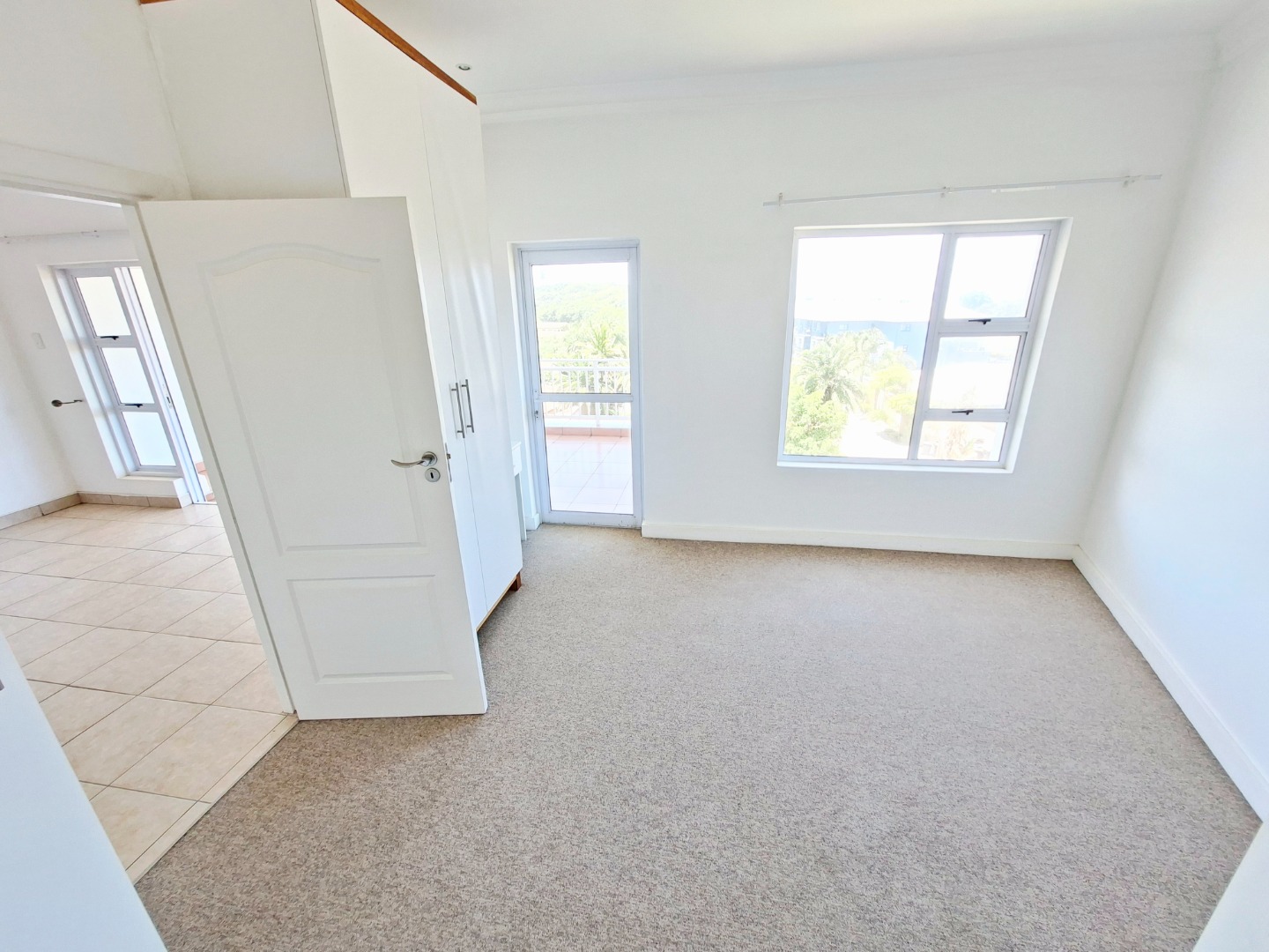 Both bedrooms are designed for comfort, featuring neutral white walls and soft, neutral-toned carpeting. The main bedroom includes direct access to an en-suite bathroom and offers ample storage with built-in wardrobes and a dedicated desk area. The second bathroom serves guests and the additional bedroom, ensuring convenience for all residents.