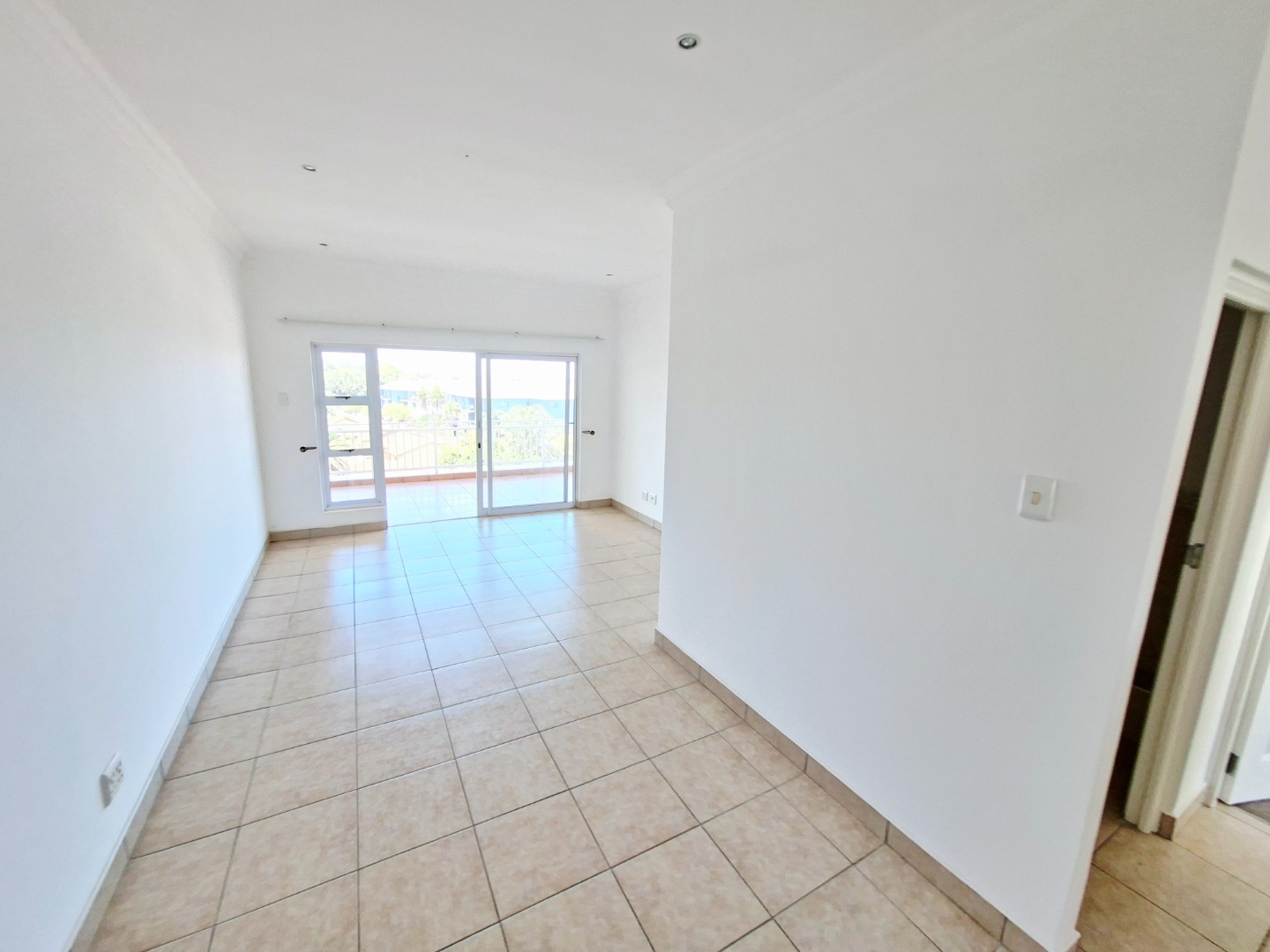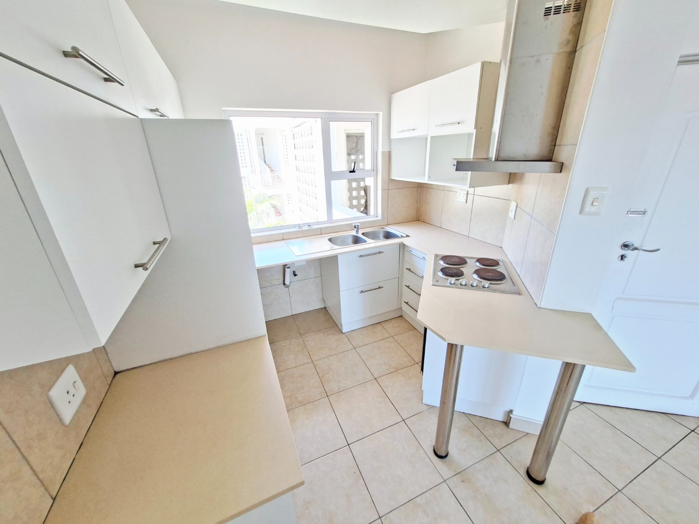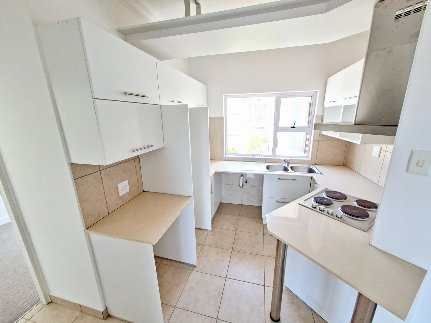 The interior features a well-appointed lounge area that flows seamlessly, enhanced by abundant natural light from large glass sliding doors. The modern kitchen boasts sleek white cabinetry, granite countertops, a double sink, and an integrated electric hob with an extractor fan, providing a functional space for culinary pursuits. Tiled flooring throughout the living areas ensures easy maintenance and a clean aesthetic.