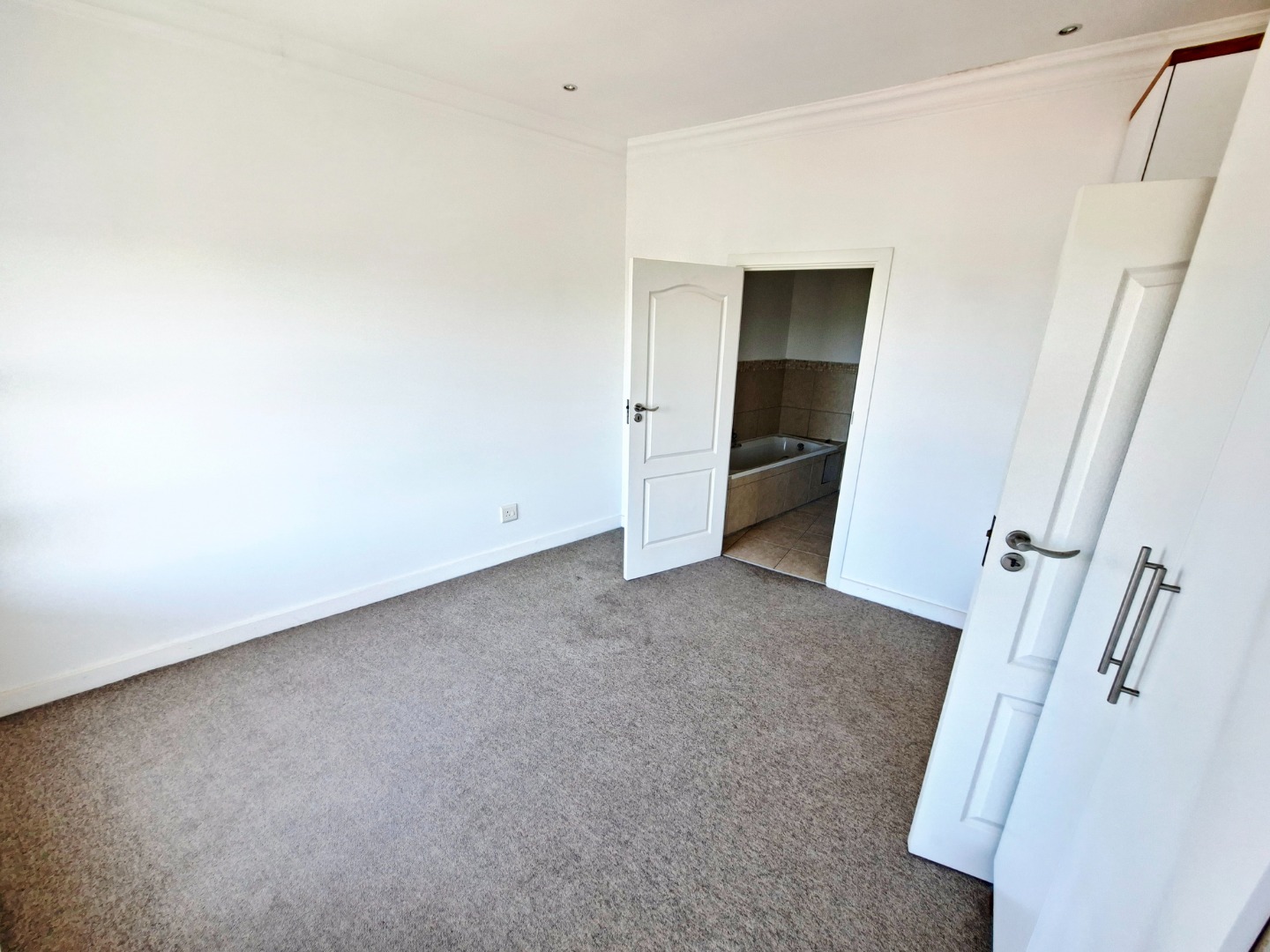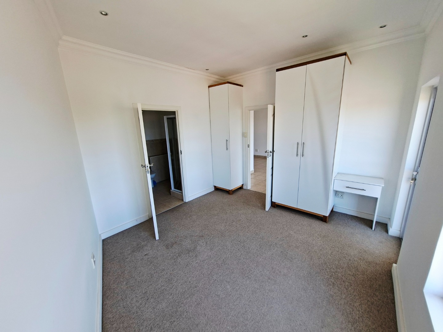 Both bedrooms are designed for comfort, featuring neutral white walls and soft, neutral-toned carpeting. The main bedroom includes direct access to an en-suite bathroom and offers ample storage with built-in wardrobes and a dedicated desk area. The second bathroom serves guests and the additional bedroom, ensuring convenience for all residents.