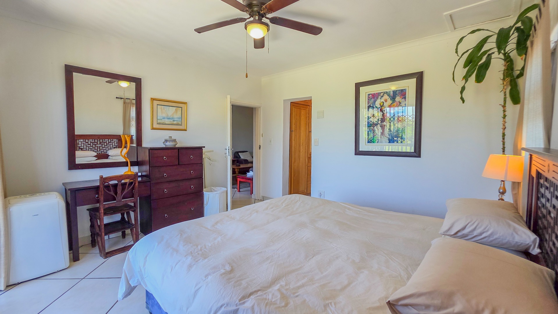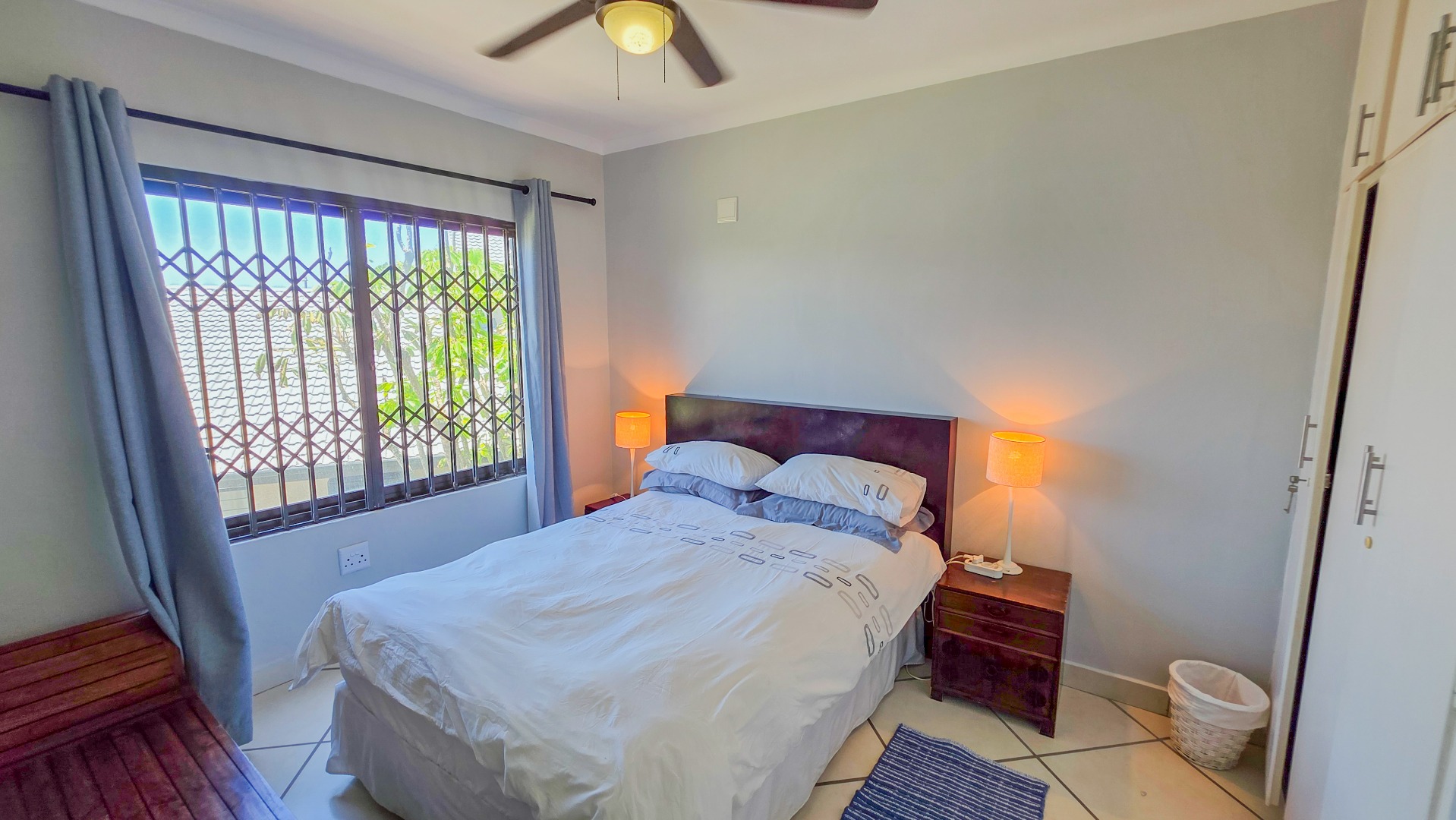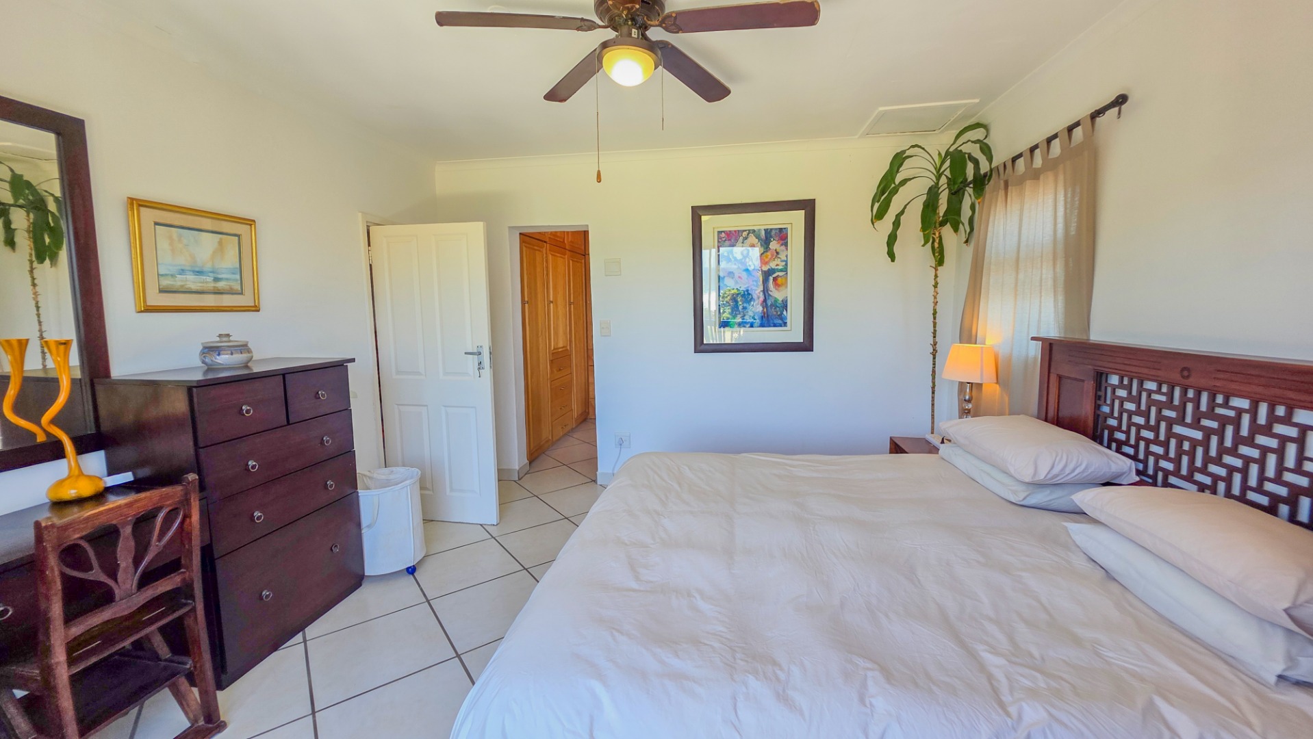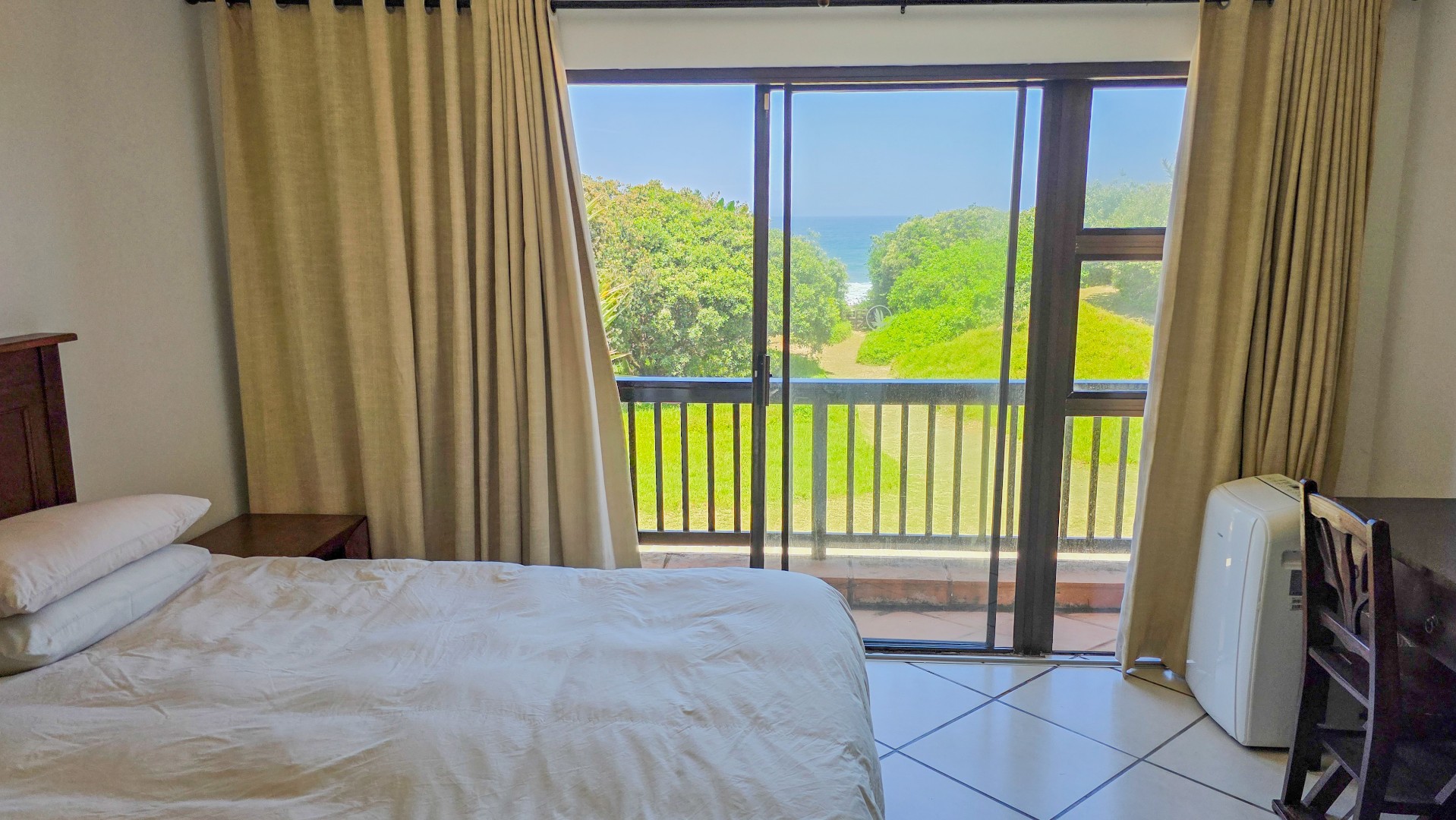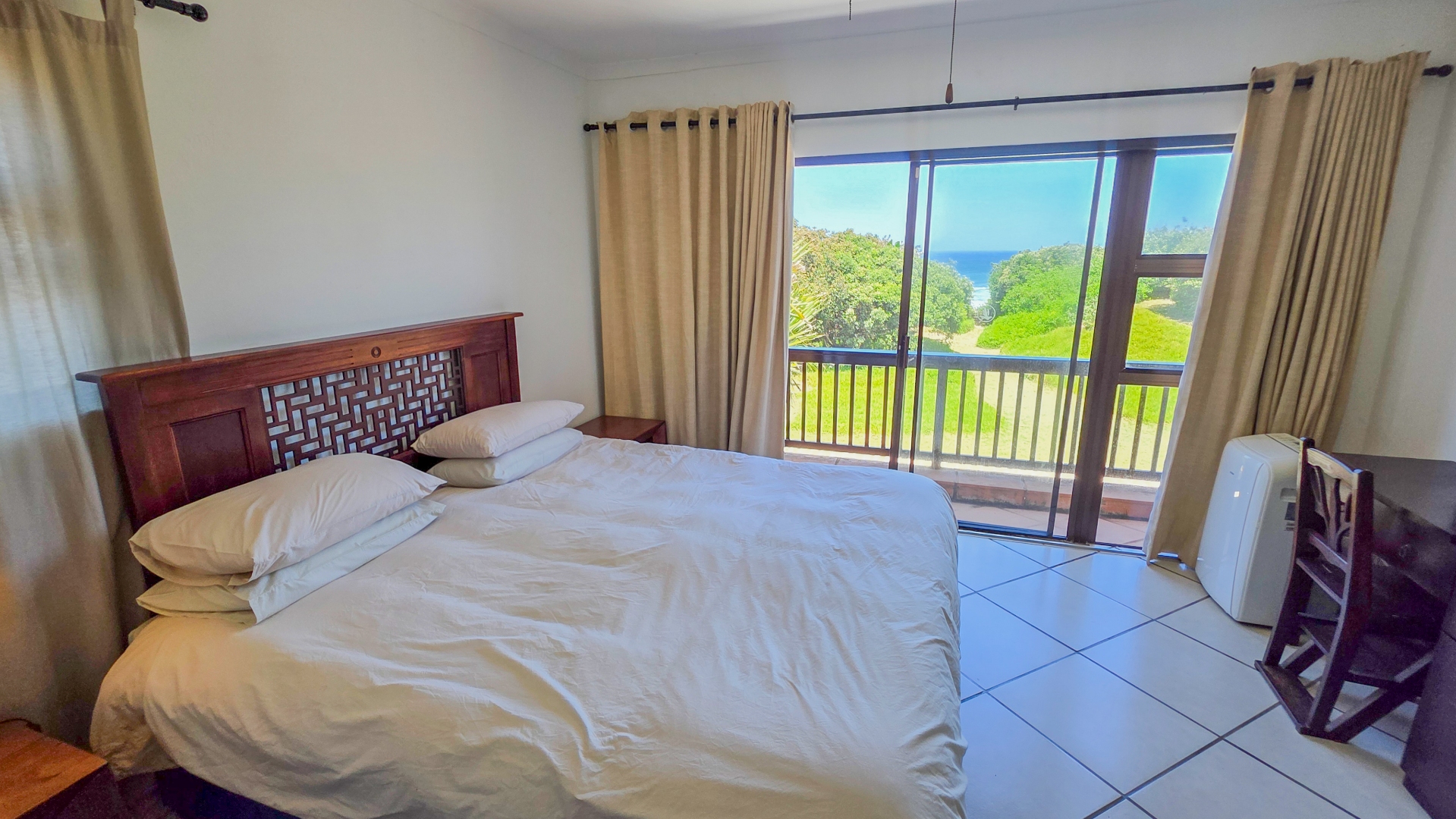 The main bedroom offers privacy and comfort, fitted with built in cupboards and a ceiling fan. Sliding doors open onto a private balcony with the same sea views enjoyed from the lounge. The en suite bathroom features a corner bath, shower, basin, and toilet with clean, modern finishes.