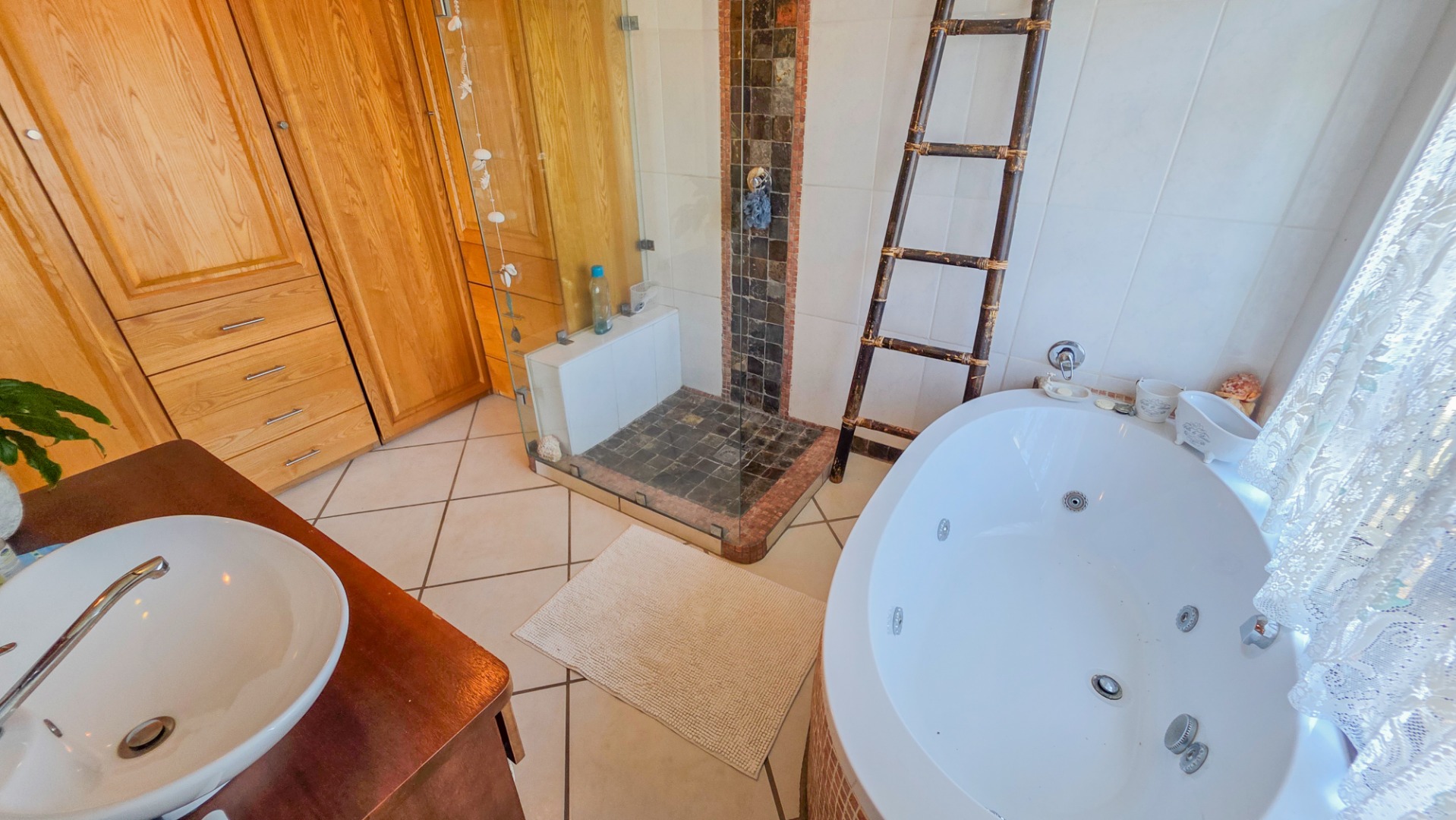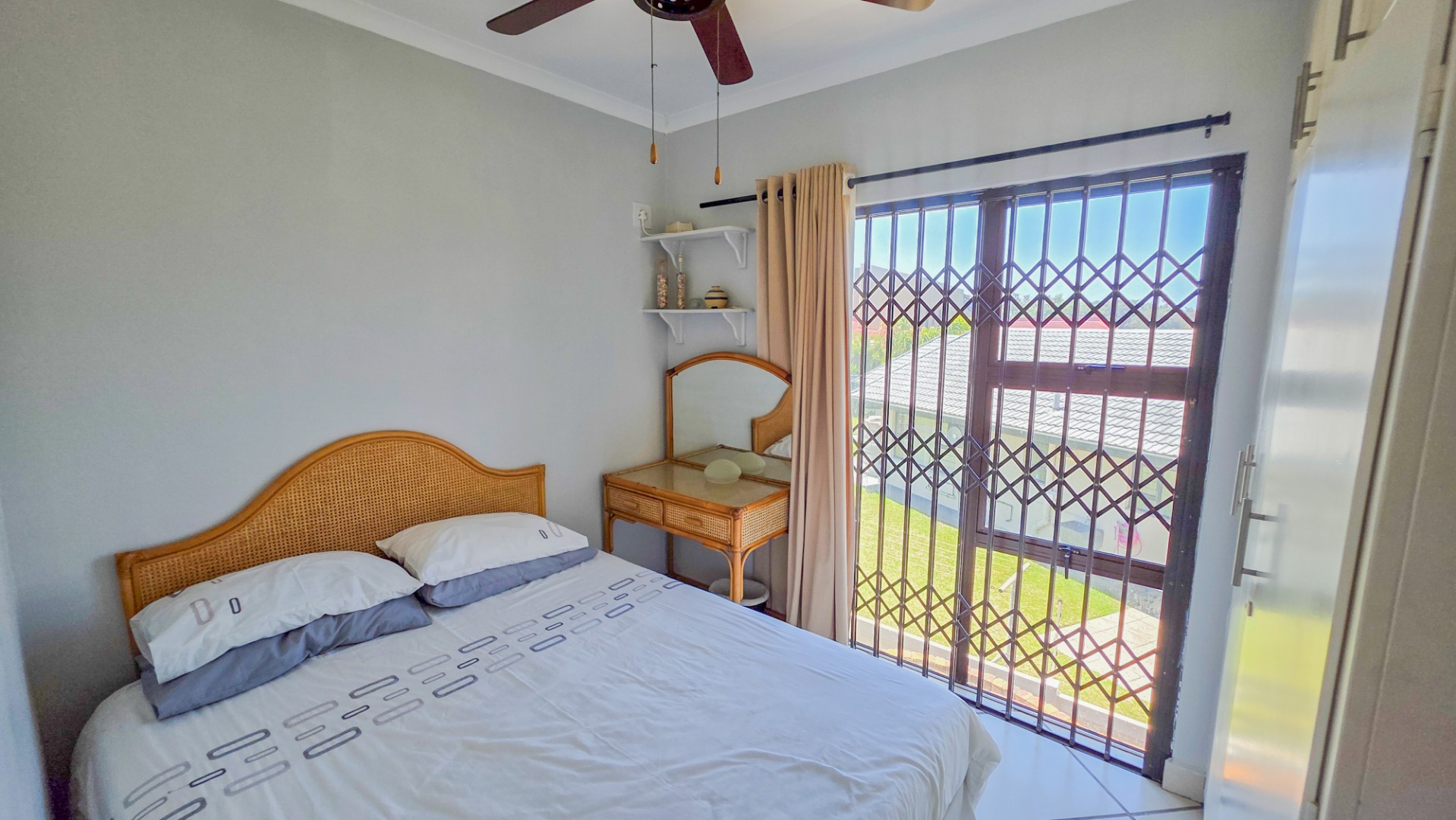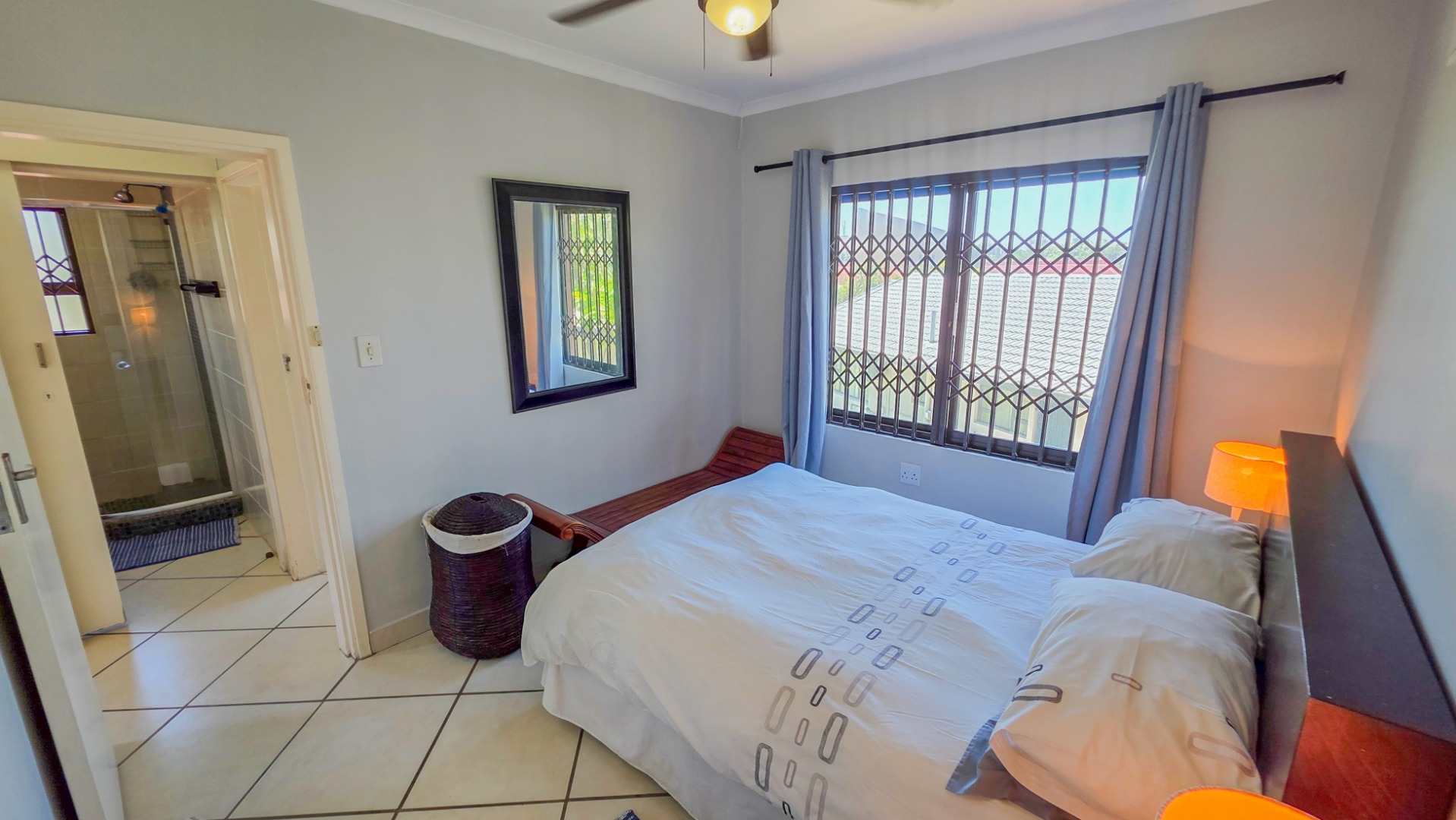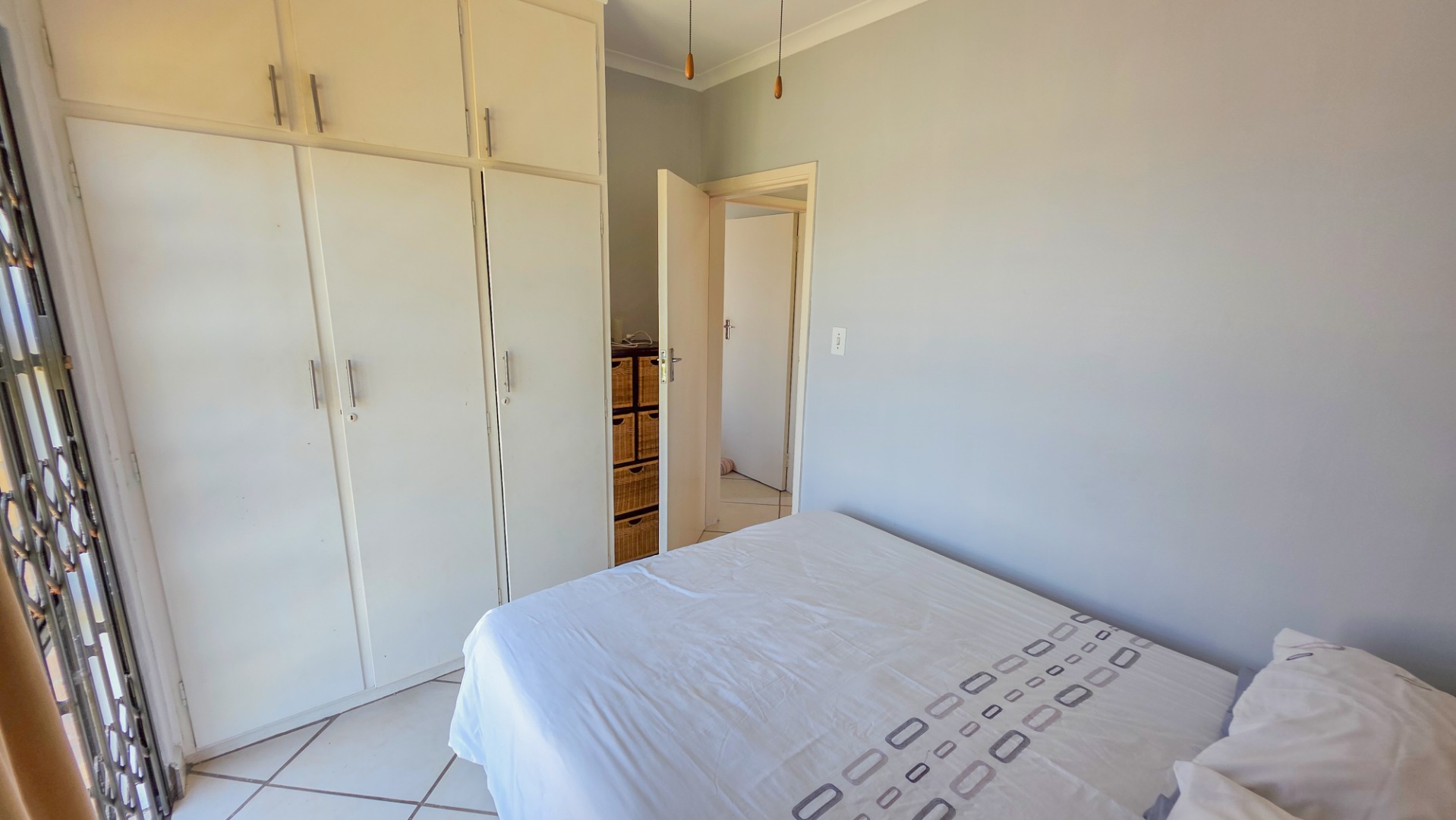 The main bedroom offers privacy and comfort, fitted with built in cupboards and a ceiling fan. Sliding doors open onto a private balcony with the same sea views enjoyed from the lounge. The en suite bathroom features a corner bath, shower, basin, and toilet with clean, modern finishes.