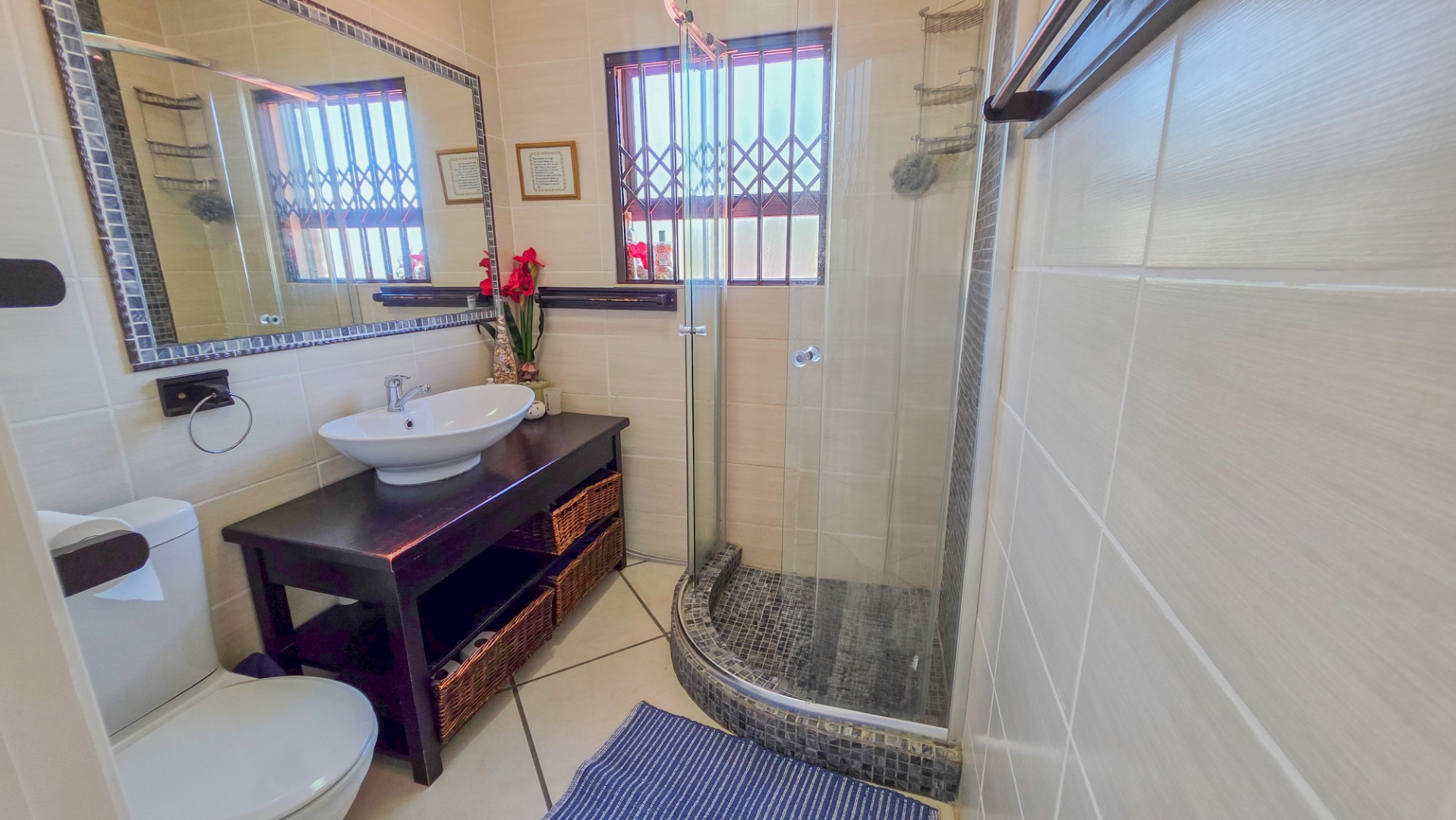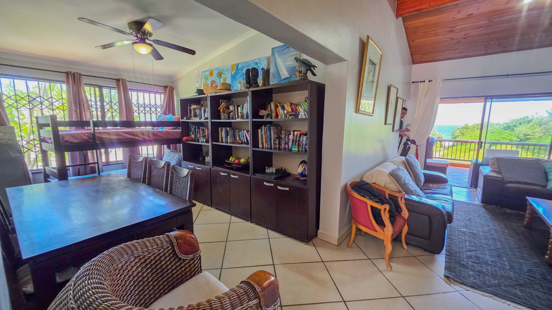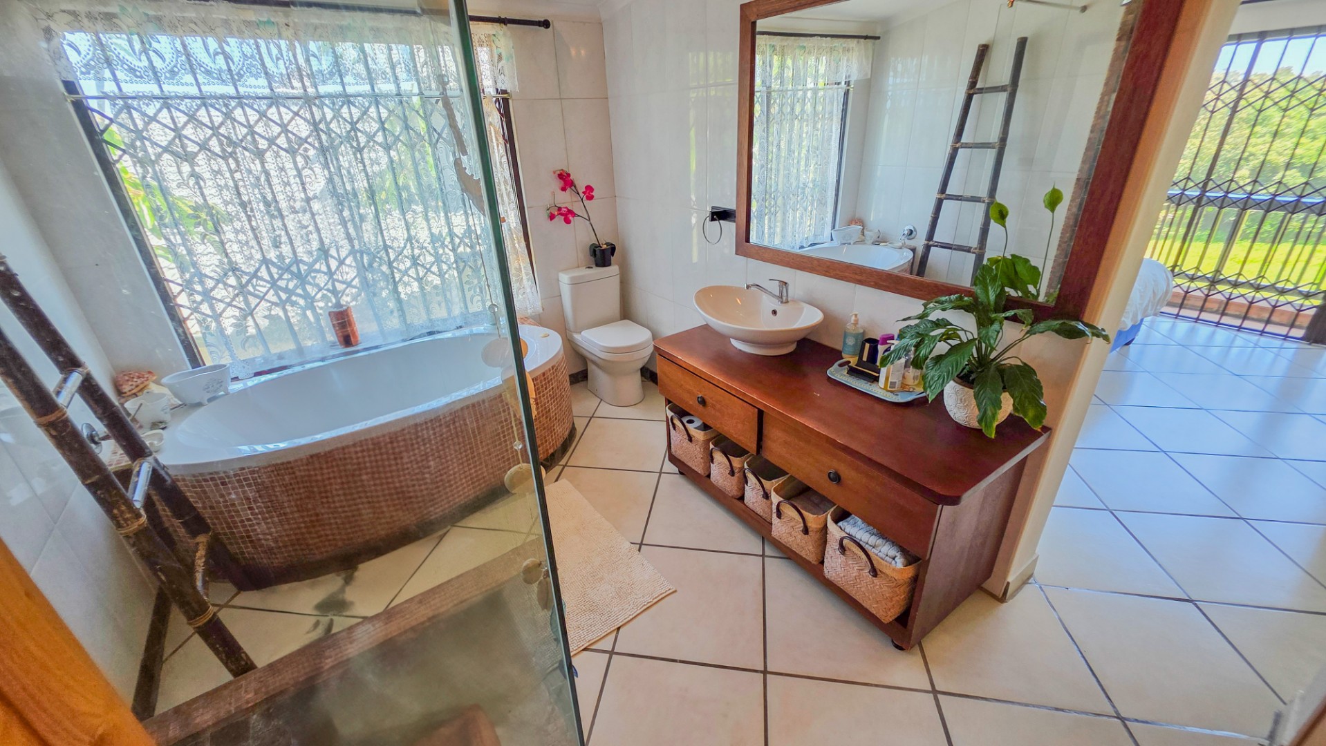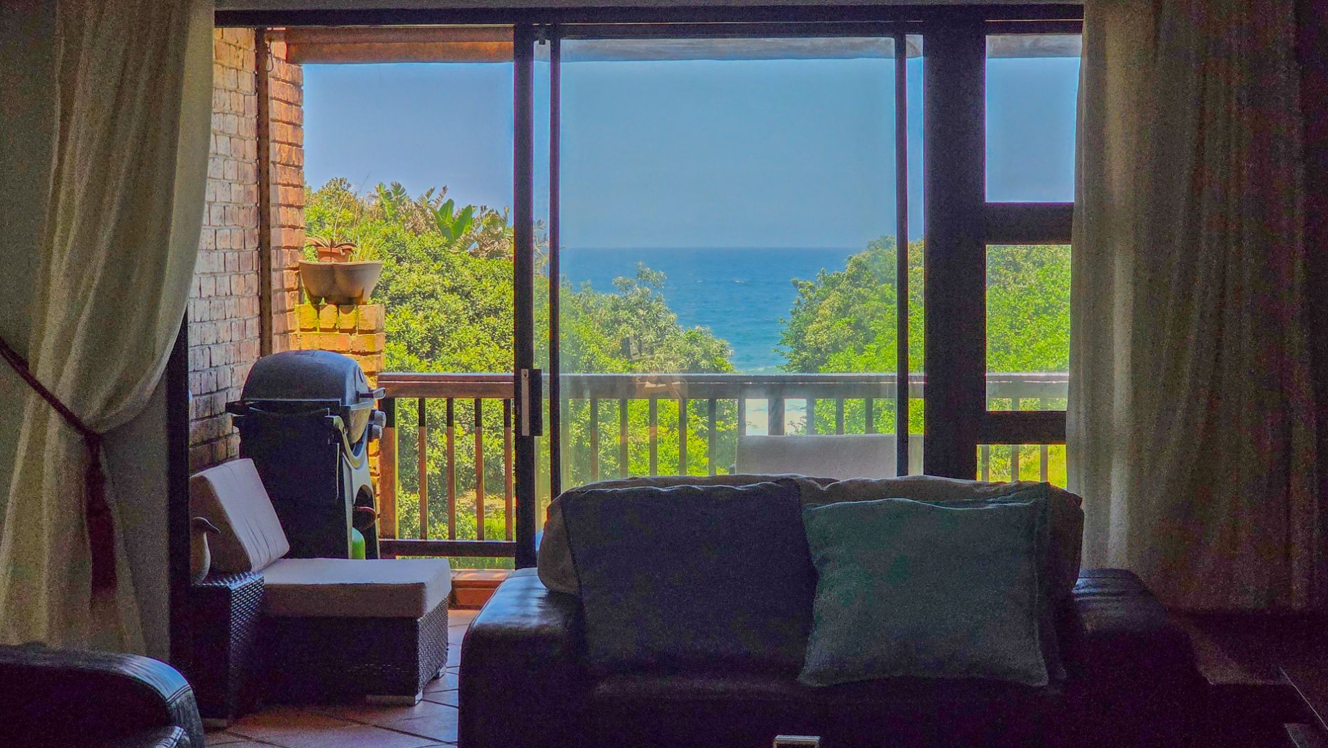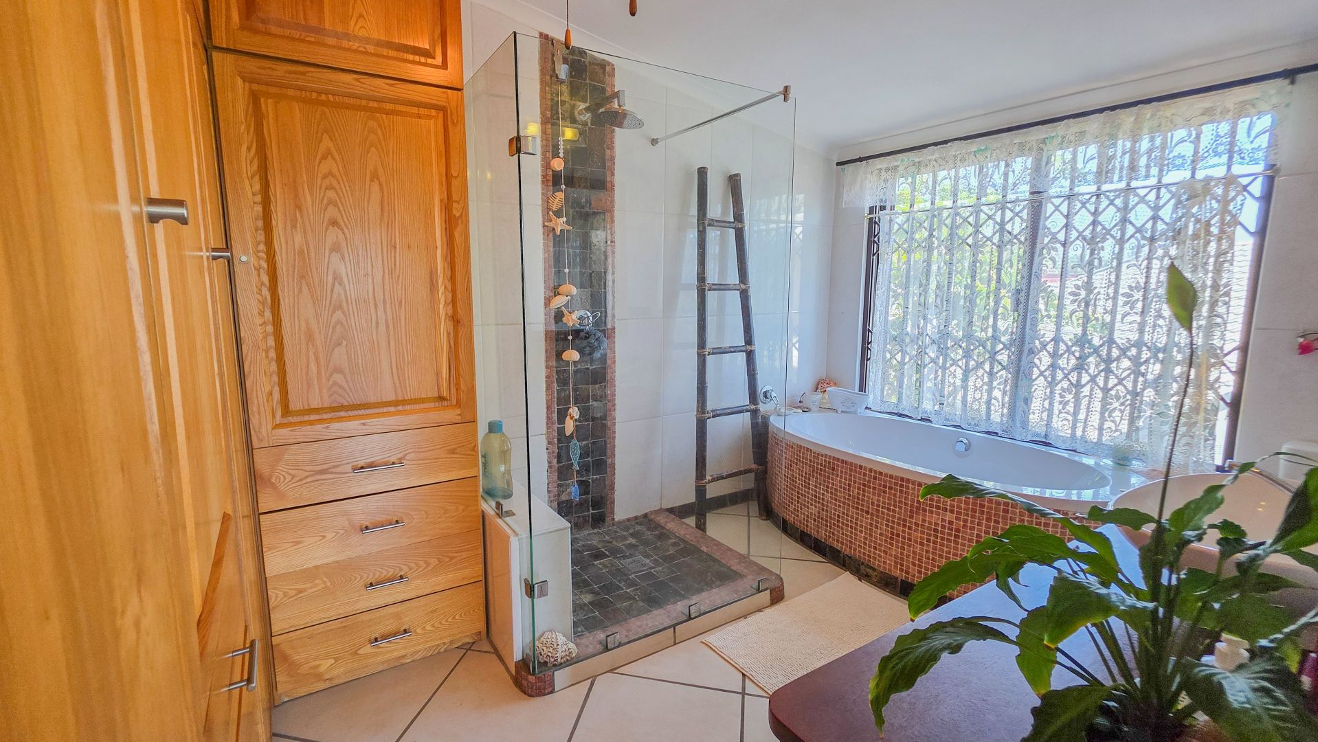 The main bedroom offers privacy and comfort, fitted with built in cupboards and a ceiling fan. Sliding doors open onto a private balcony with the same sea views enjoyed from the lounge. The en suite bathroom features a corner bath, shower, basin, and toilet with clean, modern finishes.