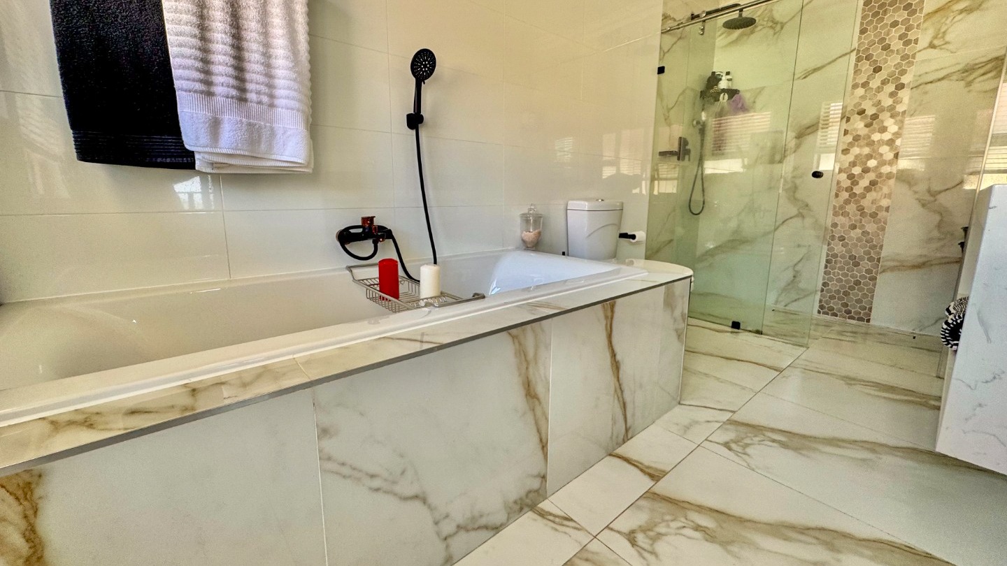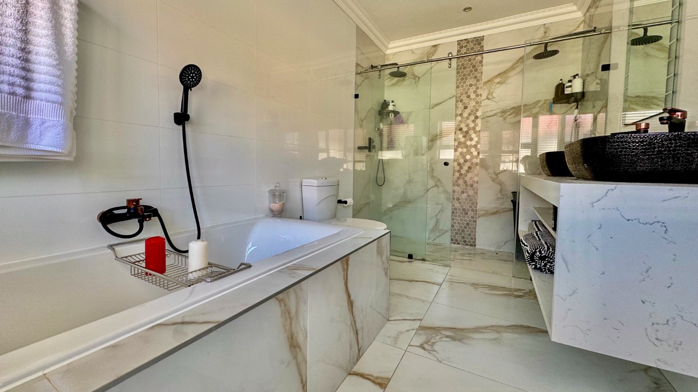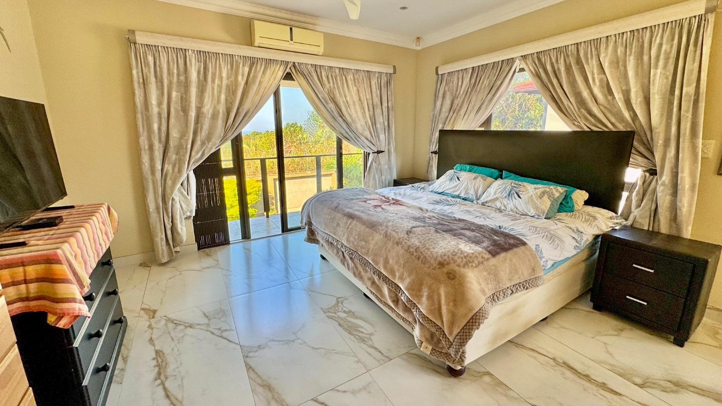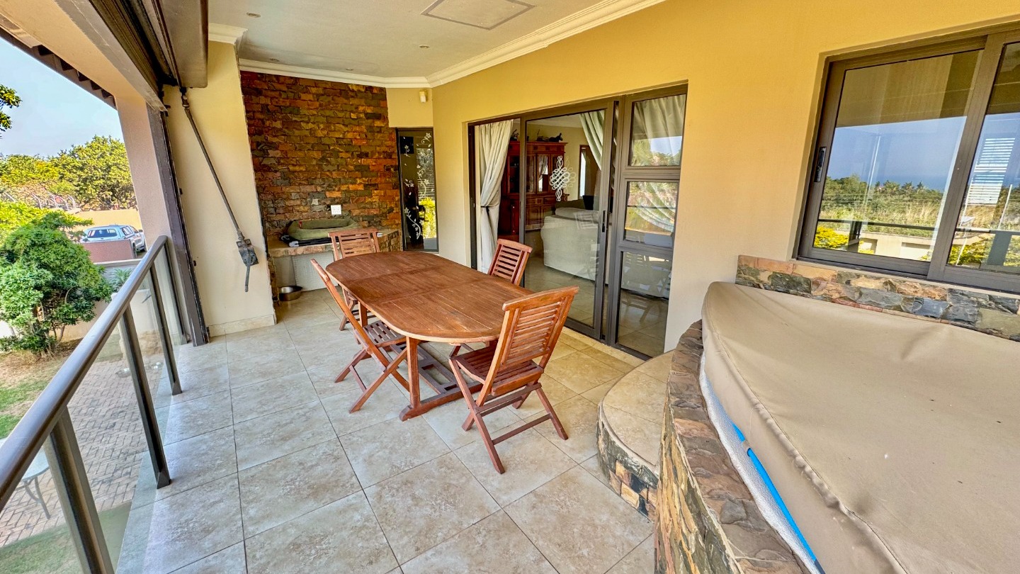 Upstairs, a second lounge and sleek bar area create a relaxed entertainment zone that opens onto a generous balcony with a built in braai and jacuzzi. Here, elevated sea views set the tone for slow mornings and relaxed evenings. The main bedroom forms a private retreat with a luxurious en suite and its own balcony, while two additional bedrooms and a spacious family bathroom complete the upper level.