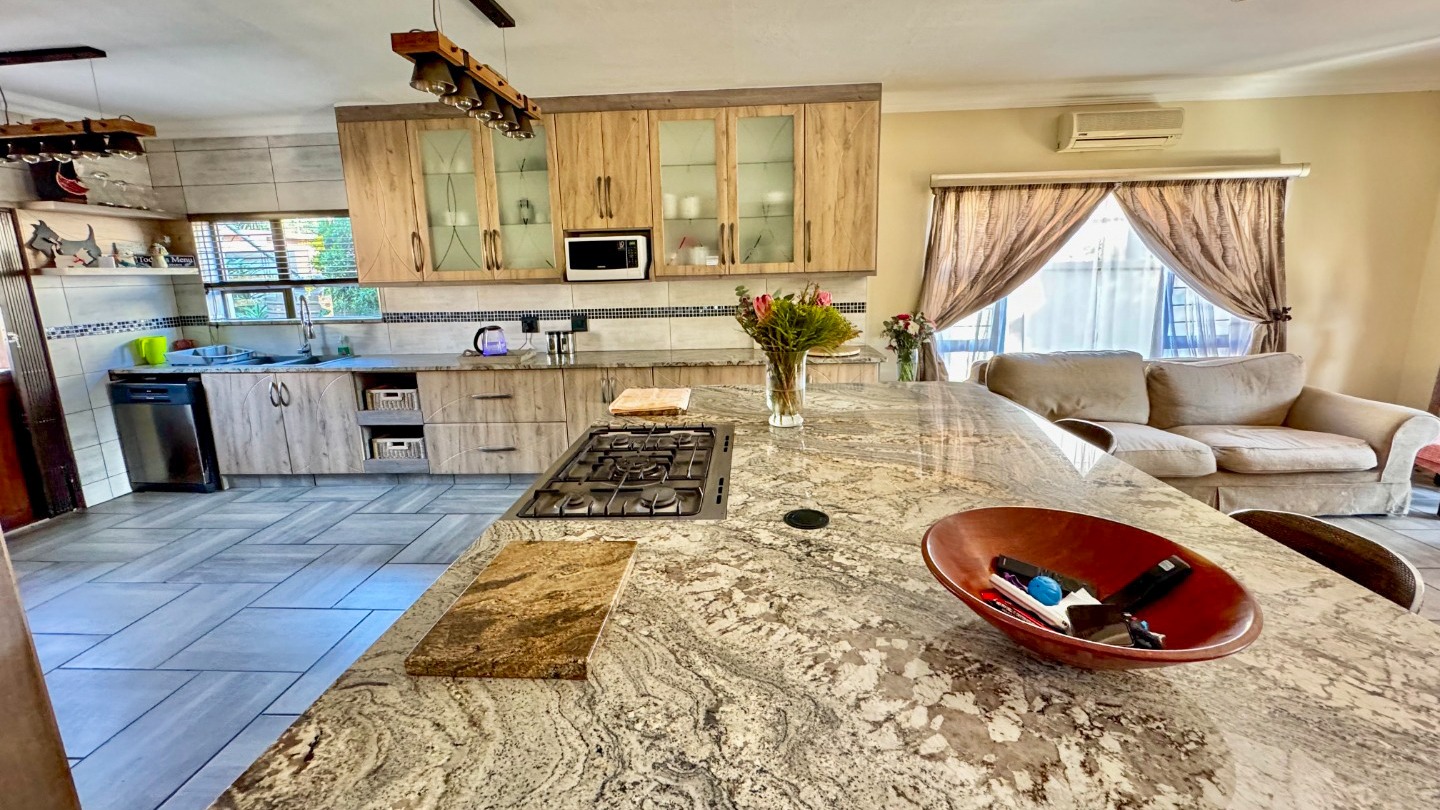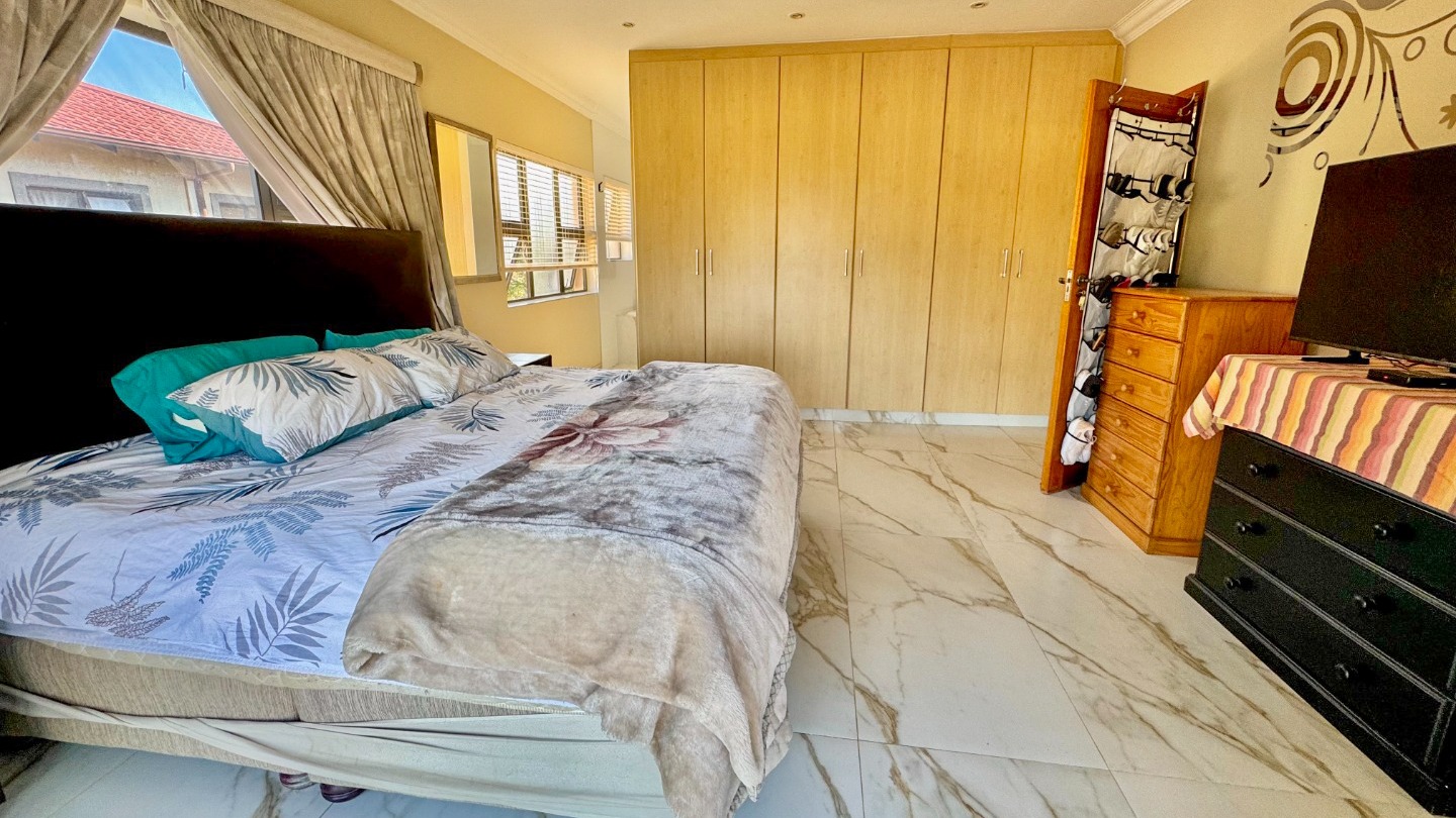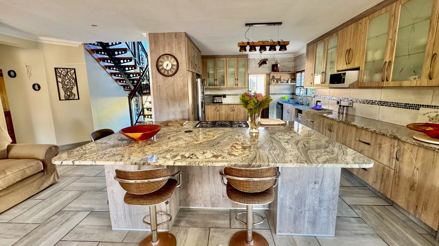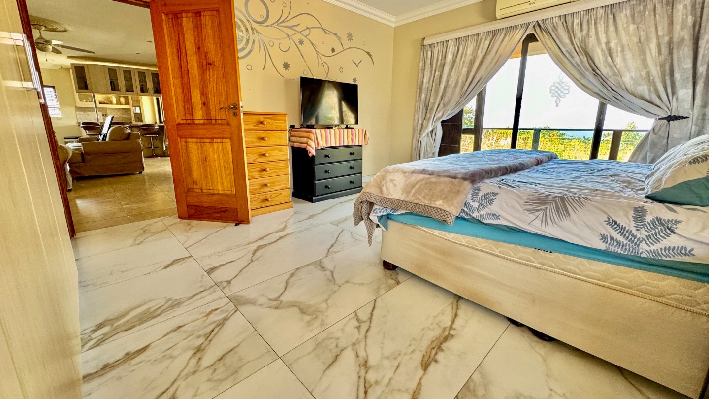 Upstairs, a second lounge and sleek bar area create a relaxed entertainment zone that opens onto a generous balcony with a built in braai and jacuzzi. Here, elevated sea views set the tone for slow mornings and relaxed evenings. The main bedroom forms a private retreat with a luxurious en suite and its own balcony, while two additional bedrooms and a spacious family bathroom complete the upper level.