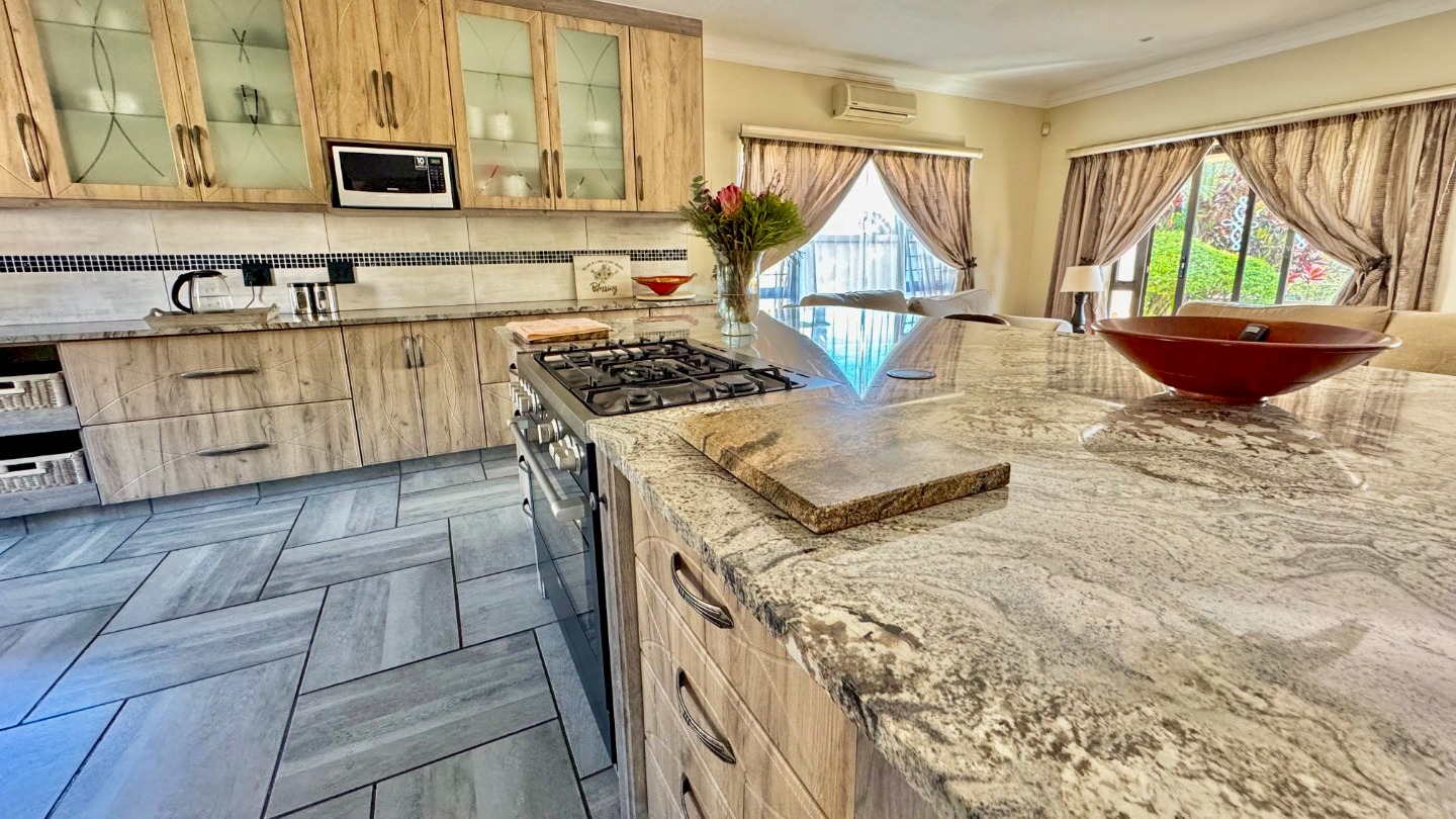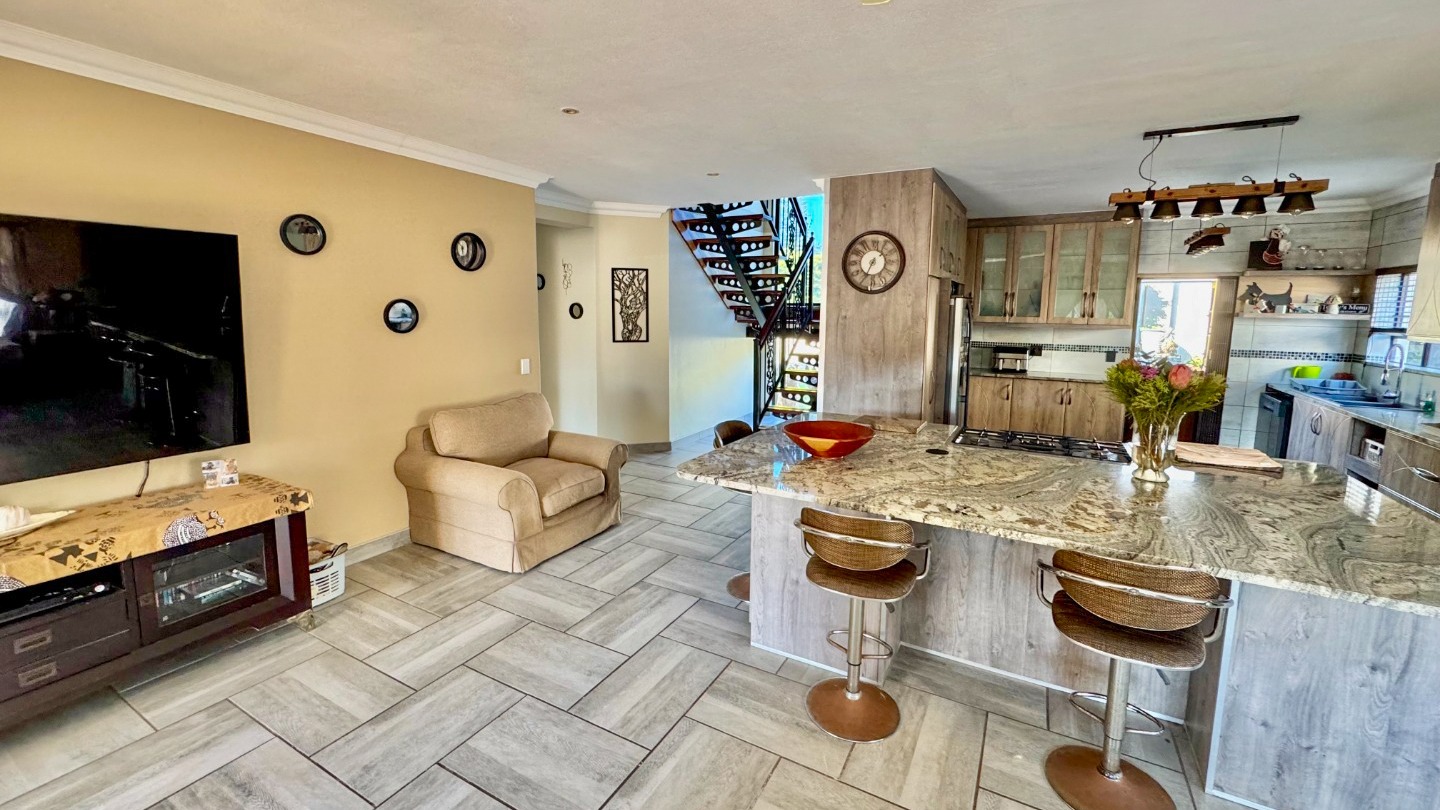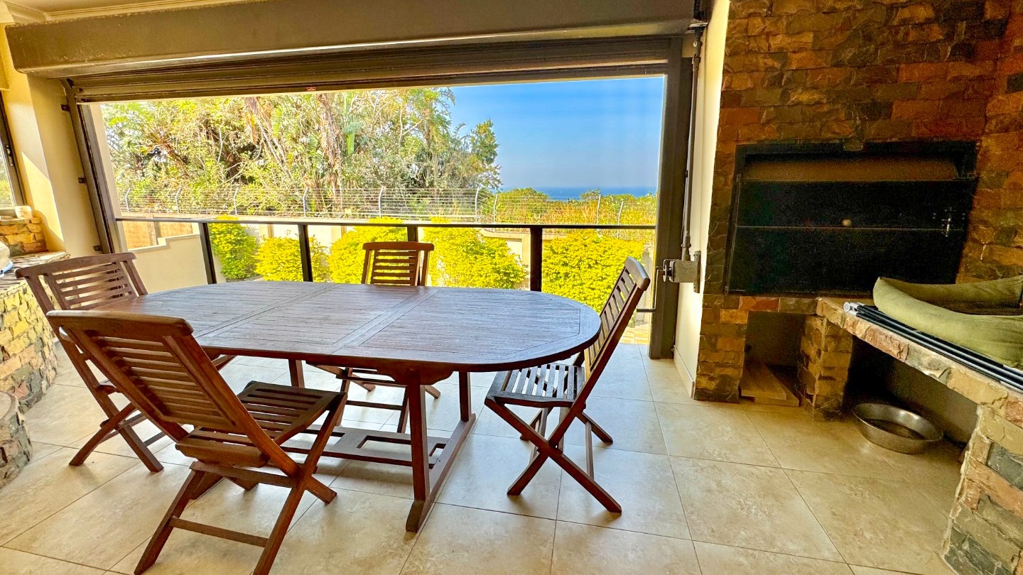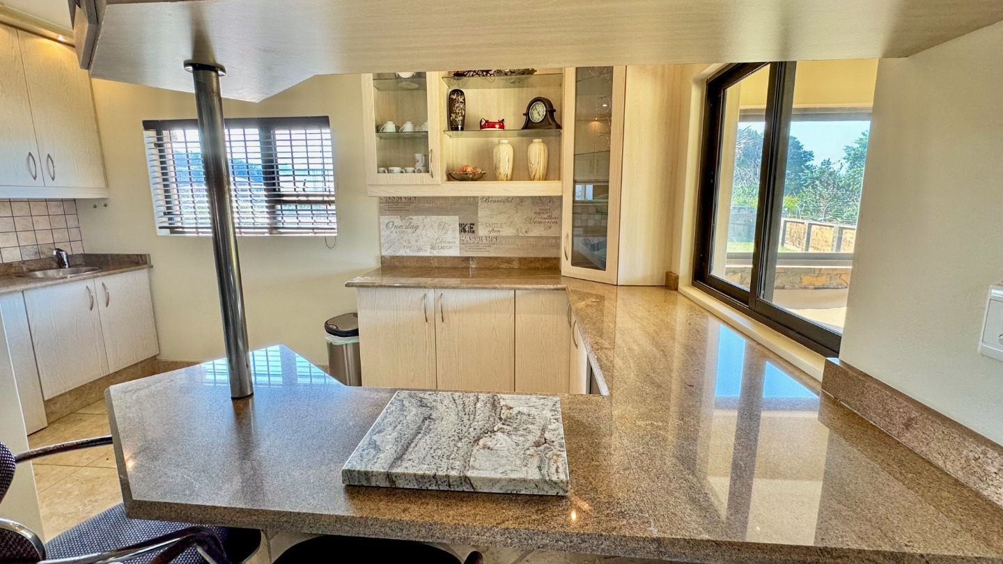 Upstairs, a second lounge and sleek bar area create a relaxed entertainment zone that opens onto a generous balcony with a built in braai and jacuzzi. Here, elevated sea views set the tone for slow mornings and relaxed evenings. The main bedroom forms a private retreat with a luxurious en suite and its own balcony, while two additional bedrooms and a spacious family bathroom complete the upper level.