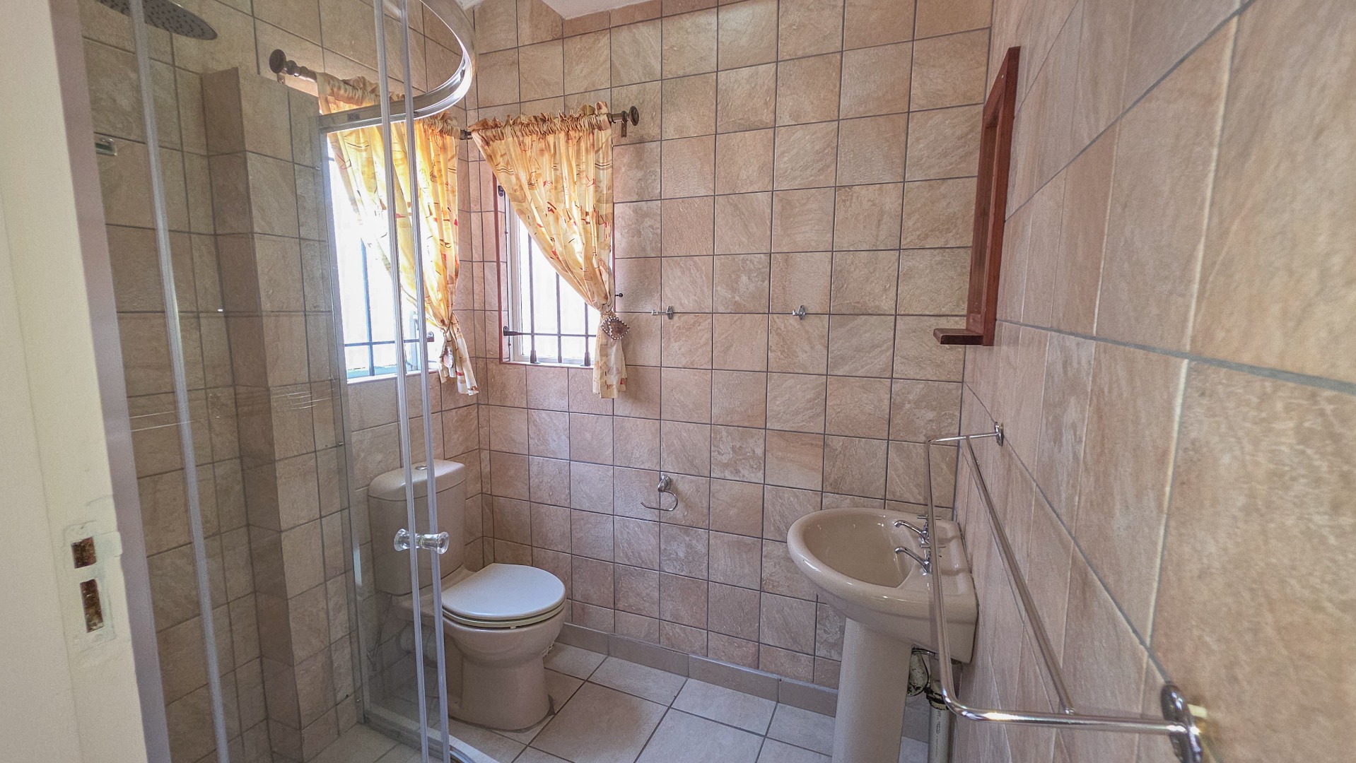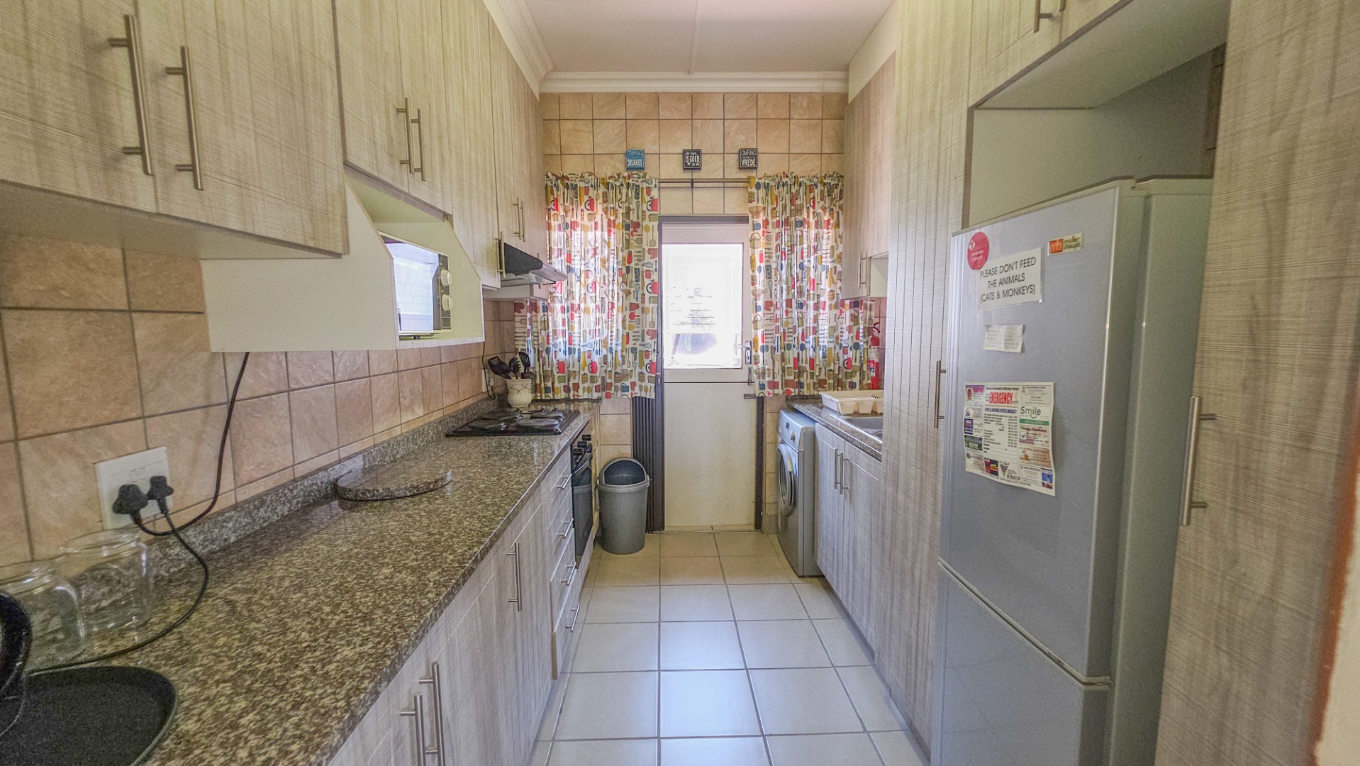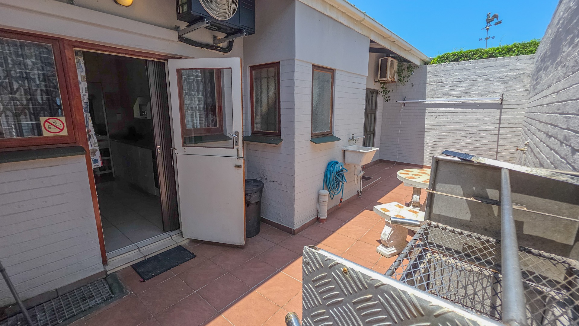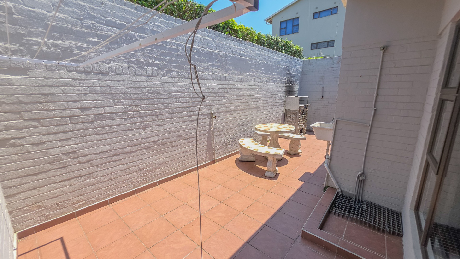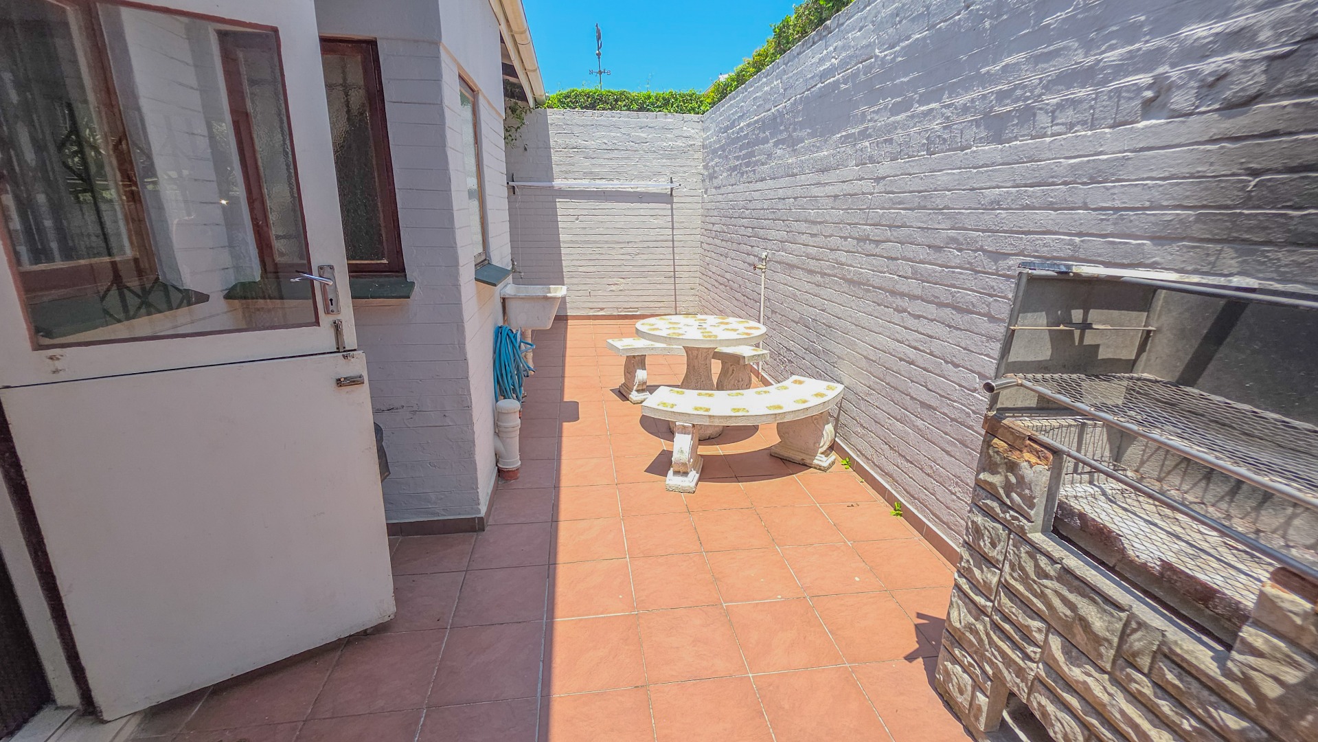 The kitchen has neat finishes and practical storage, with doors leading out to a private courtyard featuring a built in braai, creating a convenient space for casual entertaining or quiet outdoor time.