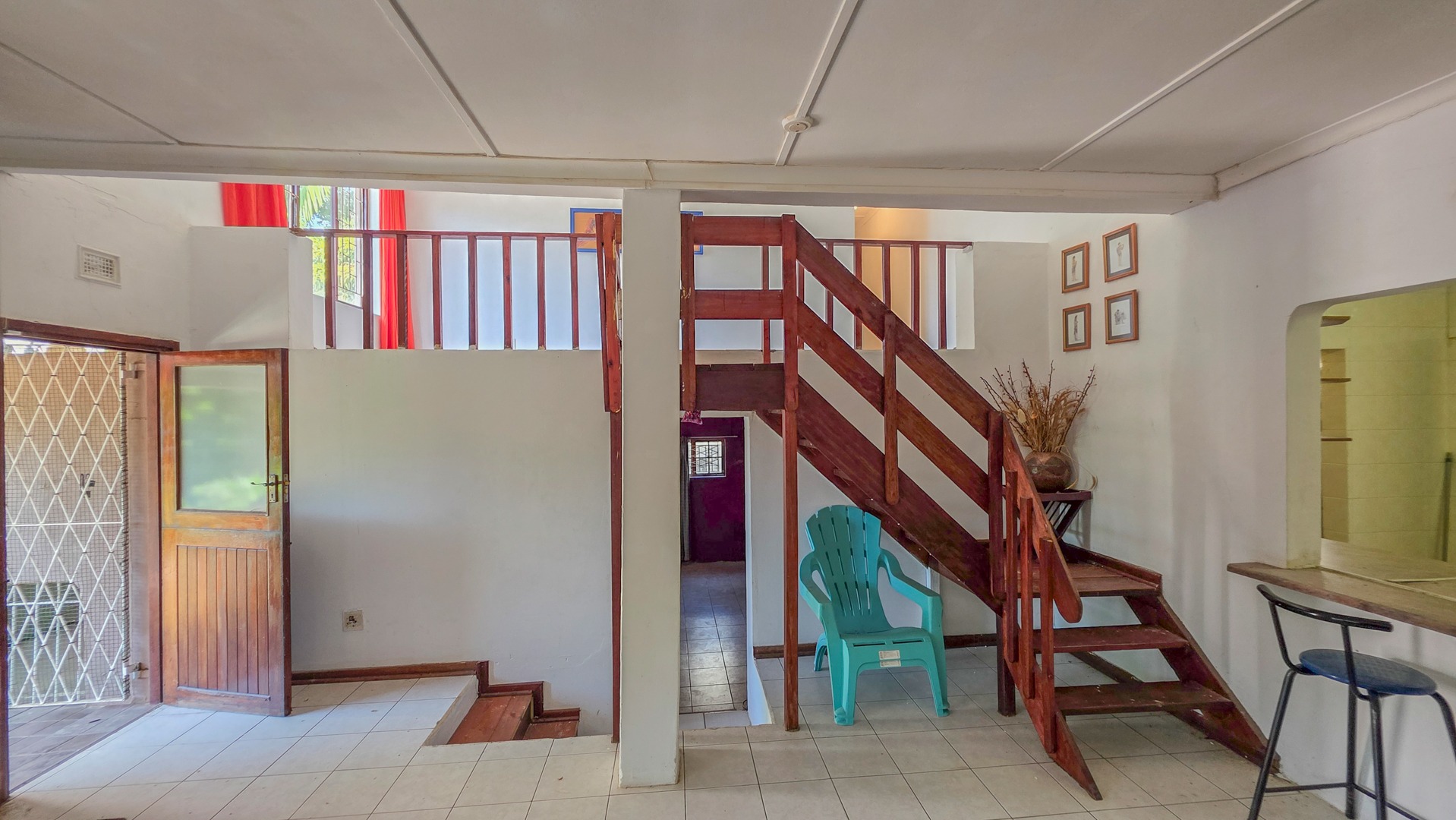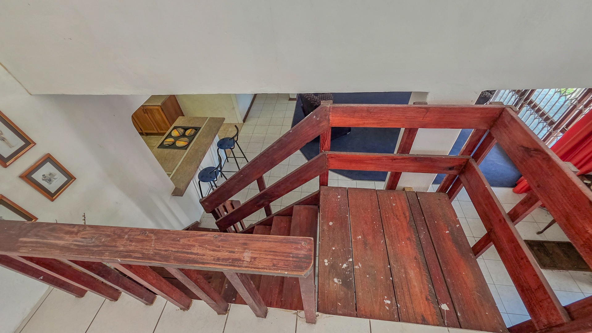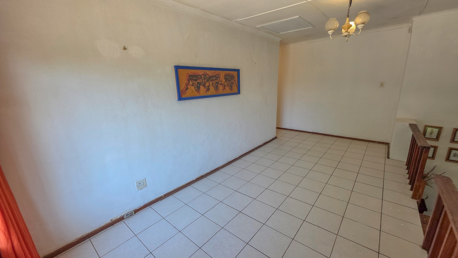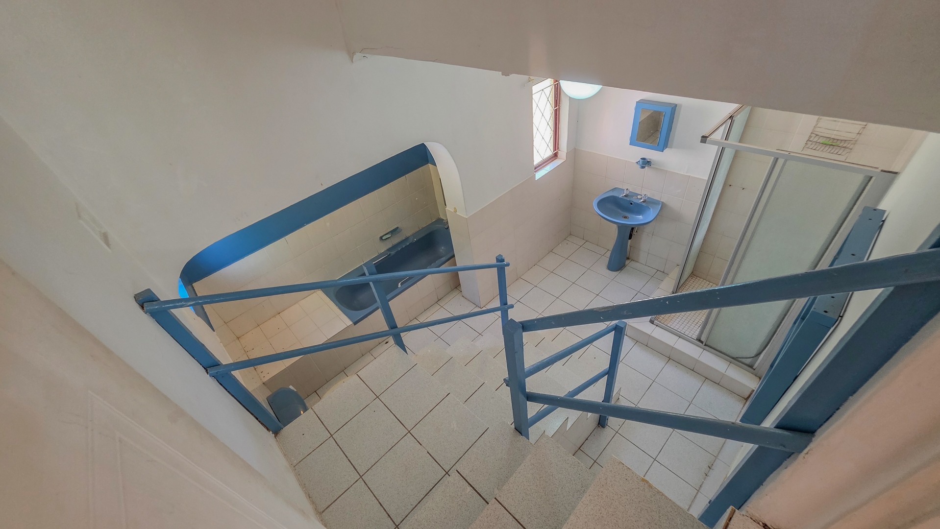 The main bedroom sits upstairs. You get built in cupboards, a private lounge and a patio with a clear view over the property. The upstairs bathroom sits a few steps down from the landing and includes a bath, toilet and basin. The outdoor area offers strong value. The pool sits next to a large entertainment space with built in braai facilities. The front yard gives you open space for recreation or future plans.