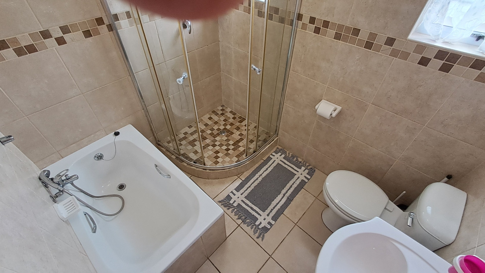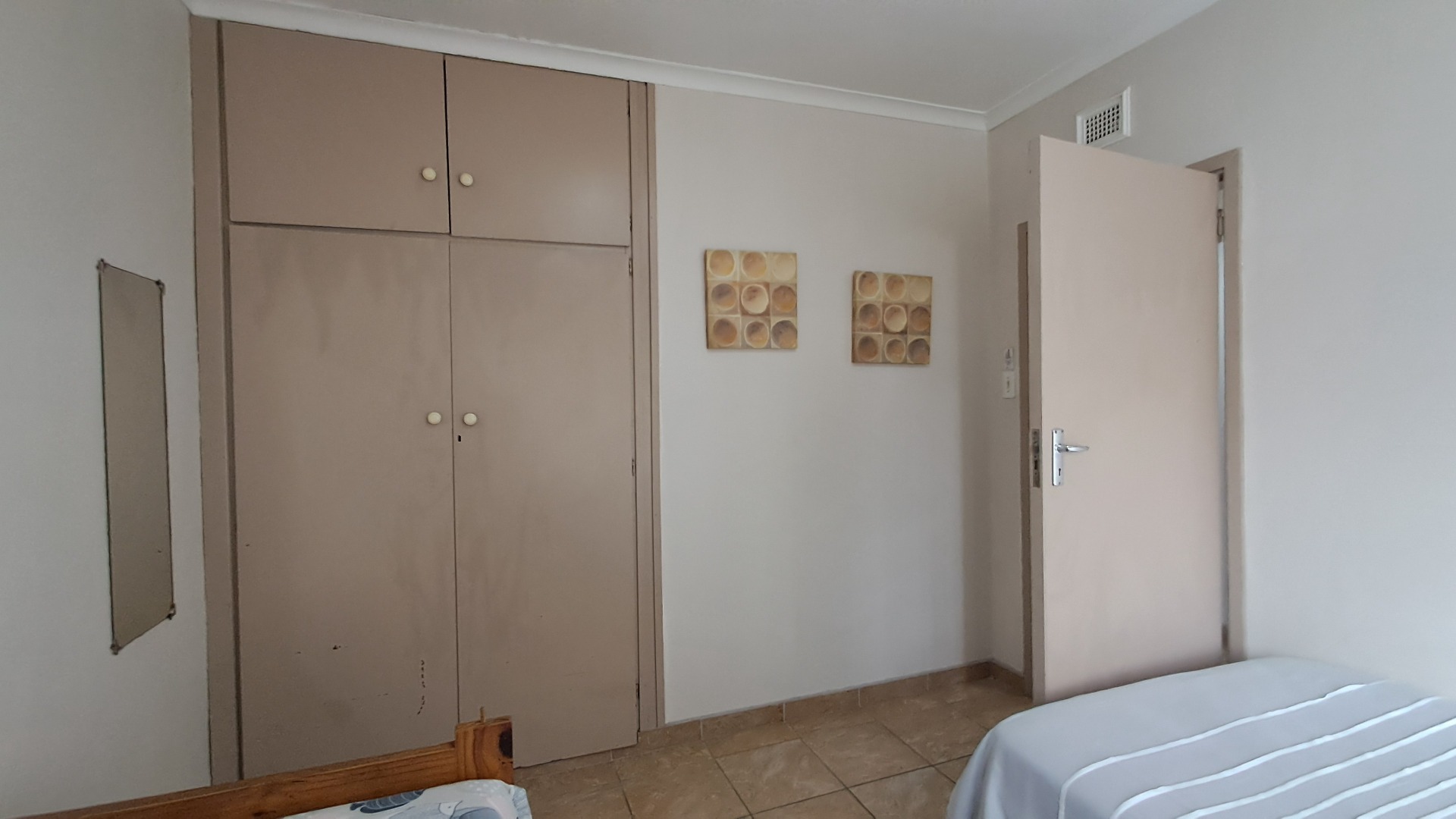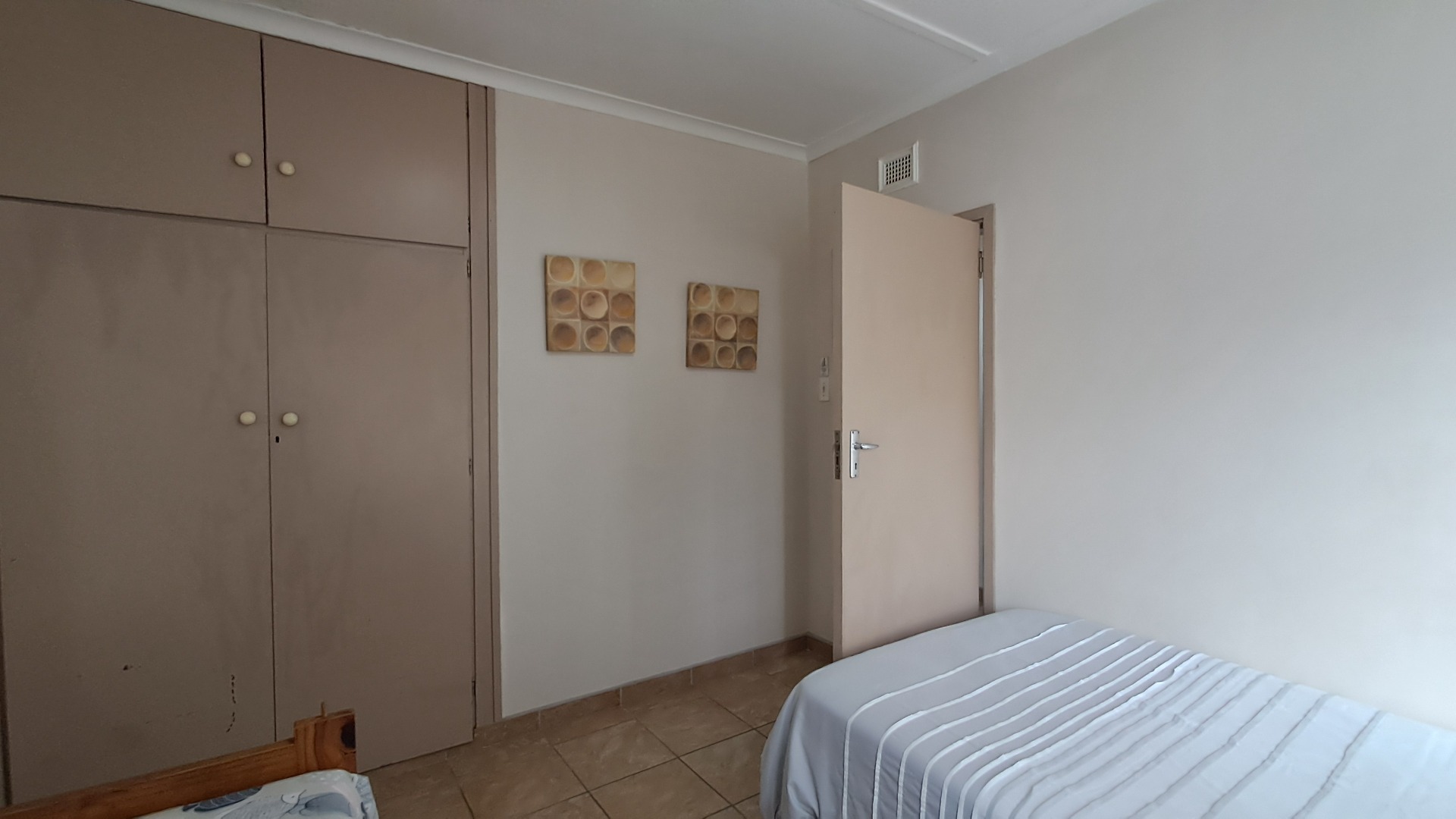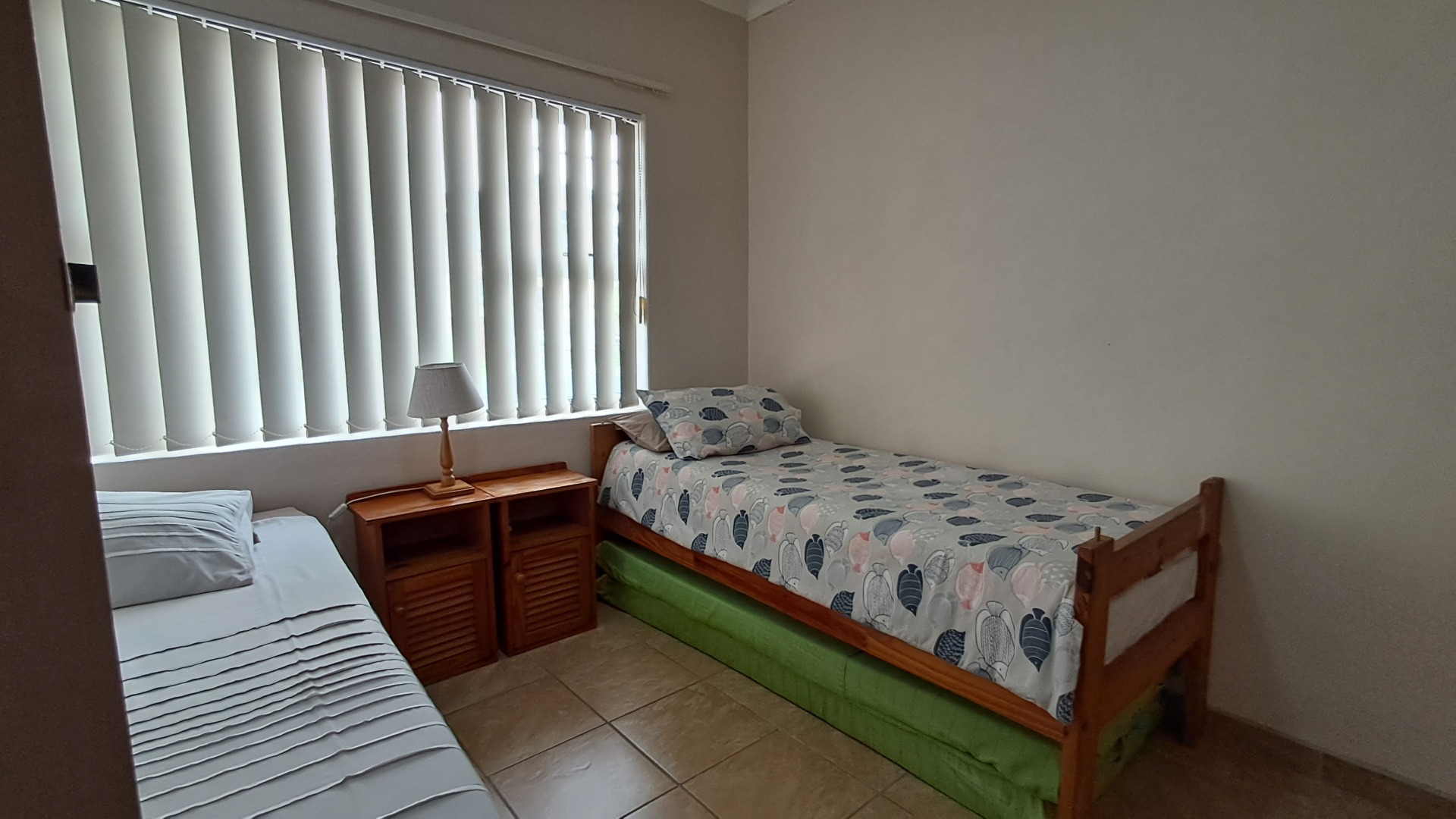 The beautifully tiled bathrooms consist of a bath shower and basin, situated in the short passage, conveniently close to both bedrooms.