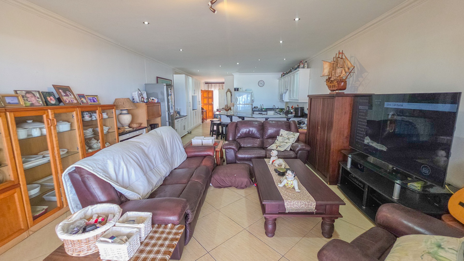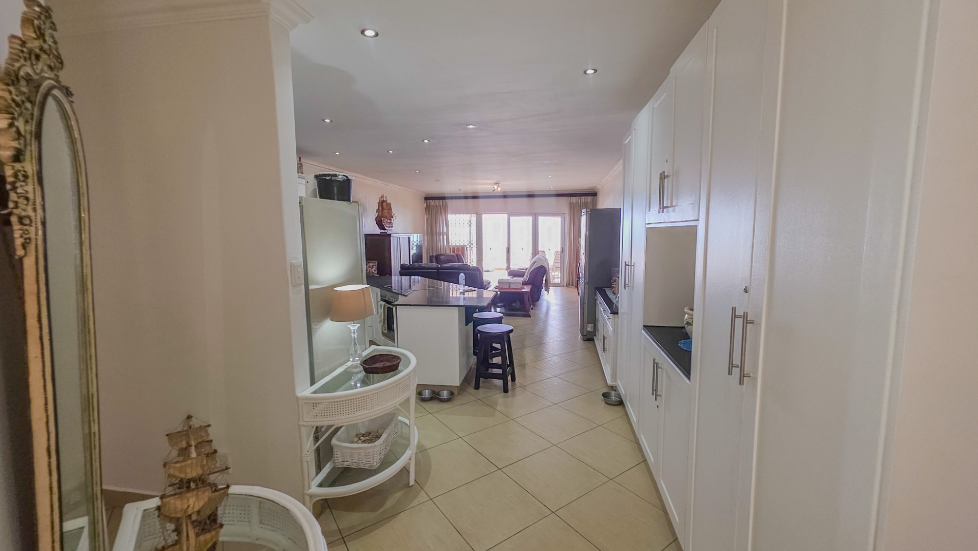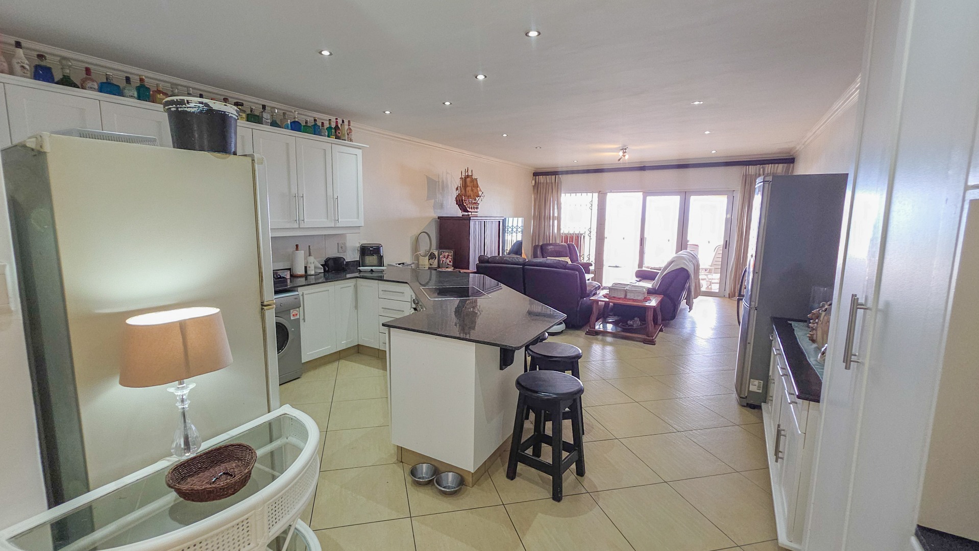Wake up to the sound of the waves in this 3-bedroom, 2-bathroom home offering 166 sqm of well-planned living space. The open-plan layout links the lounge, dining area, and kitchen, creating a natural flow for family life and entertaining. The kitchen is modern and practical, featuring crisp white cabinetry, dark granite countertops, a large island with integrated hob, tiled flooring throughout, recessed lighting, and space for integrated appliances, making daily living effortless.