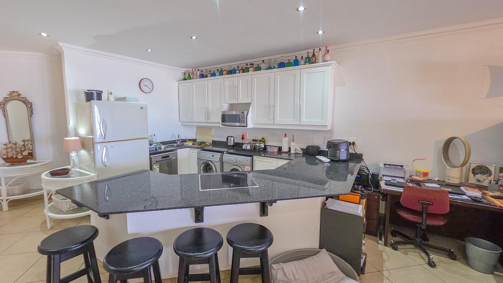Wake up to the sound of the waves in this 3-bedroom, 2-bathroom home offering 166 sqm of well-planned living space. The open-plan layout links the lounge, dining area, and kitchen, creating a natural flow for family life and entertaining. The kitchen is modern and practical, featuring crisp white cabinetry, dark granite countertops, a large island with integrated hob, tiled flooring throughout, recessed lighting, and space for integrated appliances, making daily living effortless.
