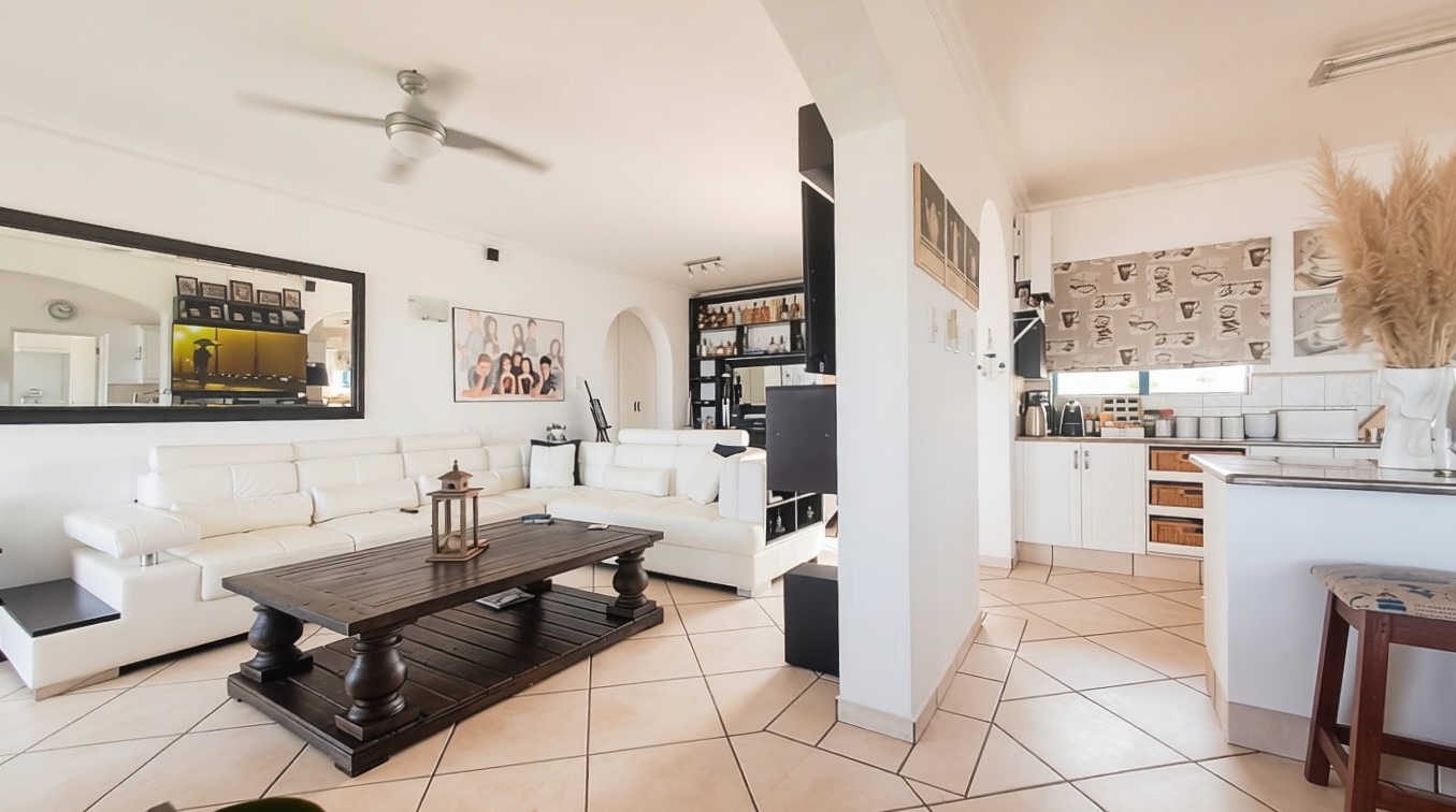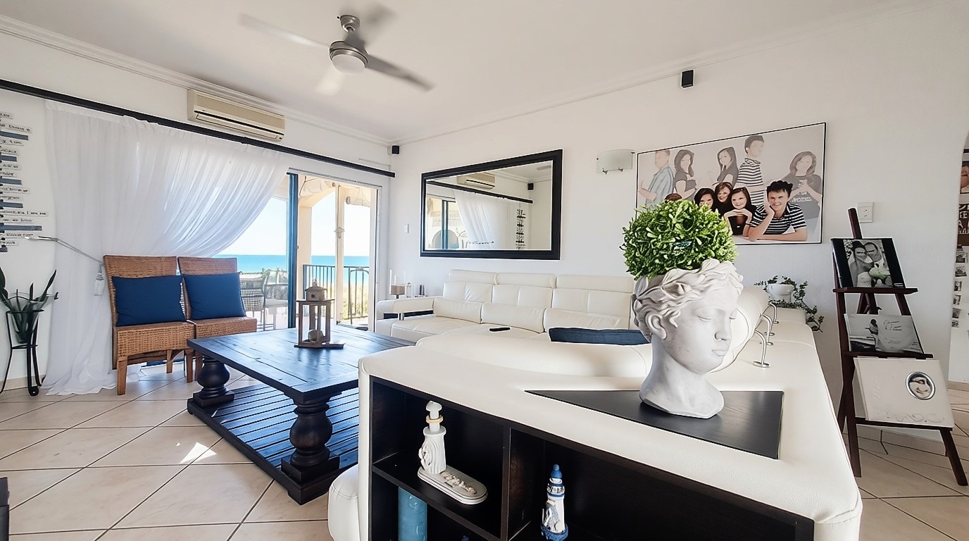 The spacious open-plan living area seamlessly combines the lounge, dining area, and well-appointed kitchen, creating a light-filled space ideal for both entertaining and everyday living. Large glass doors open onto a balcony where the breathtaking ocean views take centre stage, making it the perfect place to relax, entertain guests, or simply enjoy the tranquil coastal atmosphere.