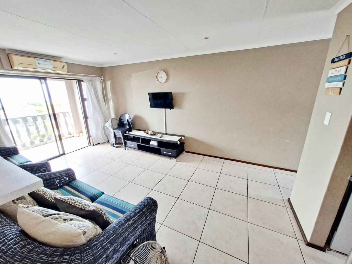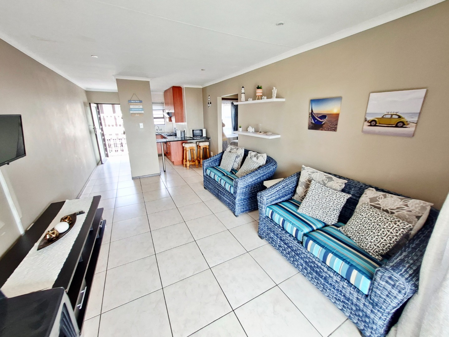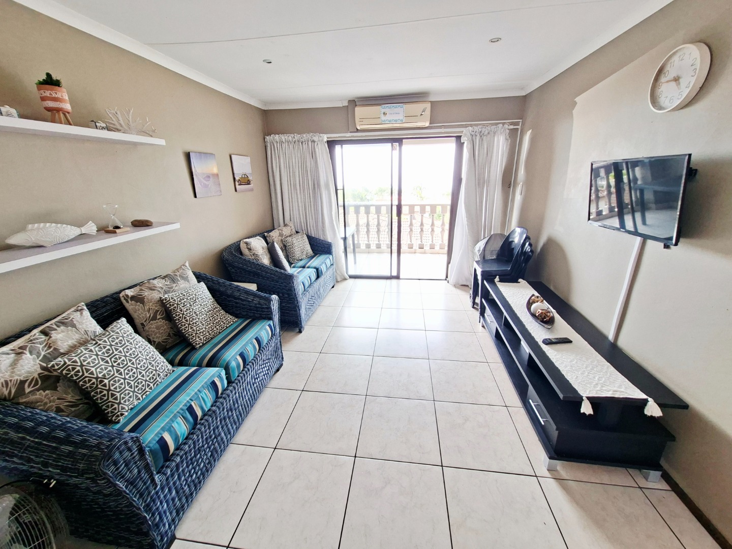 Discover this inviting 2-bedroom apartment, perfectly situated in a sought-after complex in Uvongo. Spanning 68.00 sqm, this furnished residence offers a comfortable coastal lifestyle, ideal as a permanent home or a holiday retreat. The open-plan living area, featuring clean white tiled flooring and light beige walls, creates a bright and airy atmosphere. Sliding doors seamlessly connect the lounge to a private balcony, where you can enjoy abundant natural light and panoramic sea views.