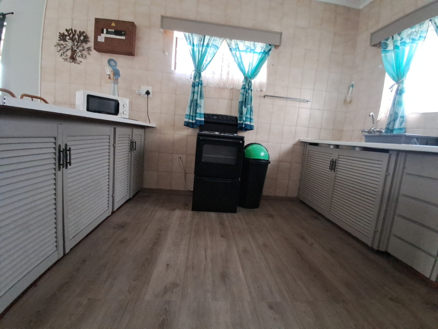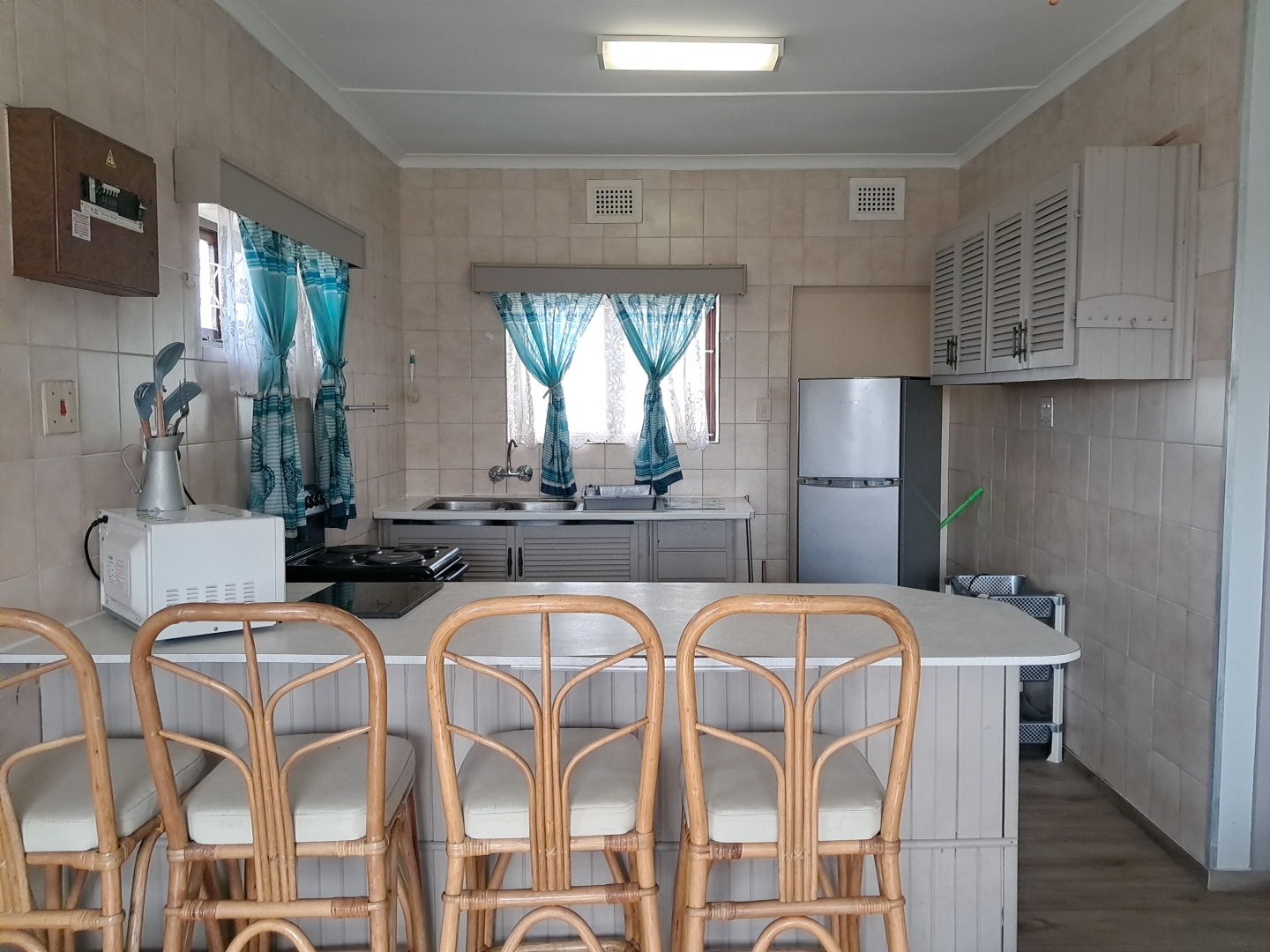 The kitchen is equipped with ample storage in light grey louvered cabinetry and a convenient breakfast bar.