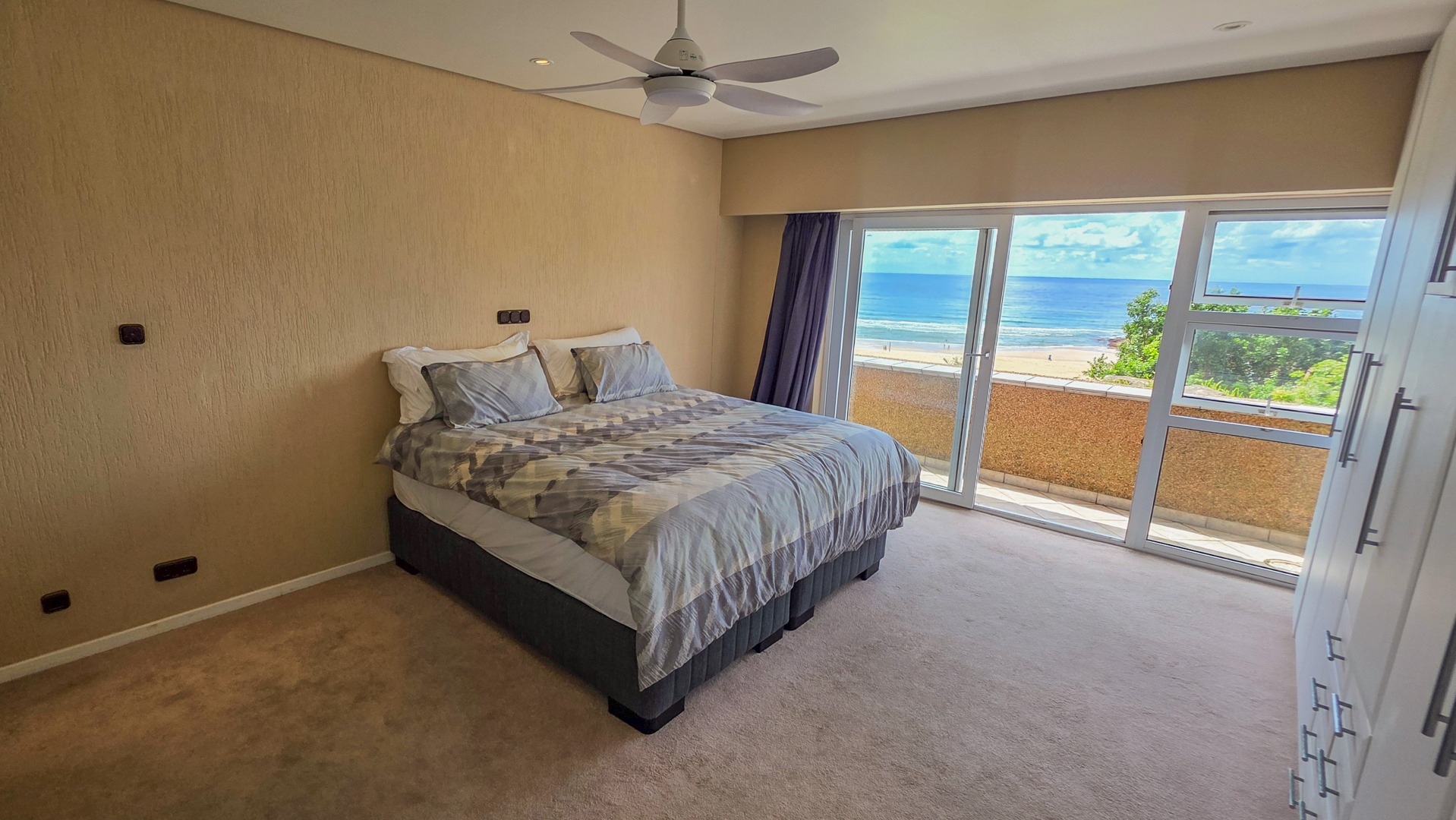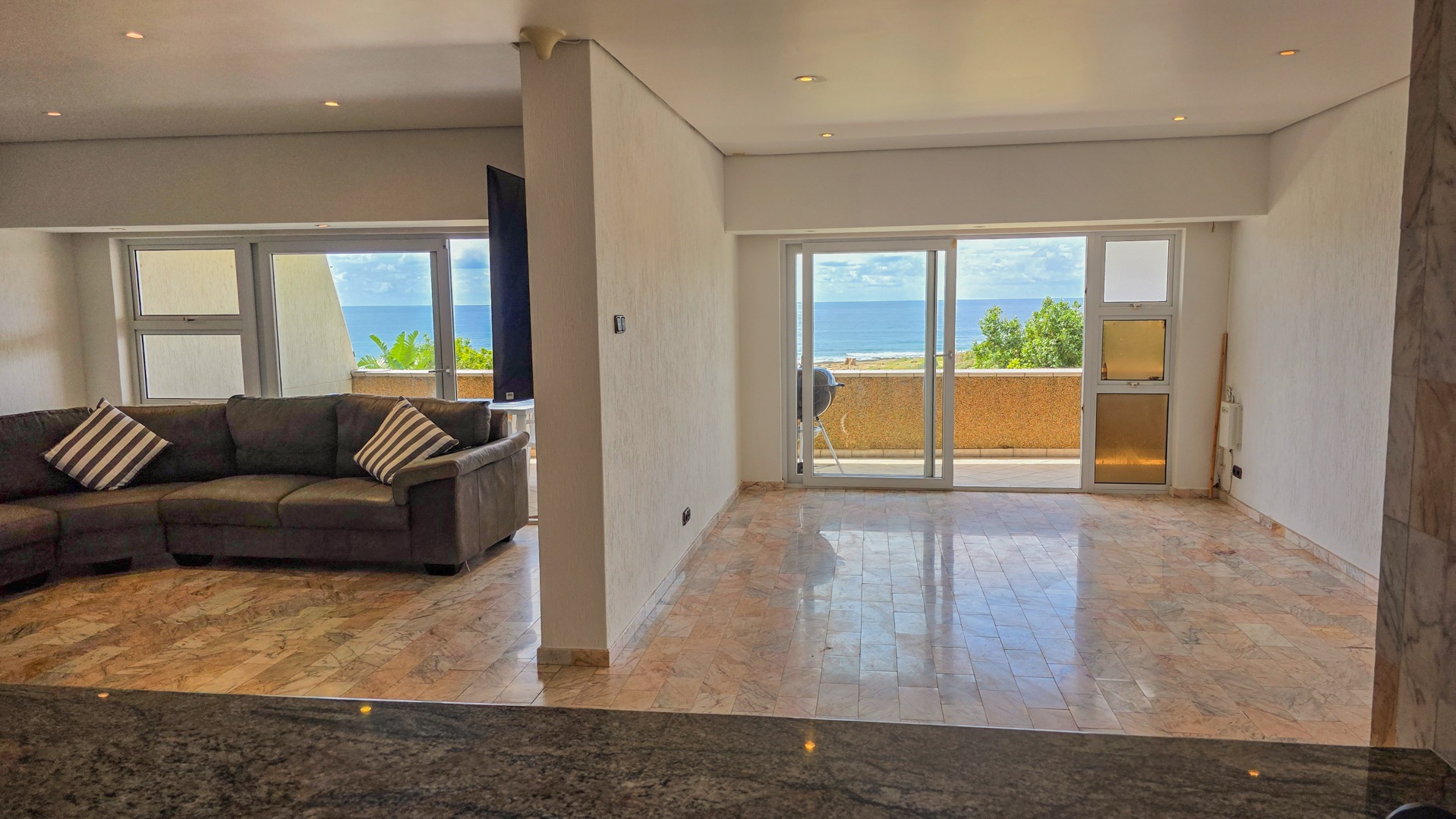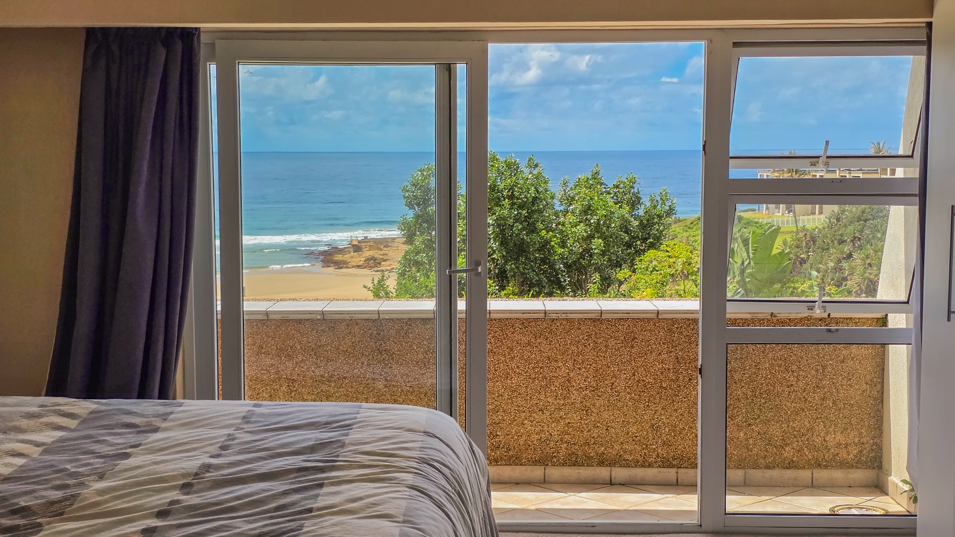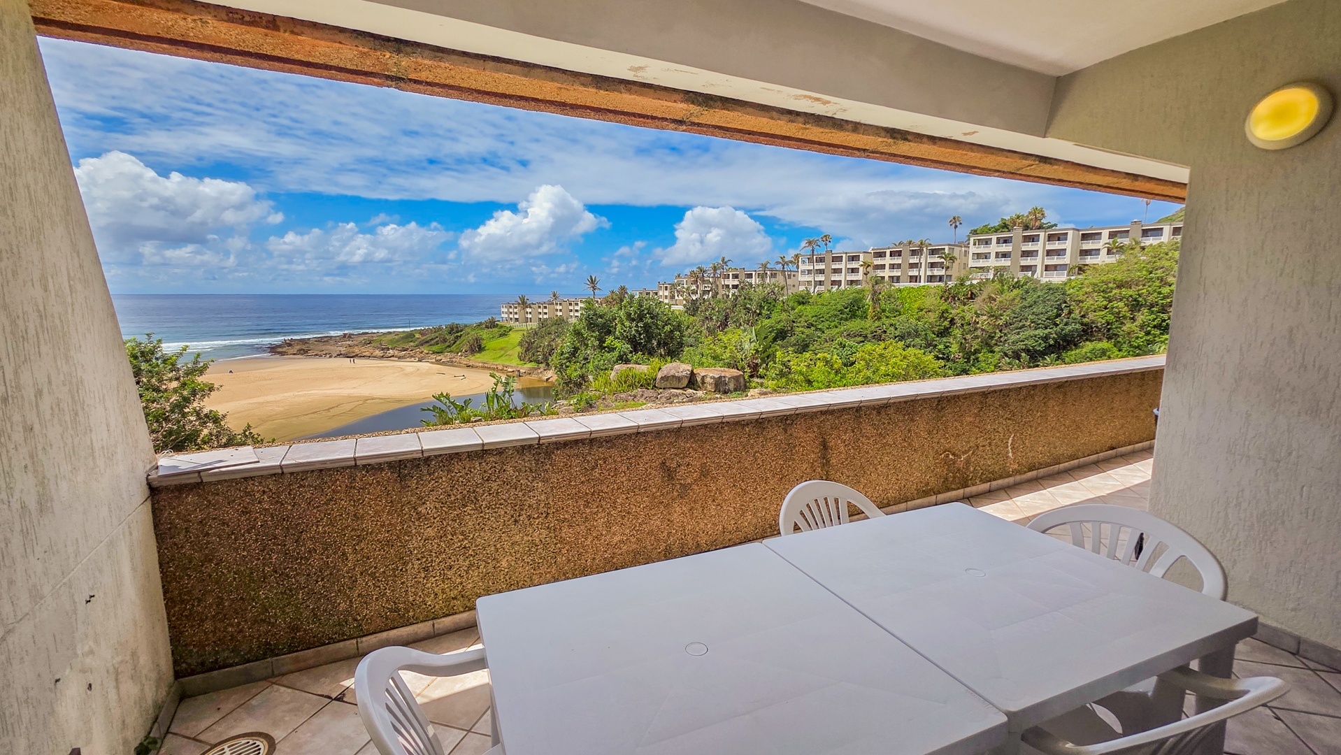 The ground-floor apartment is a showcase of coastal elegance. The open-plan kitchen, dining, and lounge areas flow onto a spacious patio with sweeping views over Uvongo Beach. The main bedroom shares this view and includes a full en suite bathroom. Two additional bedrooms feature built-in cupboards and soft carpeting, while a private study offers space for remote work or quiet moments. A second full bathroom and guest toilet complete the layout.