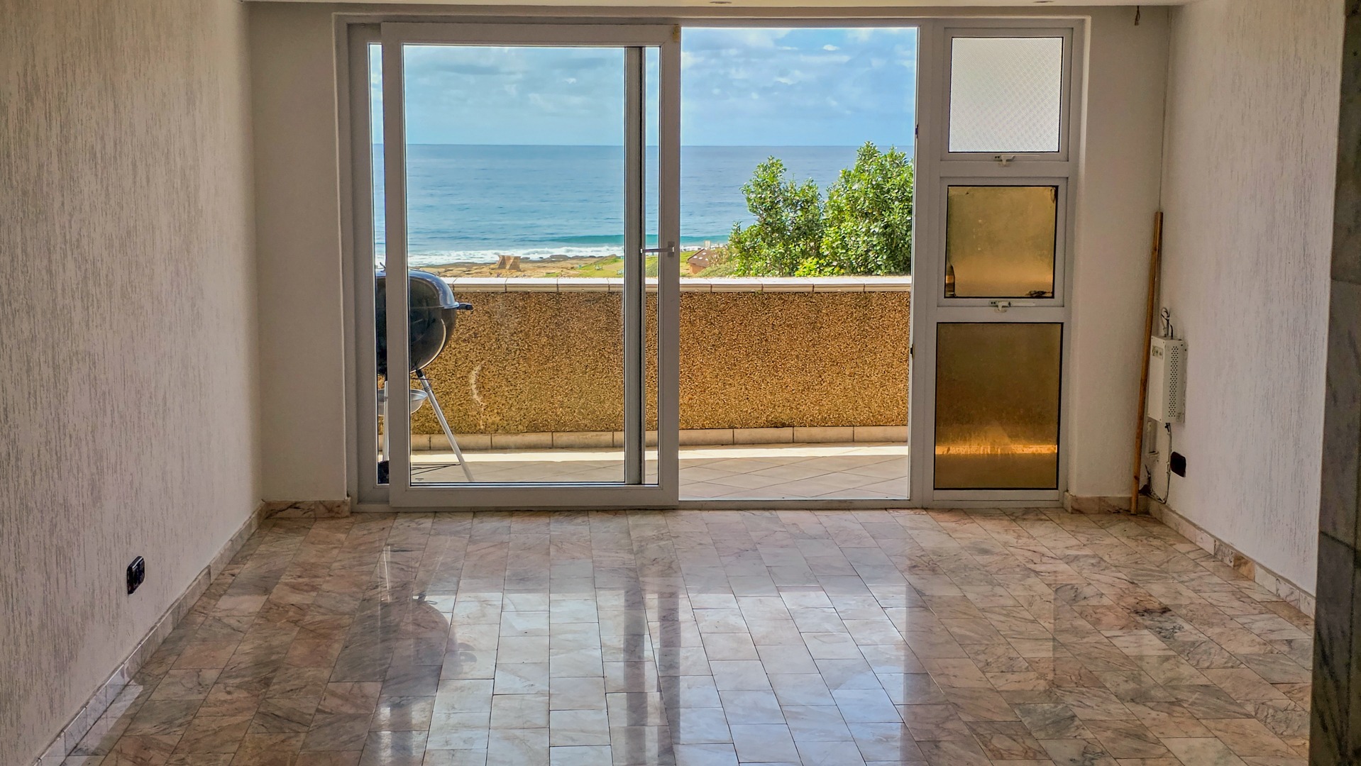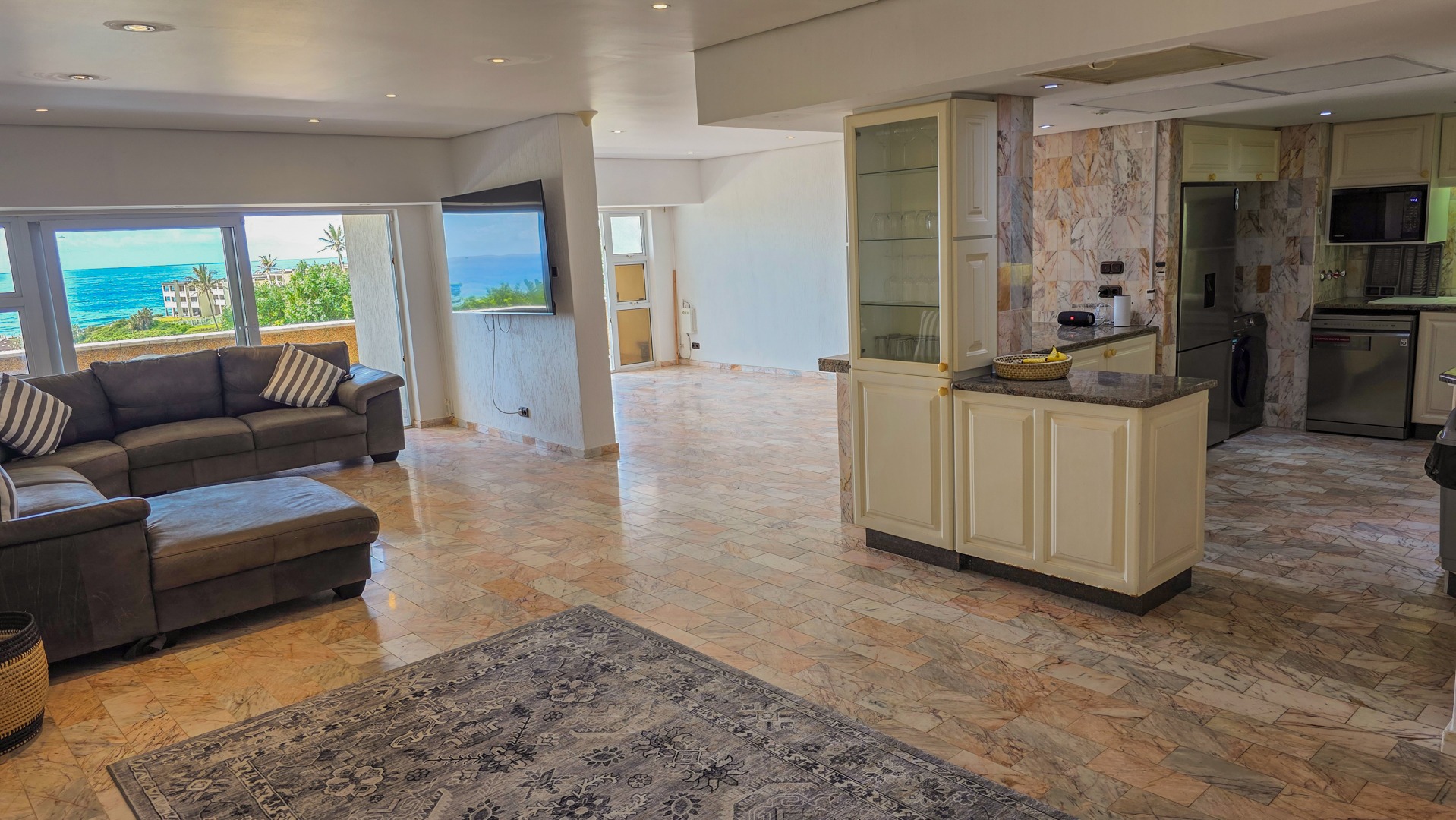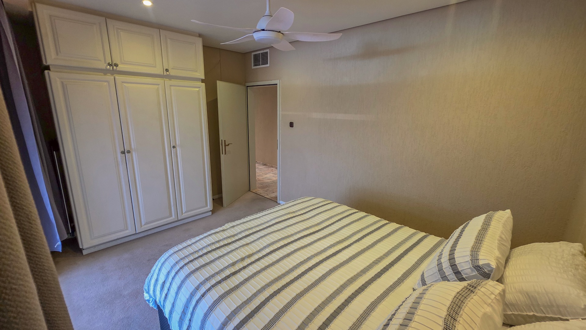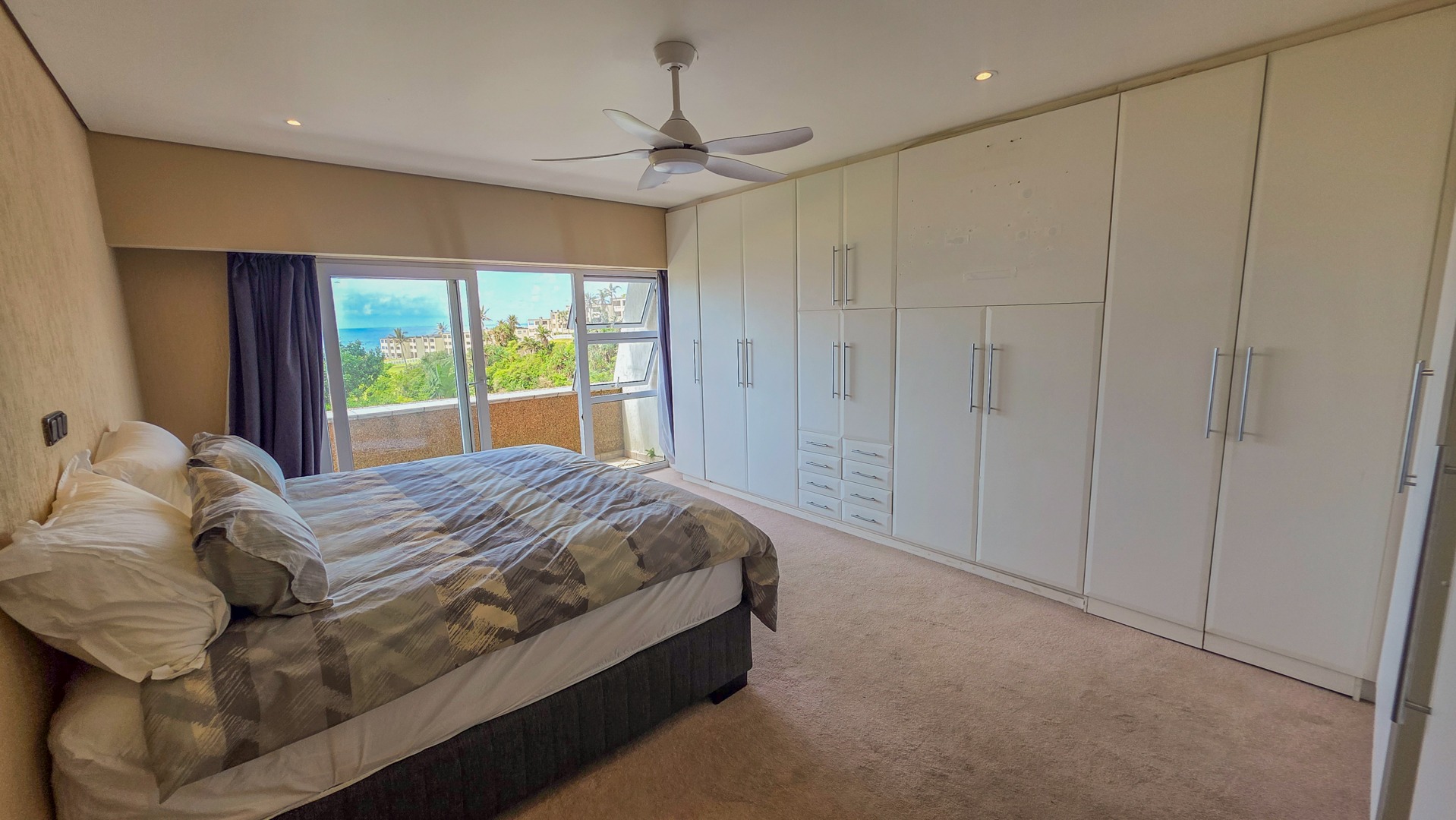 The ground-floor apartment is a showcase of coastal elegance. The open-plan kitchen, dining, and lounge areas flow onto a spacious patio with sweeping views over Uvongo Beach. The main bedroom shares this view and includes a full en suite bathroom. Two additional bedrooms feature built-in cupboards and soft carpeting, while a private study offers space for remote work or quiet moments. A second full bathroom and guest toilet complete the layout.
