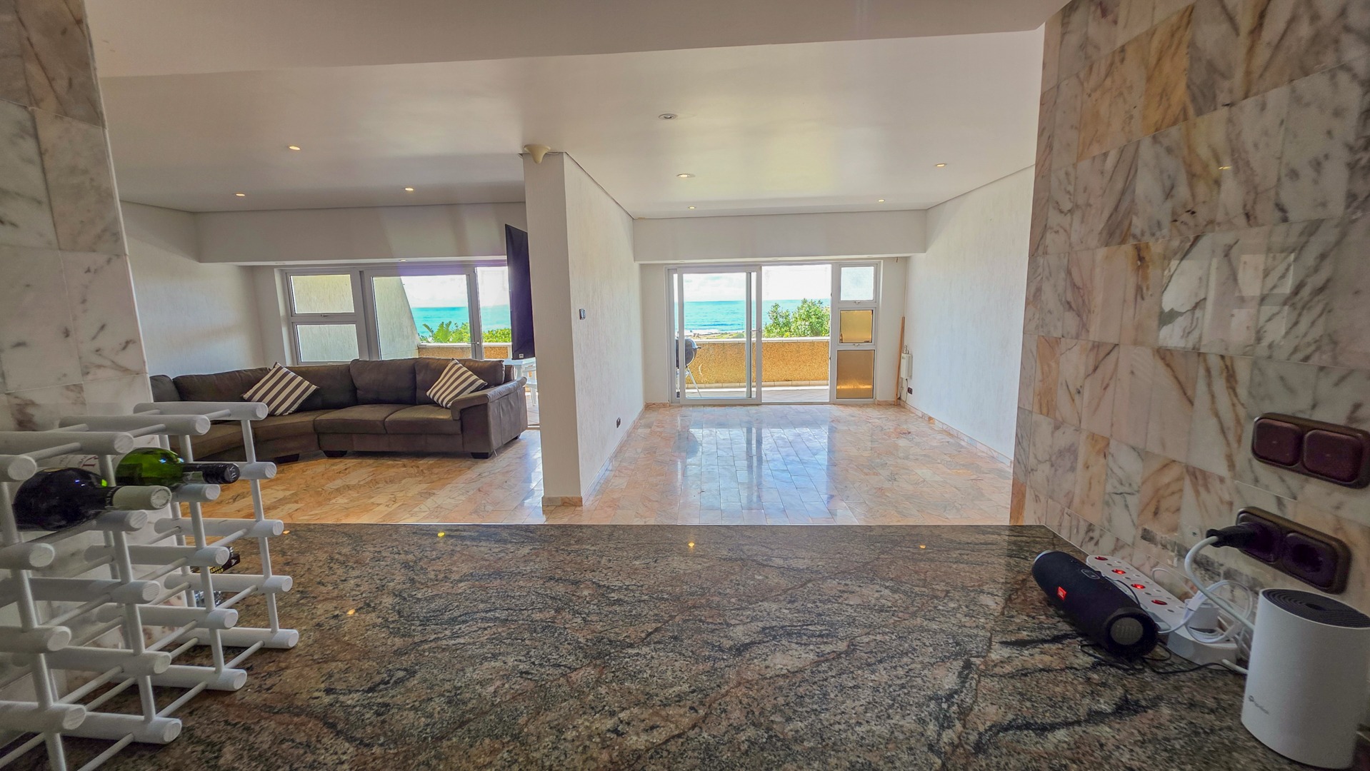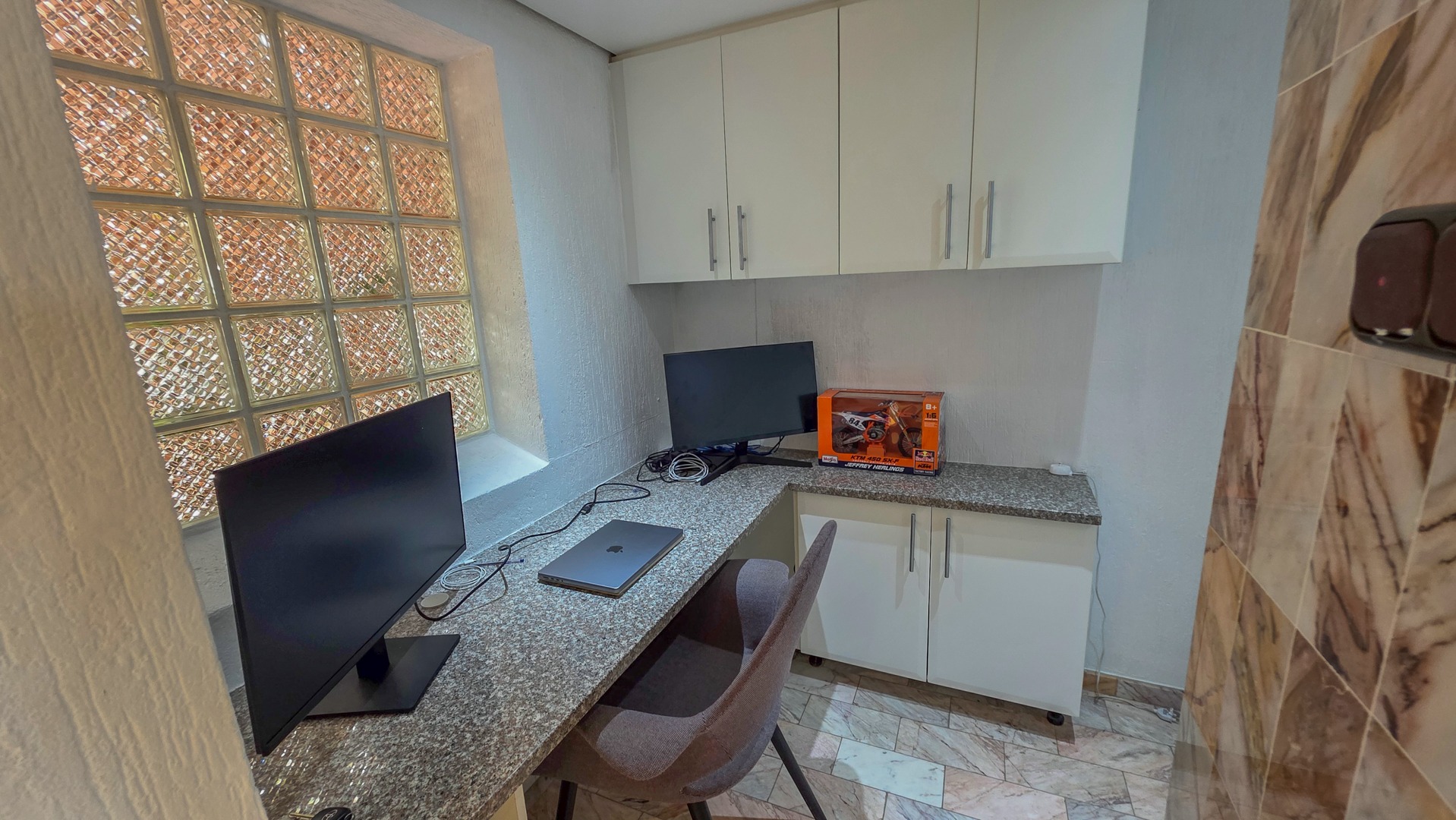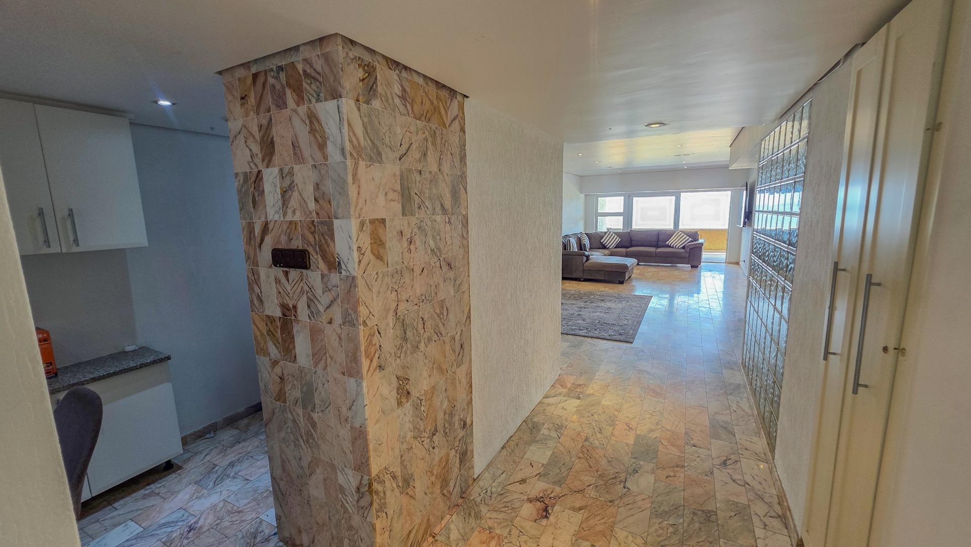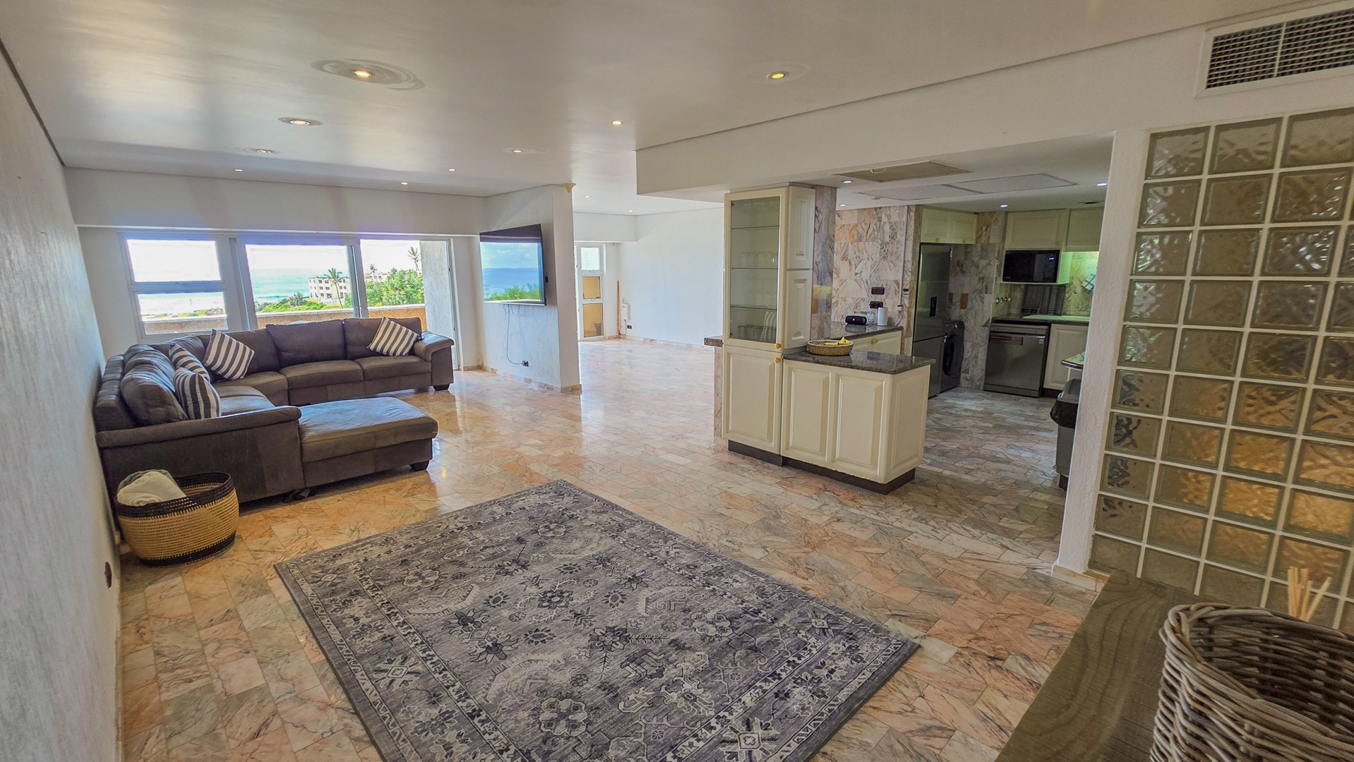 The ground-floor apartment is a showcase of coastal elegance. The open-plan kitchen, dining, and lounge areas flow onto a spacious patio with sweeping views over Uvongo Beach. The main bedroom shares this view and includes a full en suite bathroom. Two additional bedrooms feature built-in cupboards and soft carpeting, while a private study offers space for remote work or quiet moments. A second full bathroom and guest toilet complete the layout.