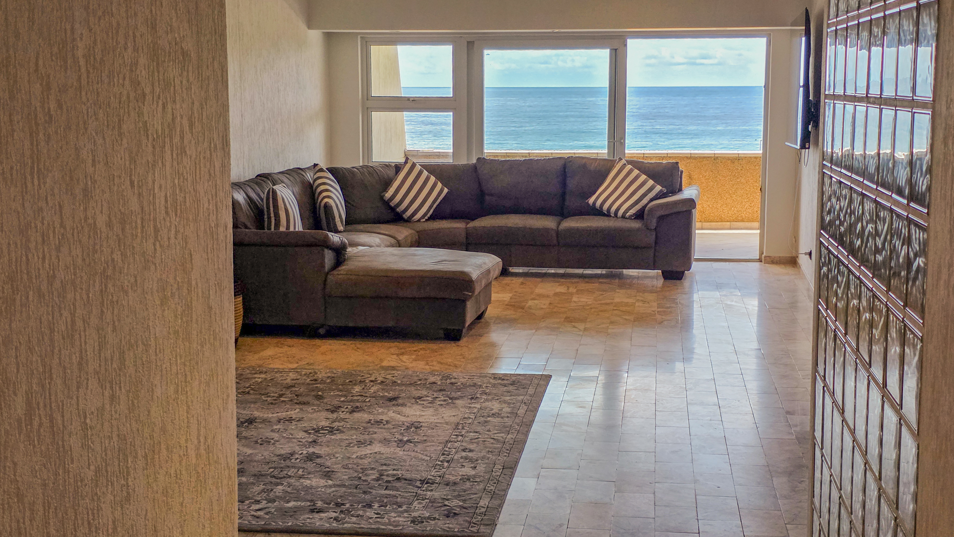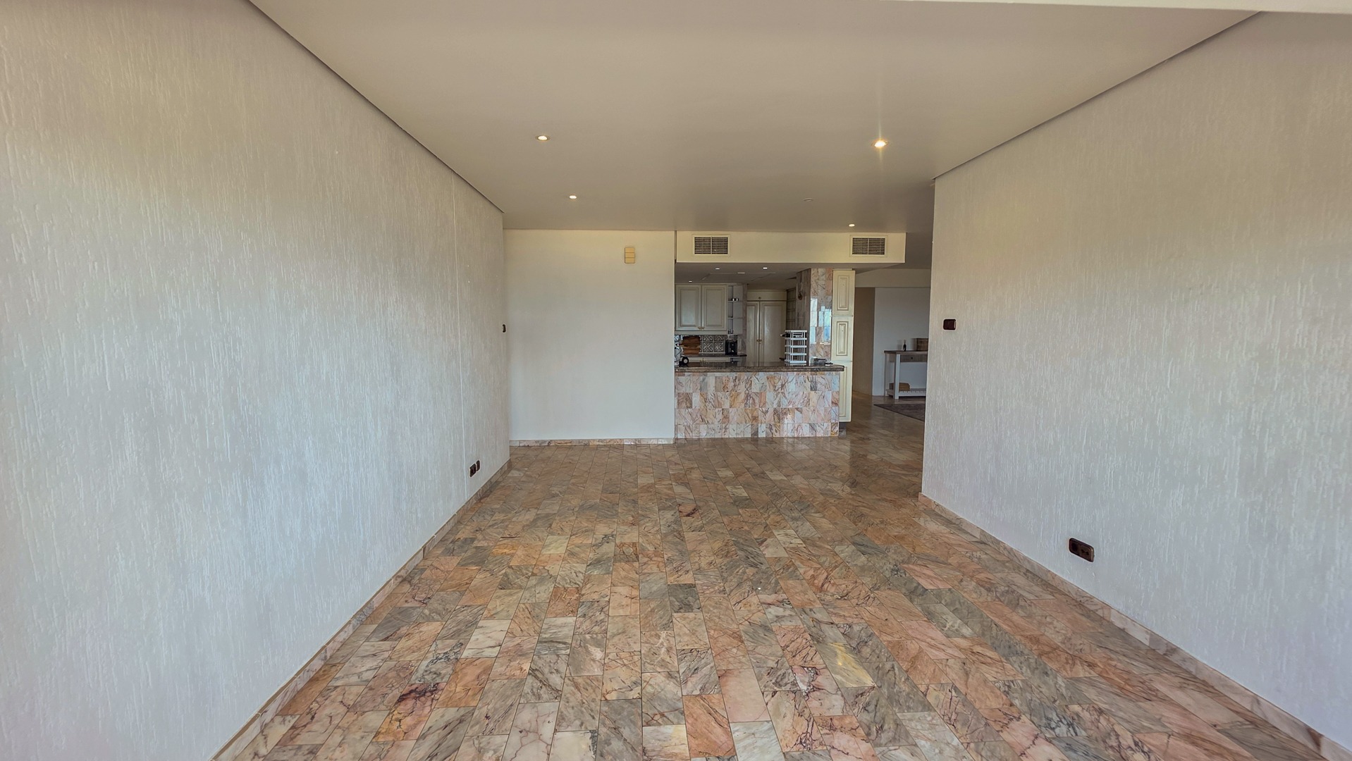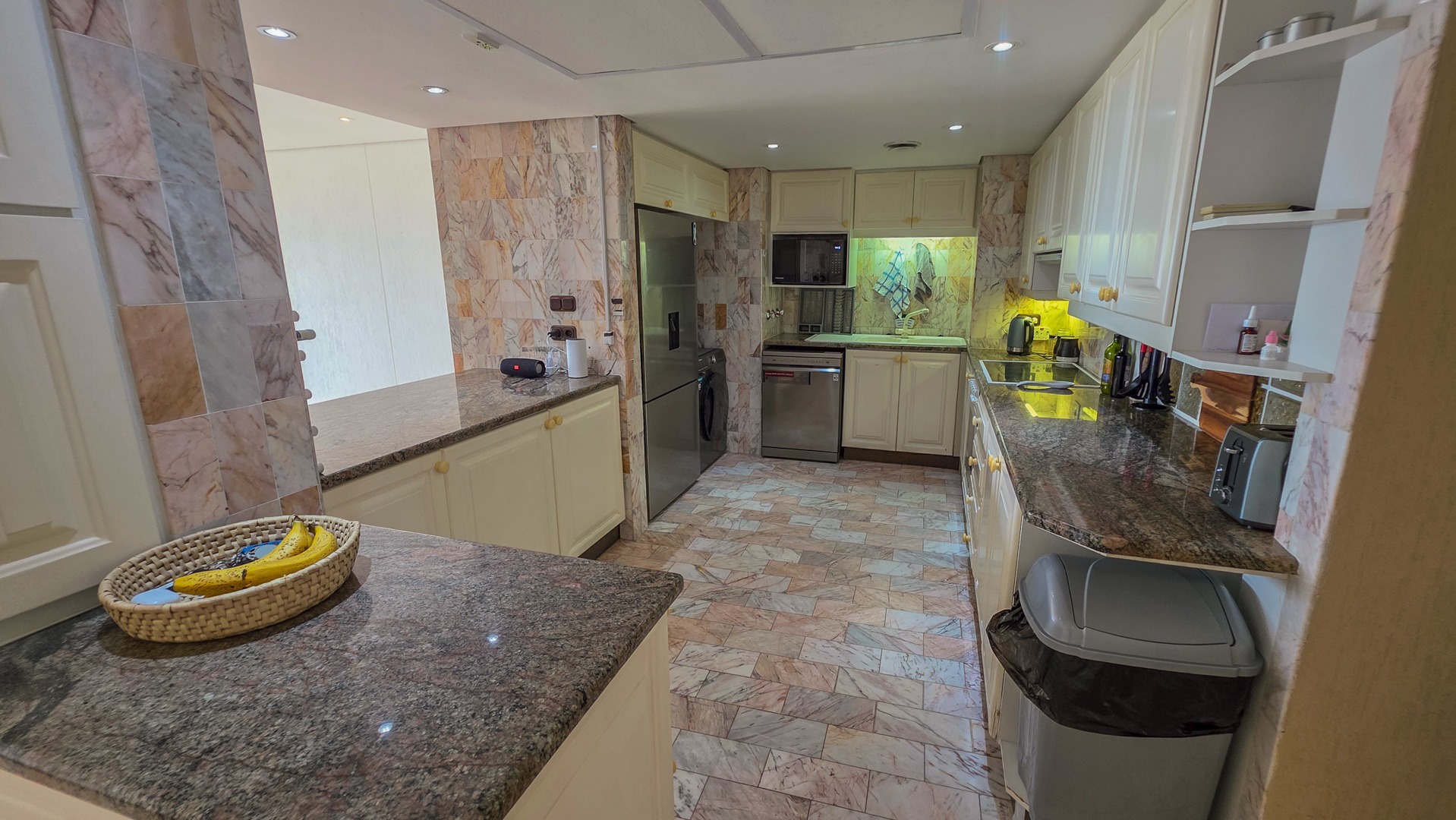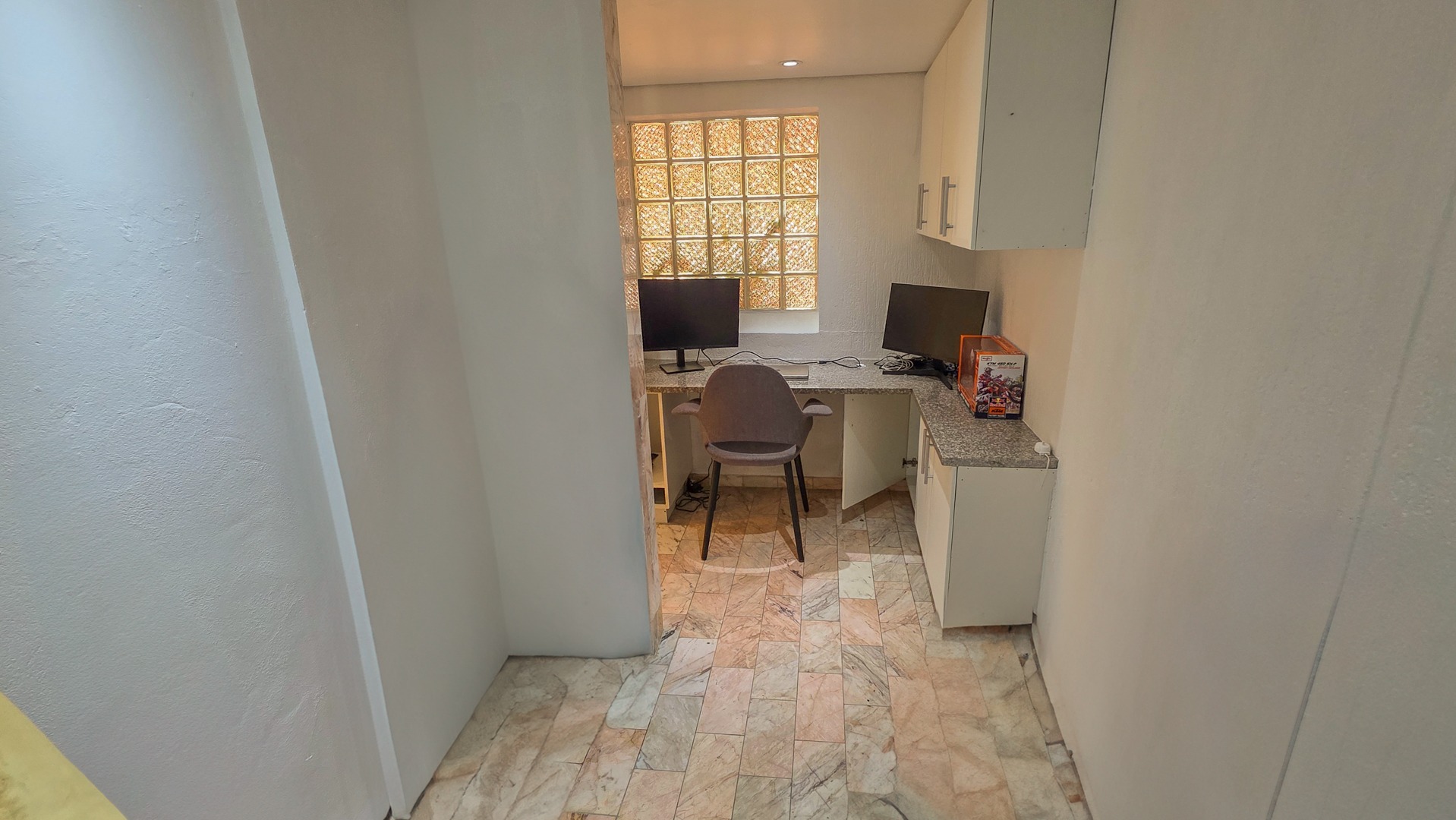 The ground-floor apartment is a showcase of coastal elegance. The open-plan kitchen, dining, and lounge areas flow onto a spacious patio with sweeping views over Uvongo Beach. The main bedroom shares this view and includes a full en suite bathroom. Two additional bedrooms feature built-in cupboards and soft carpeting, while a private study offers space for remote work or quiet moments. A second full bathroom and guest toilet complete the layout.