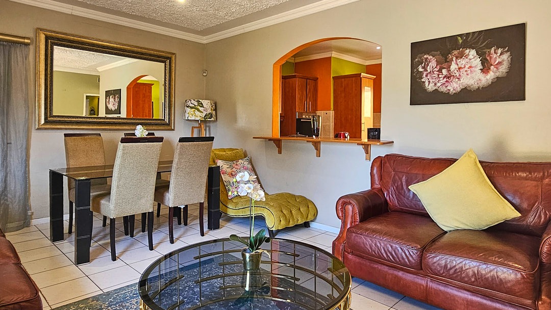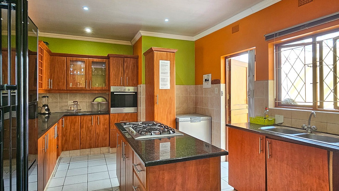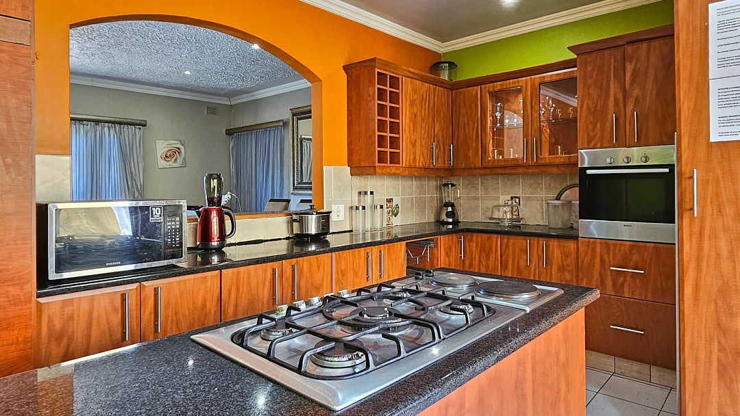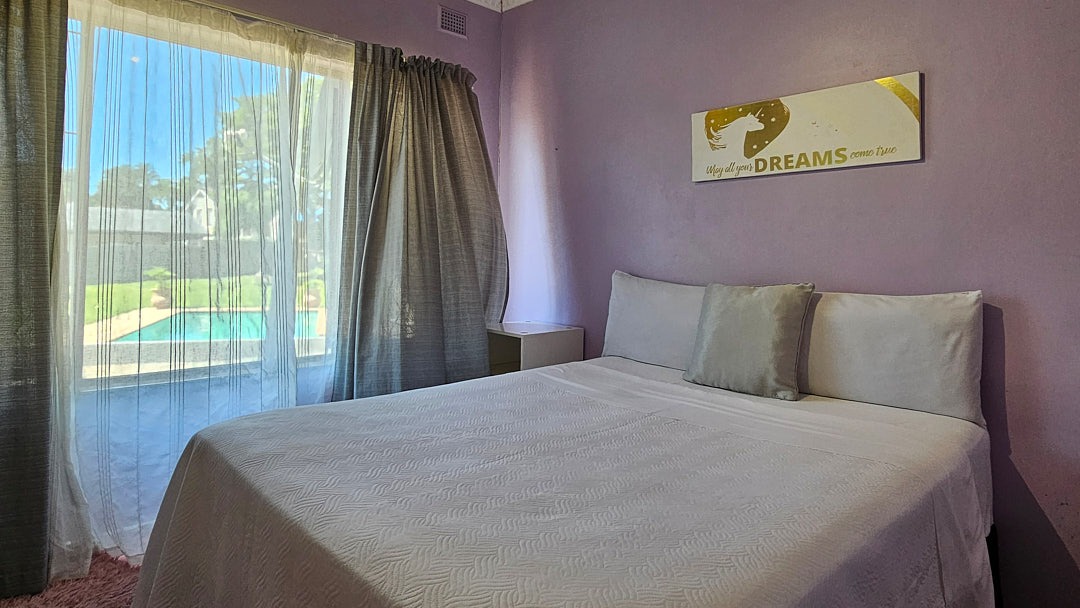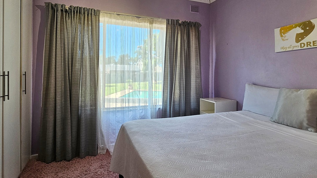 This is a welcoming, happy family house with a large pool, garden for kids and a flatlet. As you enter the front door, the semi-open plan kitchen is on your right. The kitchen is spacious, modern and light with lots of cupboard space. It is colorful and inspirational to inspire the chef, and has a gas hob in a smart kitchen island that adds a touch of sophistication to the house. It has a back door that opens to an enclosed quart yard. Here you can hang your washing even on rainy days. Currently it is utilized as a home gym and has an extra toilet. What makes the kitchen open plan to the living and dining area is a huge serving hub. This ensure that the cook can be part of the company whilst cooking. The living/ dining room area is spacious and natural light brightens the whole house. This area of the house has a natural welcoming, warm and happy vibe to it, waiting for new owners to make it theirs. The lounge opens with sliding doors to welcome the garden RIGHT INTO YOUR HOME!! The large sprawling lawn encircles a sparkling blue pool, that is waiting to be enjoyed by all.