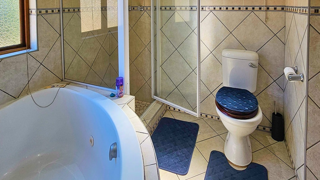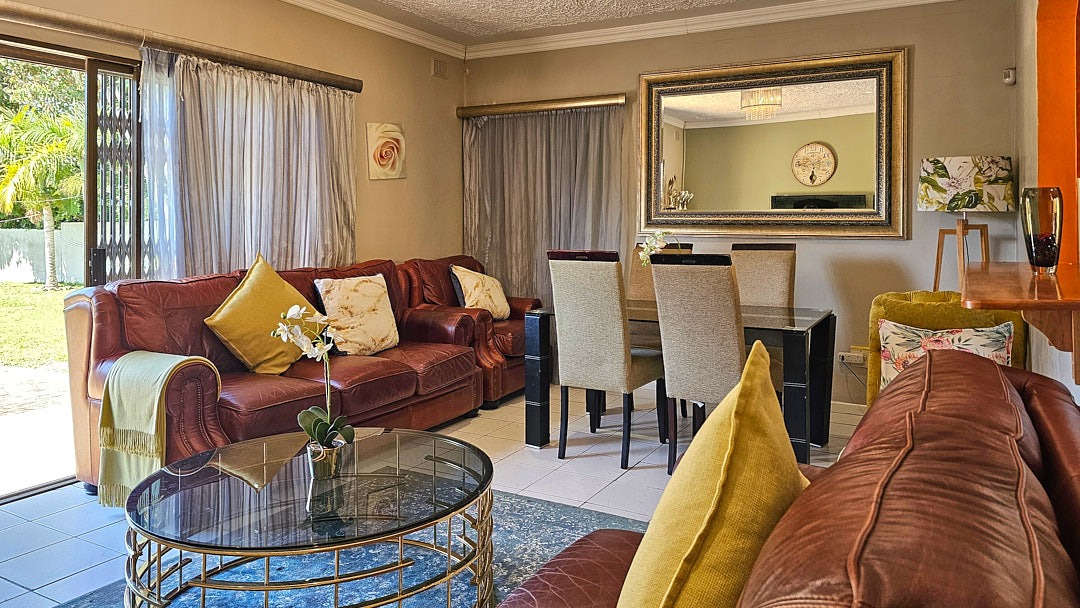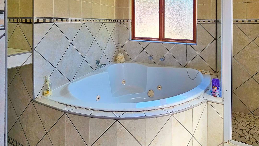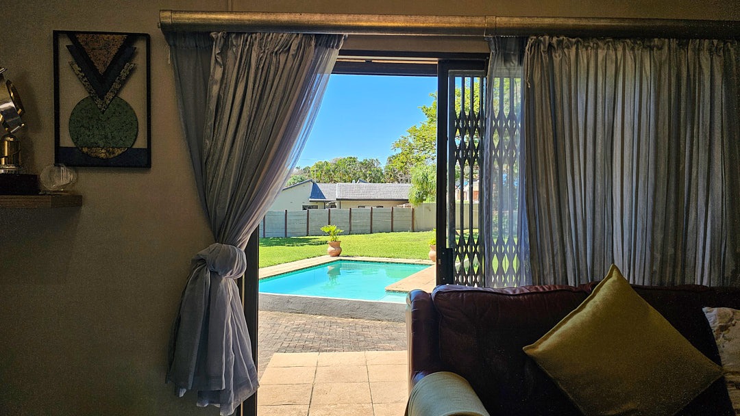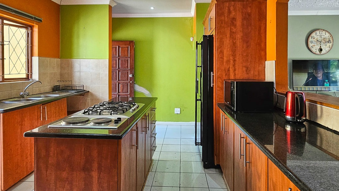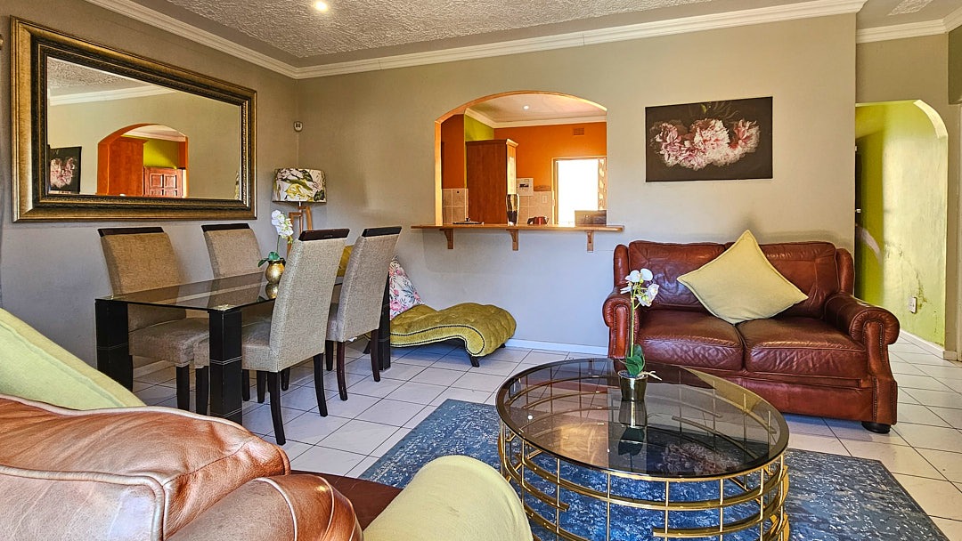 This is a welcoming, happy family house with a large pool, garden for kids and a flatlet. As you enter the front door, the semi-open plan kitchen is on your right. The kitchen is spacious, modern and light with lots of cupboard space. It is colorful and inspirational to inspire the chef, and has a gas hob in a smart kitchen island that adds a touch of sophistication to the house. It has a back door that opens to an enclosed quart yard. Here you can hang your washing even on rainy days. Currently it is utilized as a home gym and has an extra toilet. What makes the kitchen open plan to the living and dining area is a huge serving hub. This ensure that the cook can be part of the company whilst cooking. The living/ dining room area is spacious and natural light brightens the whole house. This area of the house has a natural welcoming, warm and happy vibe to it, waiting for new owners to make it theirs. The lounge opens with sliding doors to welcome the garden RIGHT INTO YOUR HOME!! The large sprawling lawn encircles a sparkling blue pool, that is waiting to be enjoyed by all.
