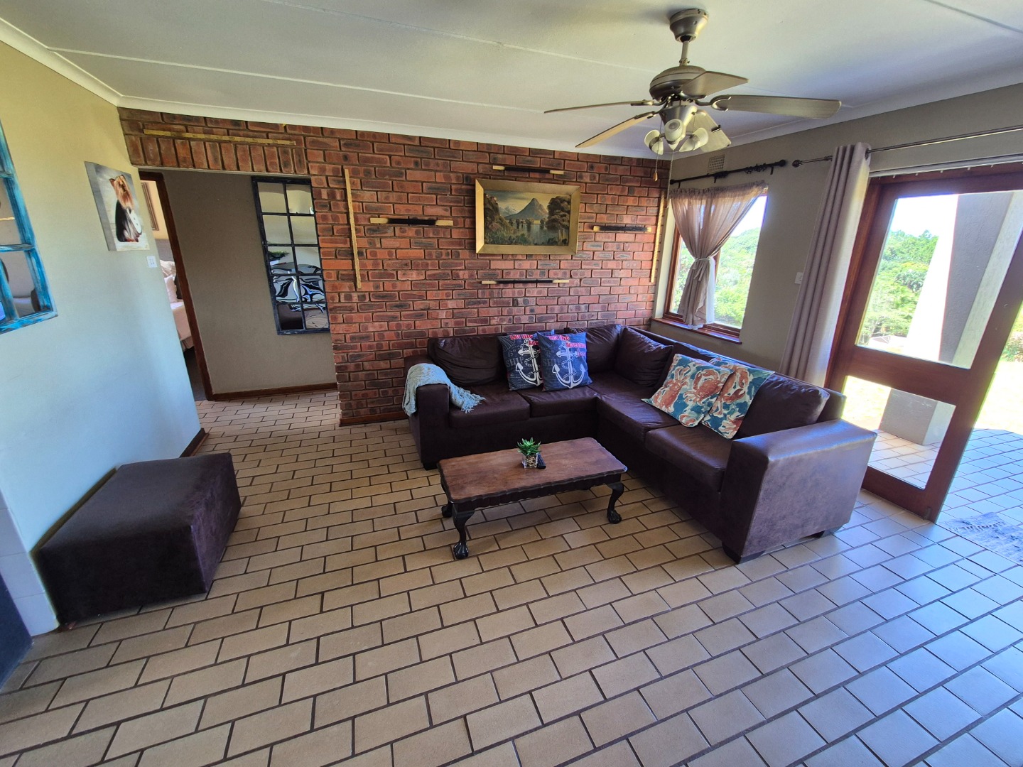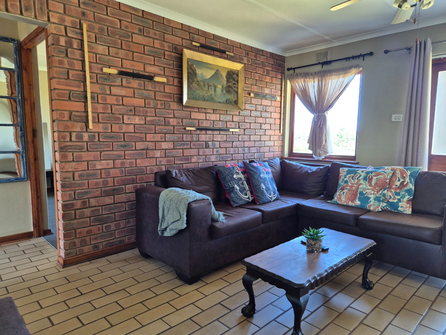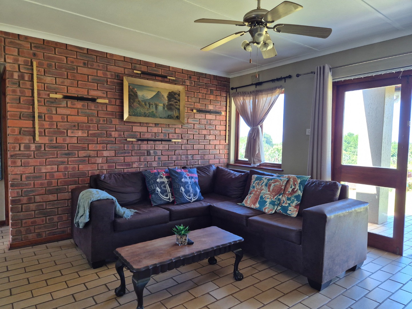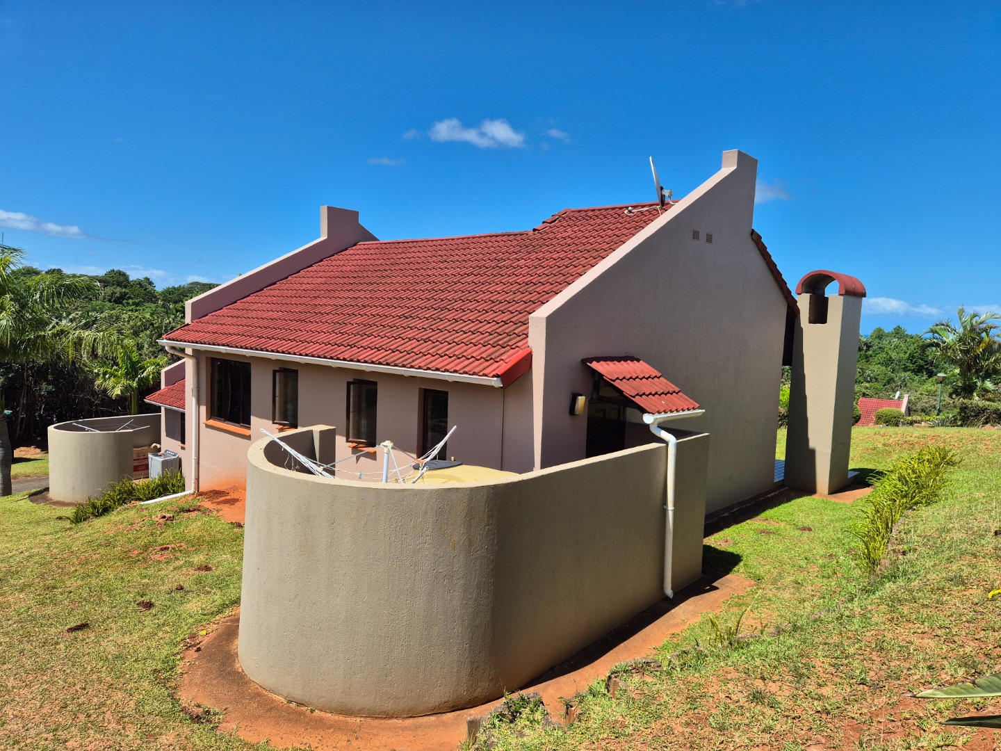 The home features open-plan living, a functional kitchen with a breakfast bar, and a private covered patio with built-in braai and scenic sea views. A semi-enclosed courtyard with water tanks and pump enhances water security, while a dedicated covered parking bay adds convenience.