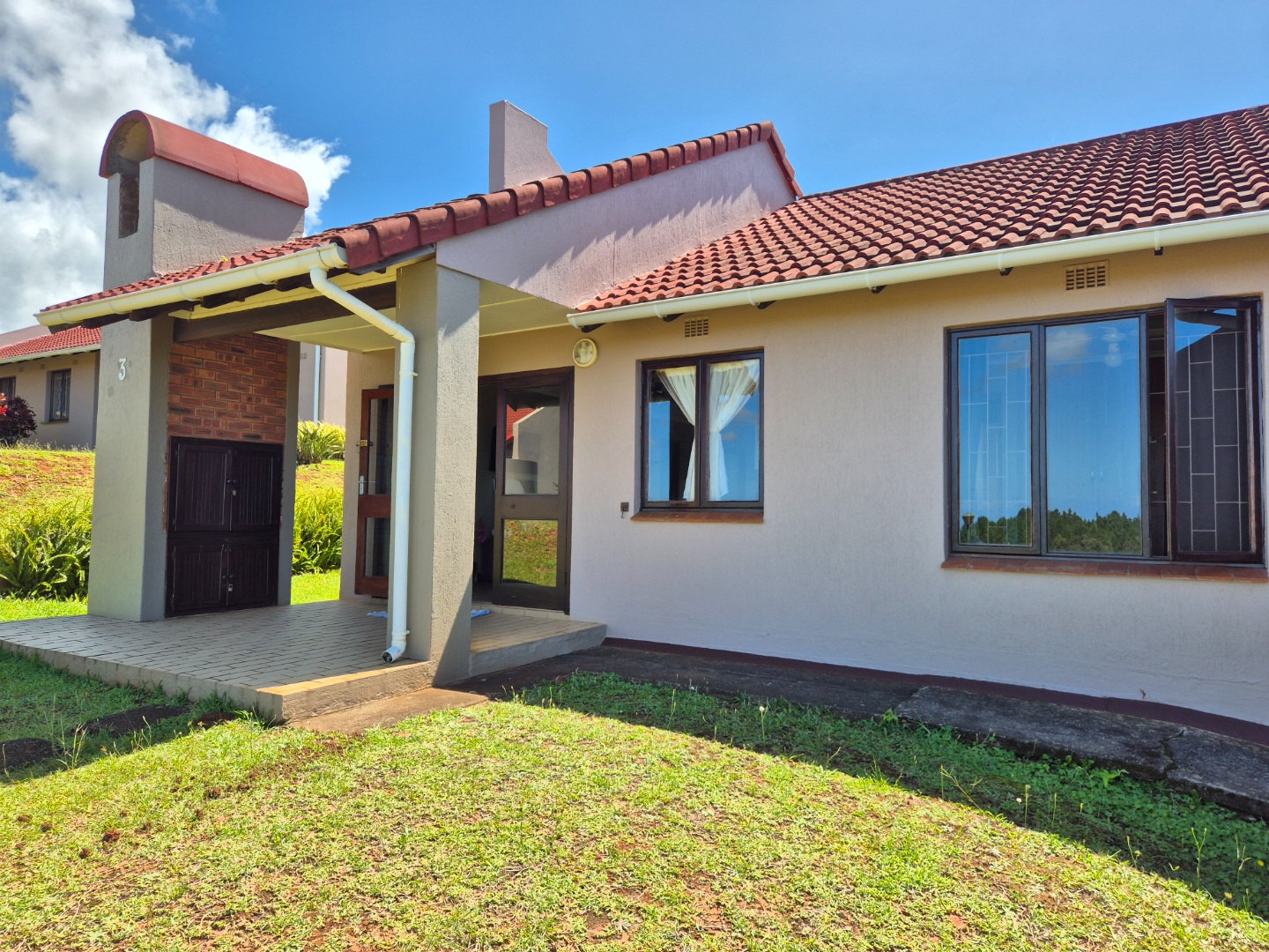 The home features open-plan living, a functional kitchen with a breakfast bar, and a private covered patio with built-in braai and scenic sea views. A semi-enclosed courtyard with water tanks and pump enhances water security, while a dedicated covered parking bay adds convenience.