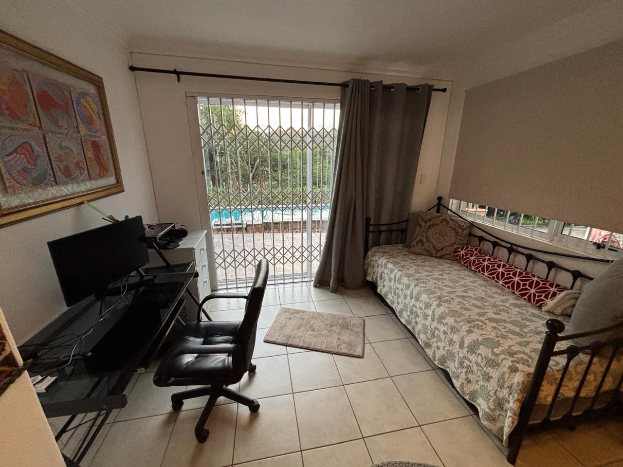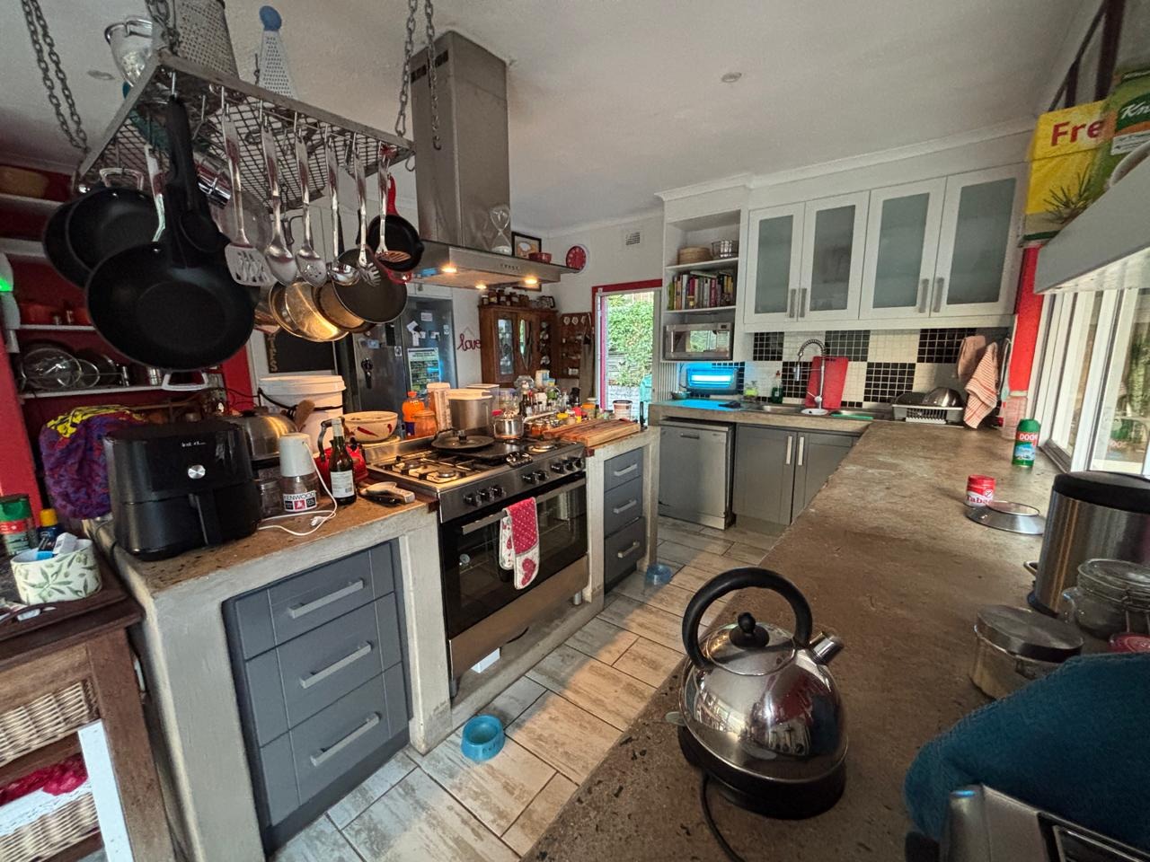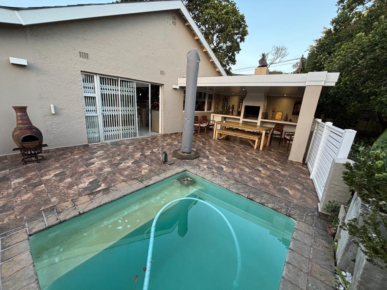 The functional kitchen is equipped with a large island, gas hob, and ample concrete counter space, perfect for culinary enthusiasts. The residence comprises three comfortable bedrooms and two bathrooms, including one ensuite, providing ample space for family living. Enjoy outdoor leisure with a sparkling swimming pool set amidst the private garden, complemented by a built-in braai for entertaining. A balcony offers sea views, enhancing the coastal experience.